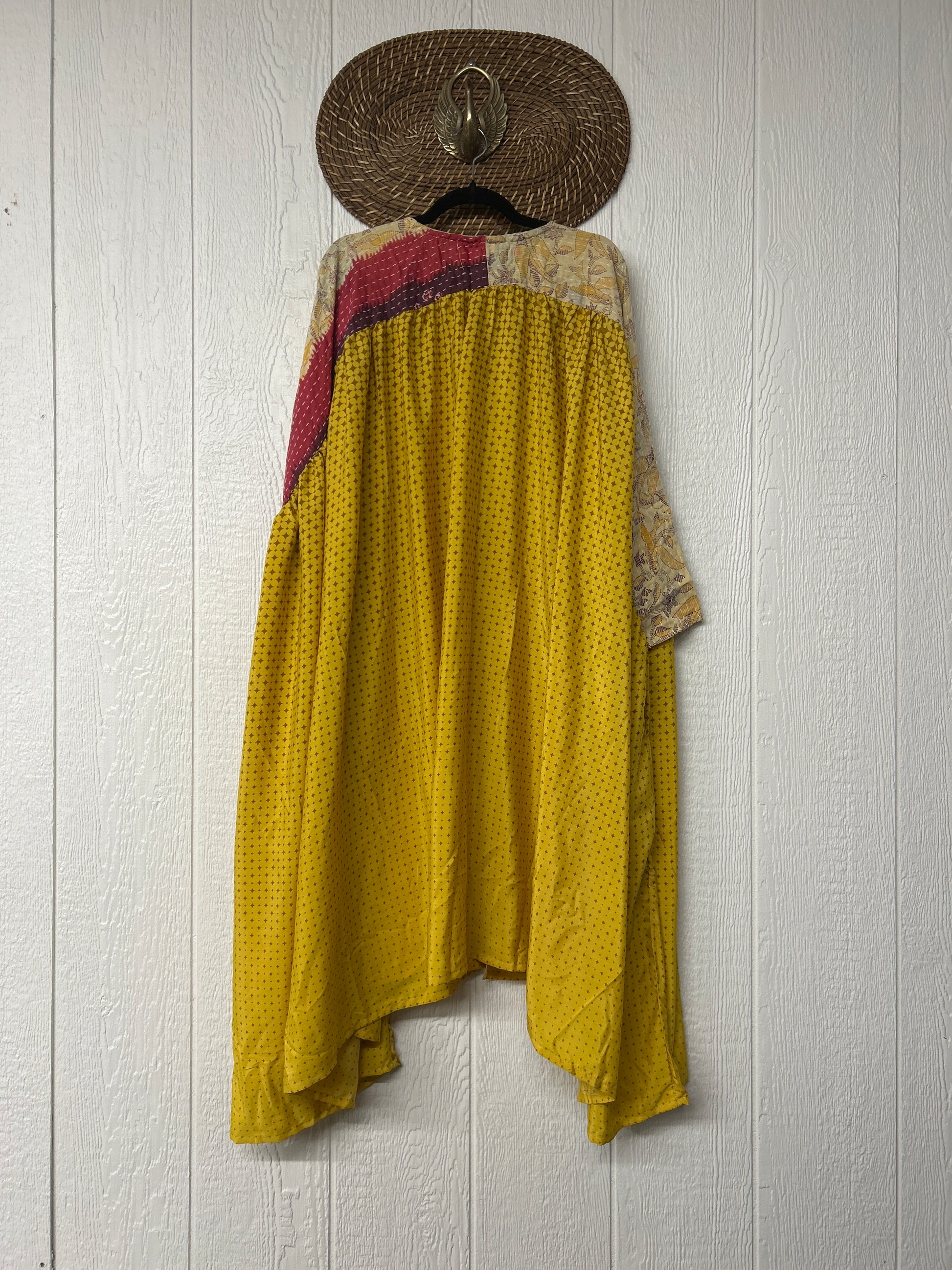 Our vintage styles have lived a full life before becoming the designs in our shop. Fabrics may have small threads or holes in the layers. Color inconsistency or small stains may be present. The saris are sewn together and extend the life of each design. Imperfections should be celebrated.