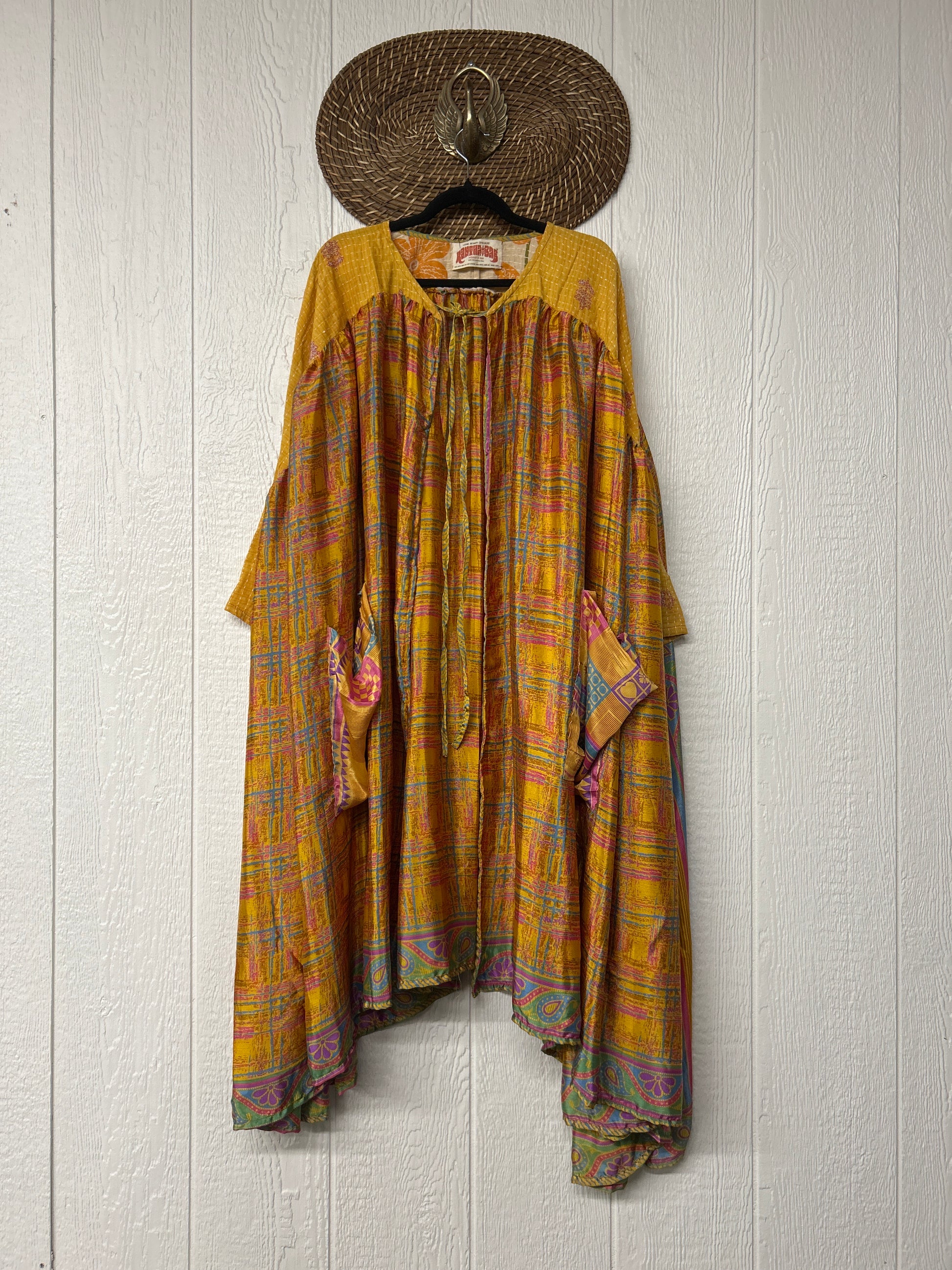 Twirl around to your heart's delight in our new Fleetwood Kimono. This floaty dream is a divine mix of our ultra lux Kantha embroidered vintage cotton and rasgulla sari. Features a tie neck closure and slouchy exterior pockets.