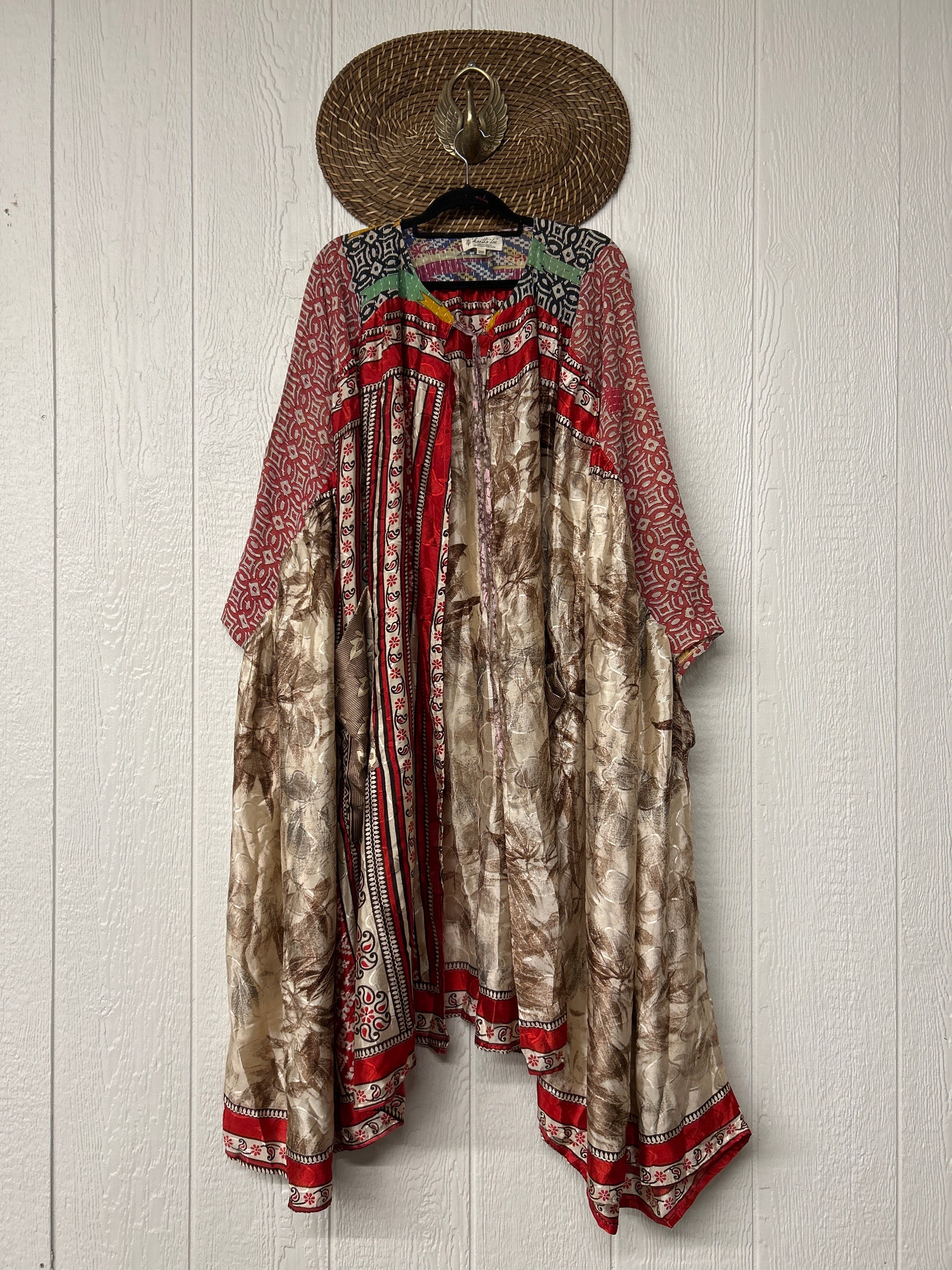 Twirl around to your heart's delight in our new Fleetwood Kimono. This floaty dream is a divine mix of our ultra lux Kantha embroidered vintage cotton and rasgulla sari. Features a tie neck closure and slouchy exterior pockets.
