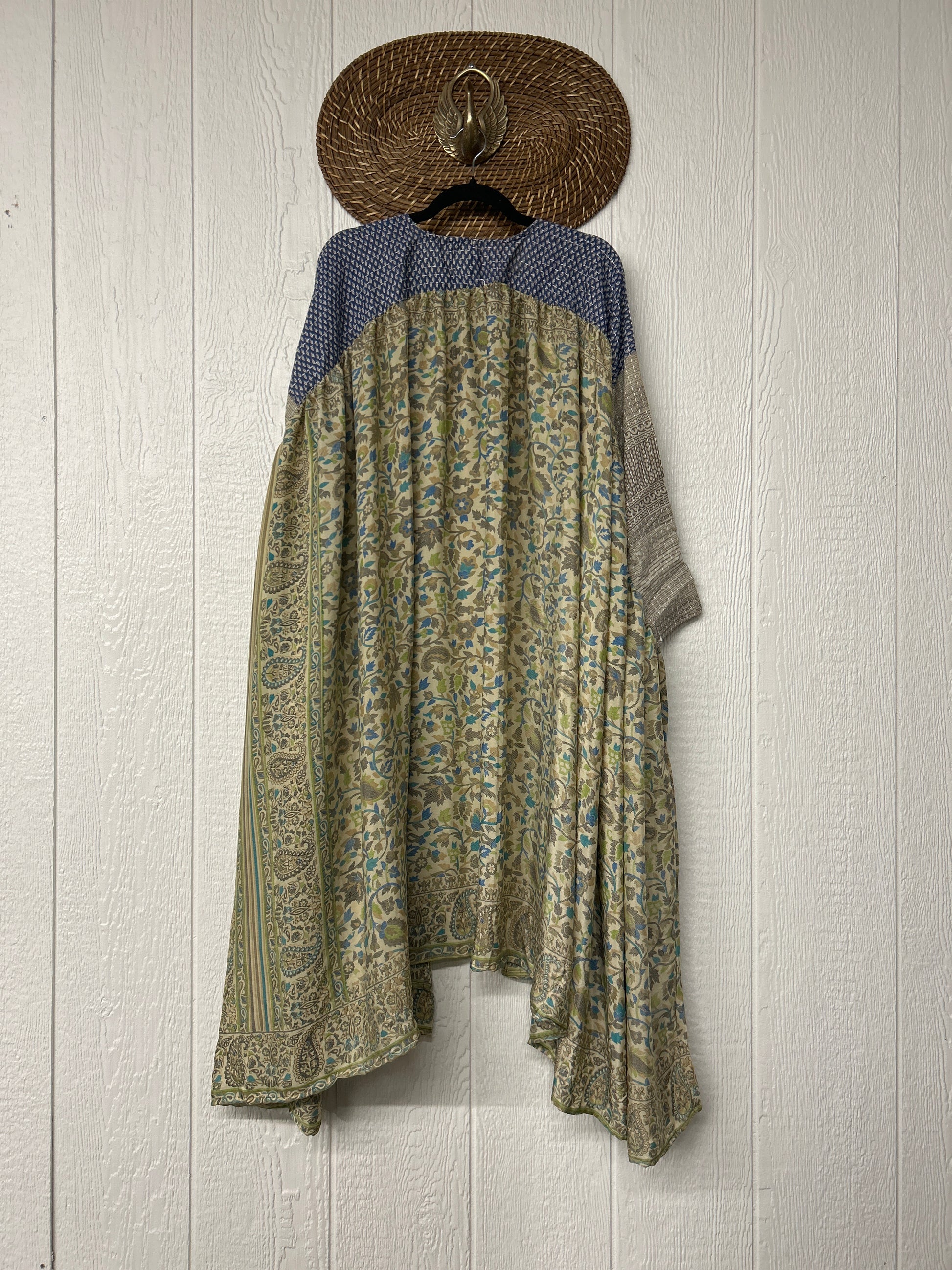 Twirl around to your heart's delight in our new Fleetwood Kimono. This floaty dream is a divine mix of our ultra lux Kantha embroidered vintage cotton and rasgulla sari. Features a tie neck closure and slouchy exterior pockets.