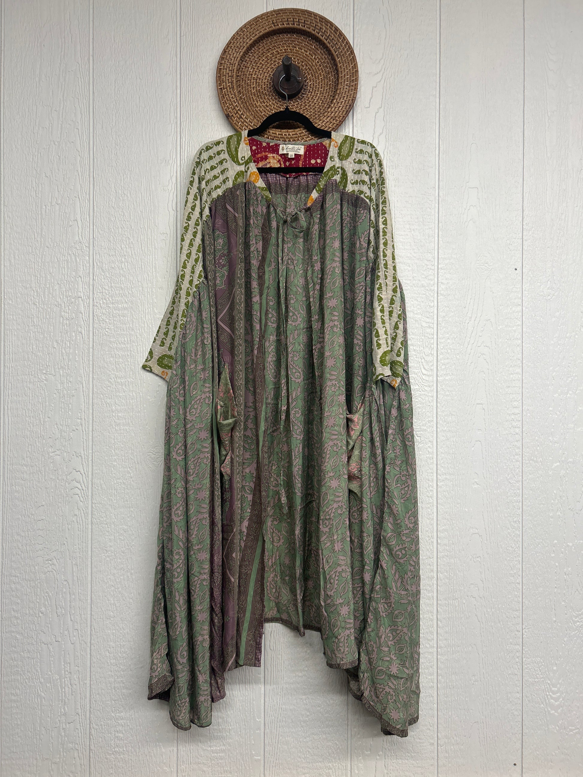 Twirl around to your heart's delight in our new Fleetwood Kimono. This floaty dream is a divine mix of our ultra lux Kantha embroidered vintage cotton and rasgulla sari. Features a tie neck closure and slouchy exterior pockets.