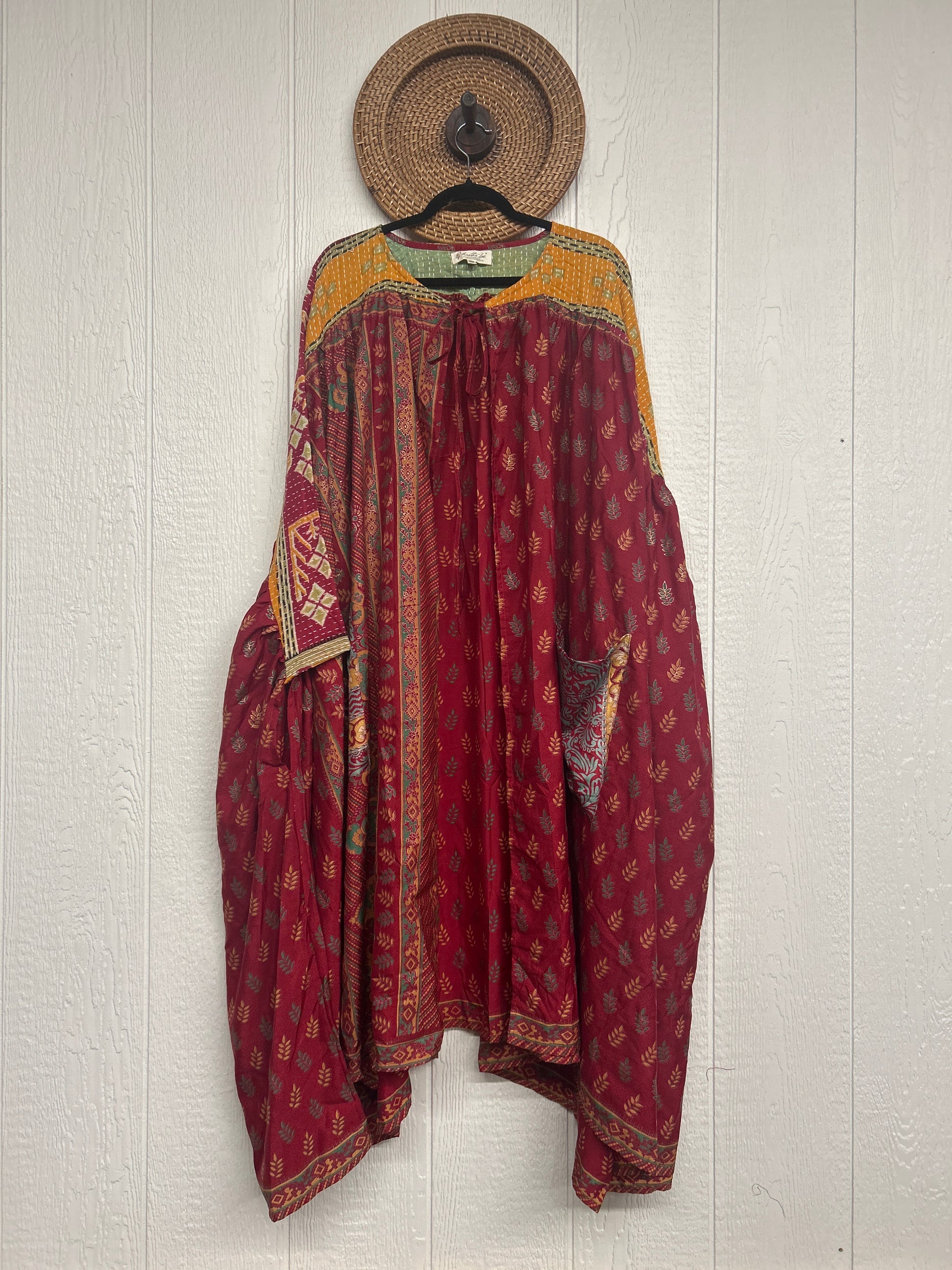 Twirl around to your heart's delight in our new Fleetwood Kimono. This floaty dream is a divine mix of our ultra lux Kantha embroidered vintage cotton and rasgulla sari. Features a tie neck closure and slouchy exterior pockets.