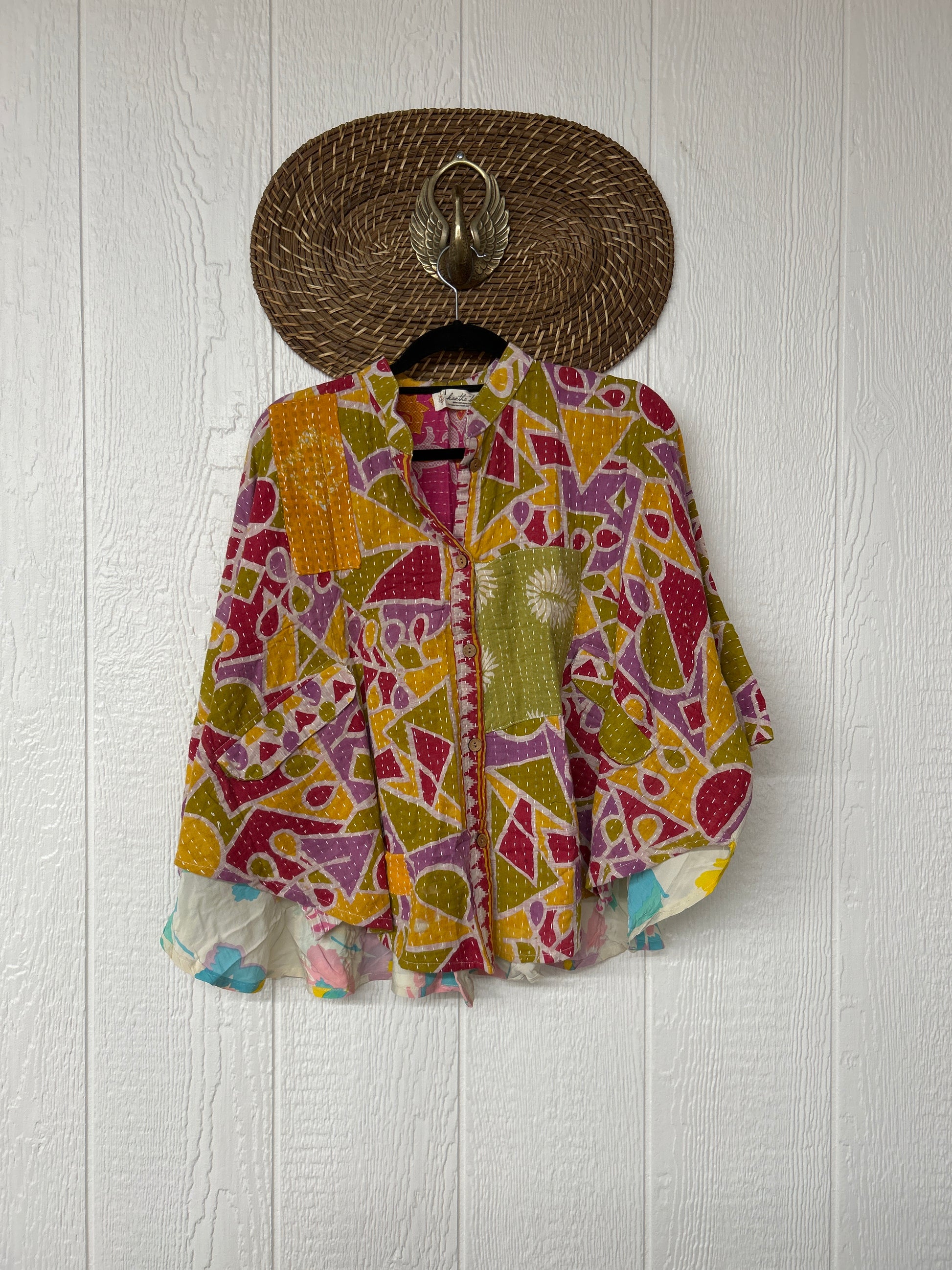 Made from our vintage cotton embroidered sari this billowy dream features a crepe panel in the back, functional buttons, two deep pockets in the front and a curved bottom.