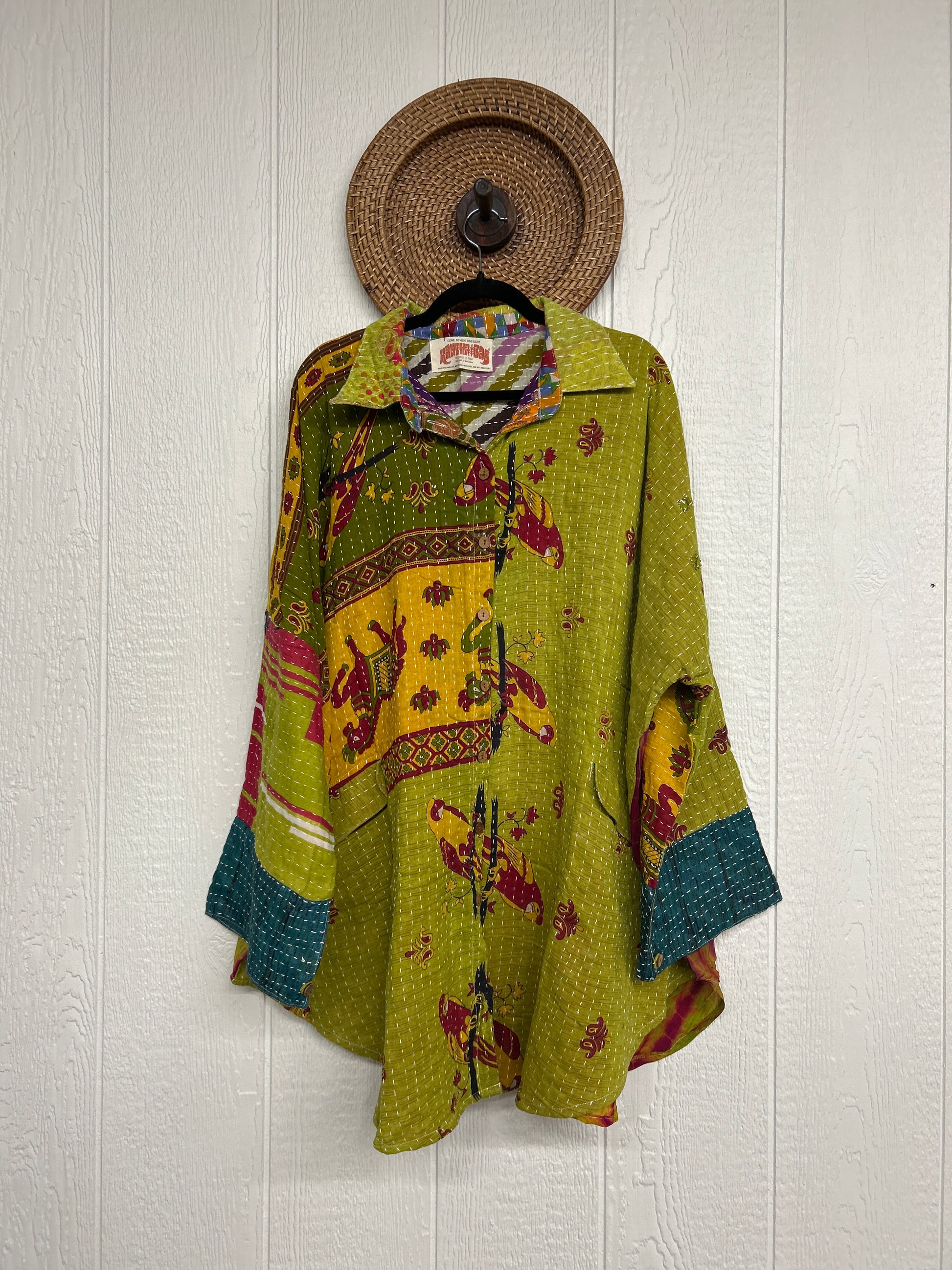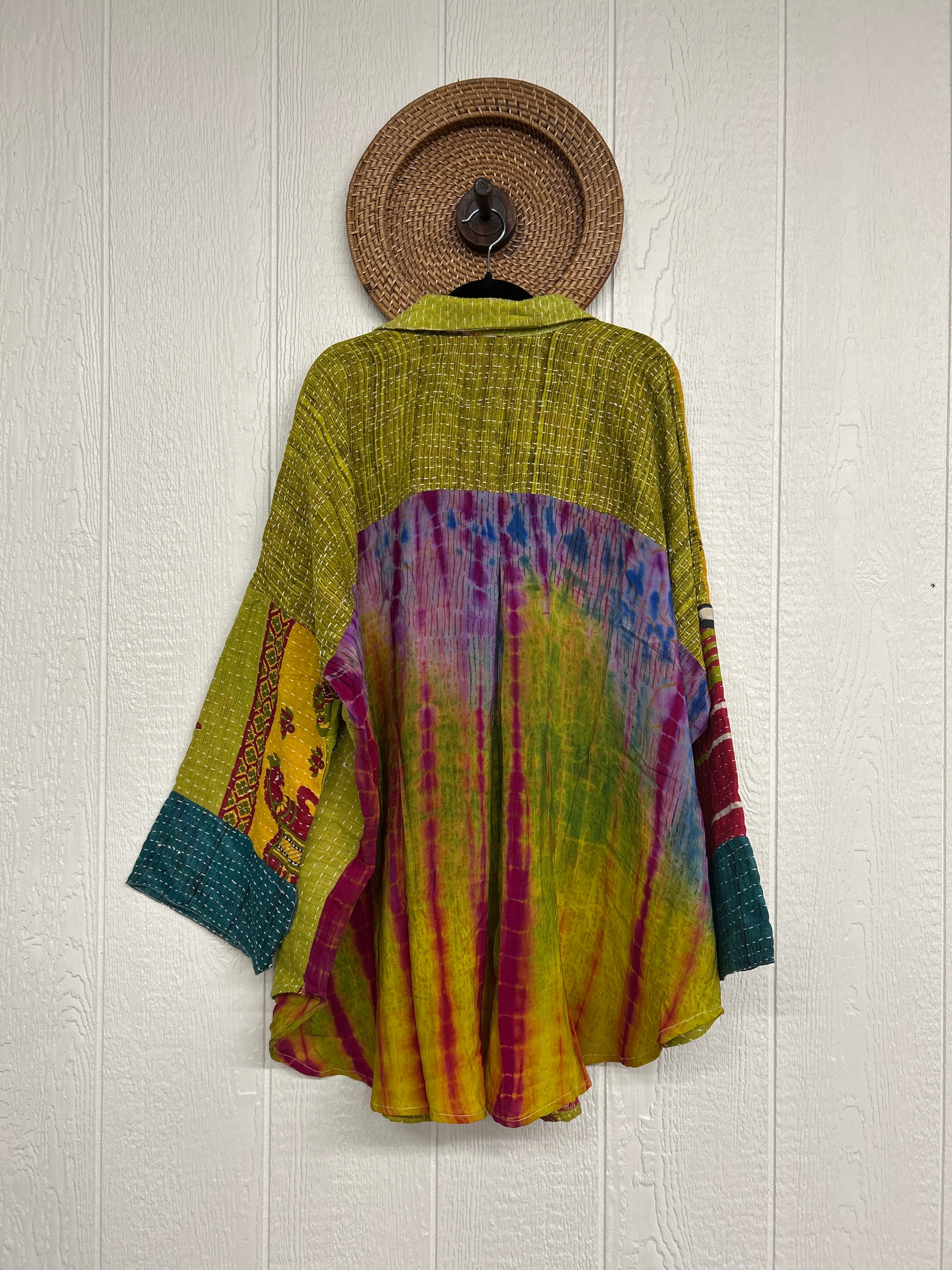 Made from our vintage cotton embroidered sari this billowy dream features a crepe panel in the back, functional buttons, two deep pockets in the front and a curved bottom.