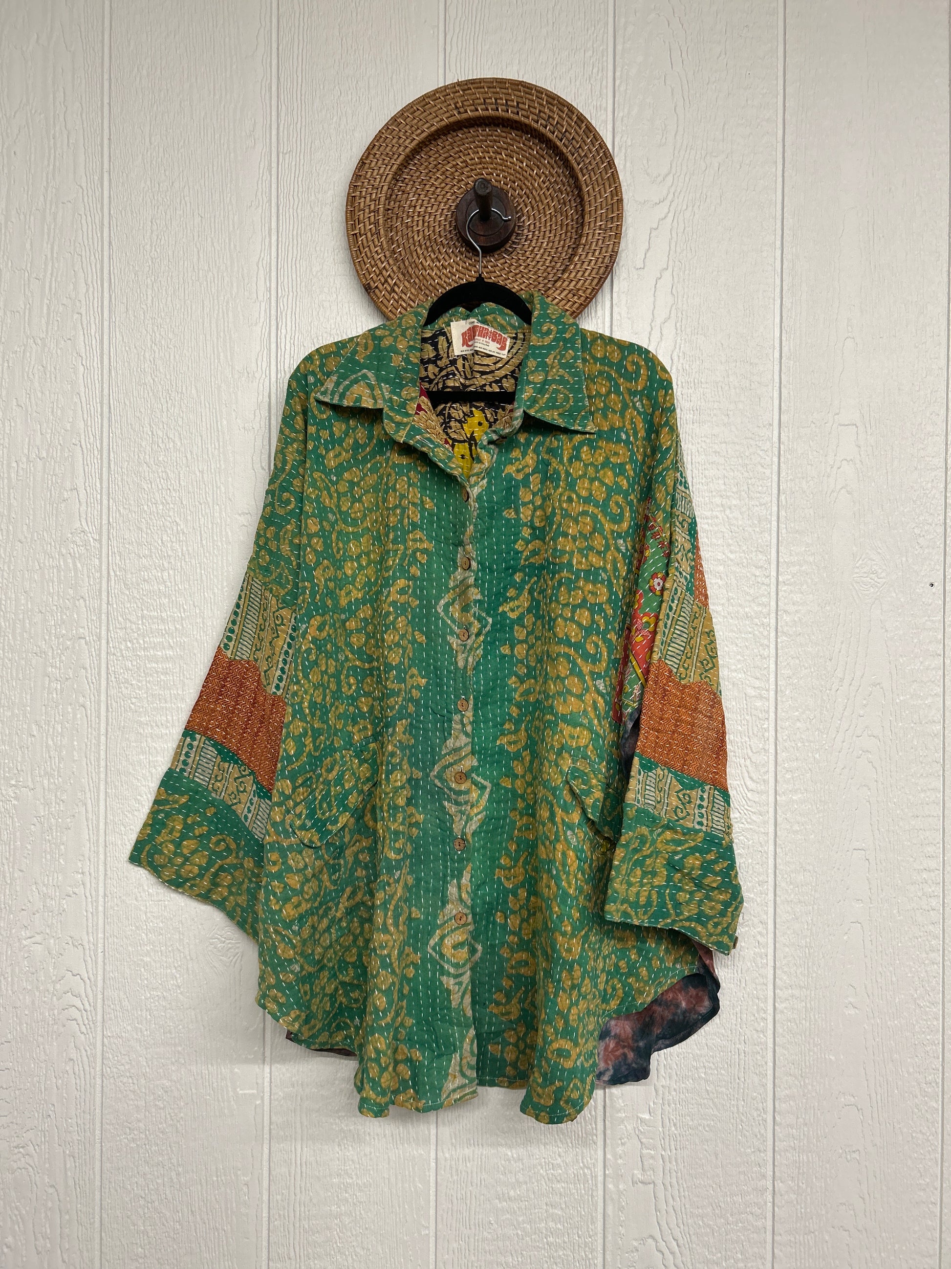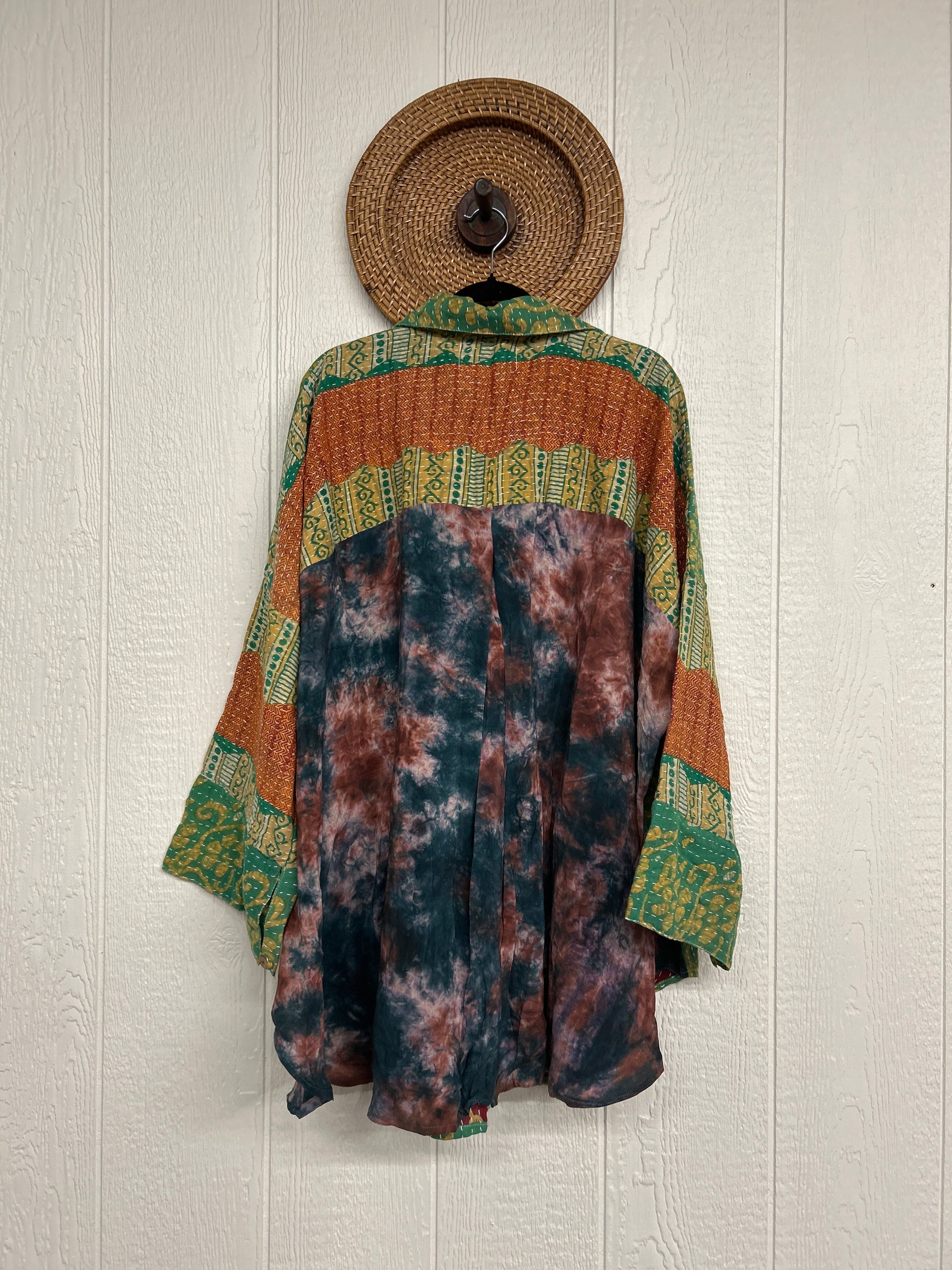 Made from our vintage cotton embroidered sari this billowy dream features a crepe panel in the back, functional buttons, two deep pockets in the front and a curved bottom.