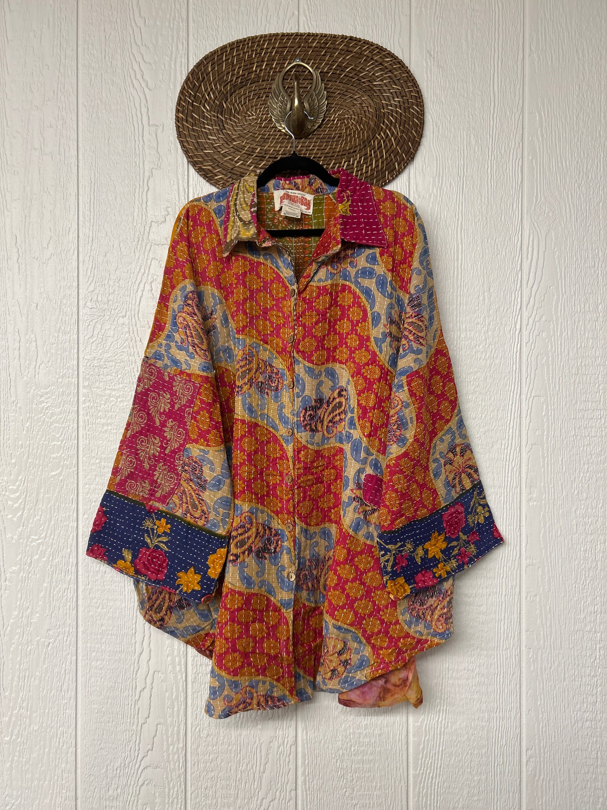 Made from our vintage cotton embroidered sari this billowy dream features a crepe panel in the back, functional buttons, two deep pockets in the front and a curved bottom.
