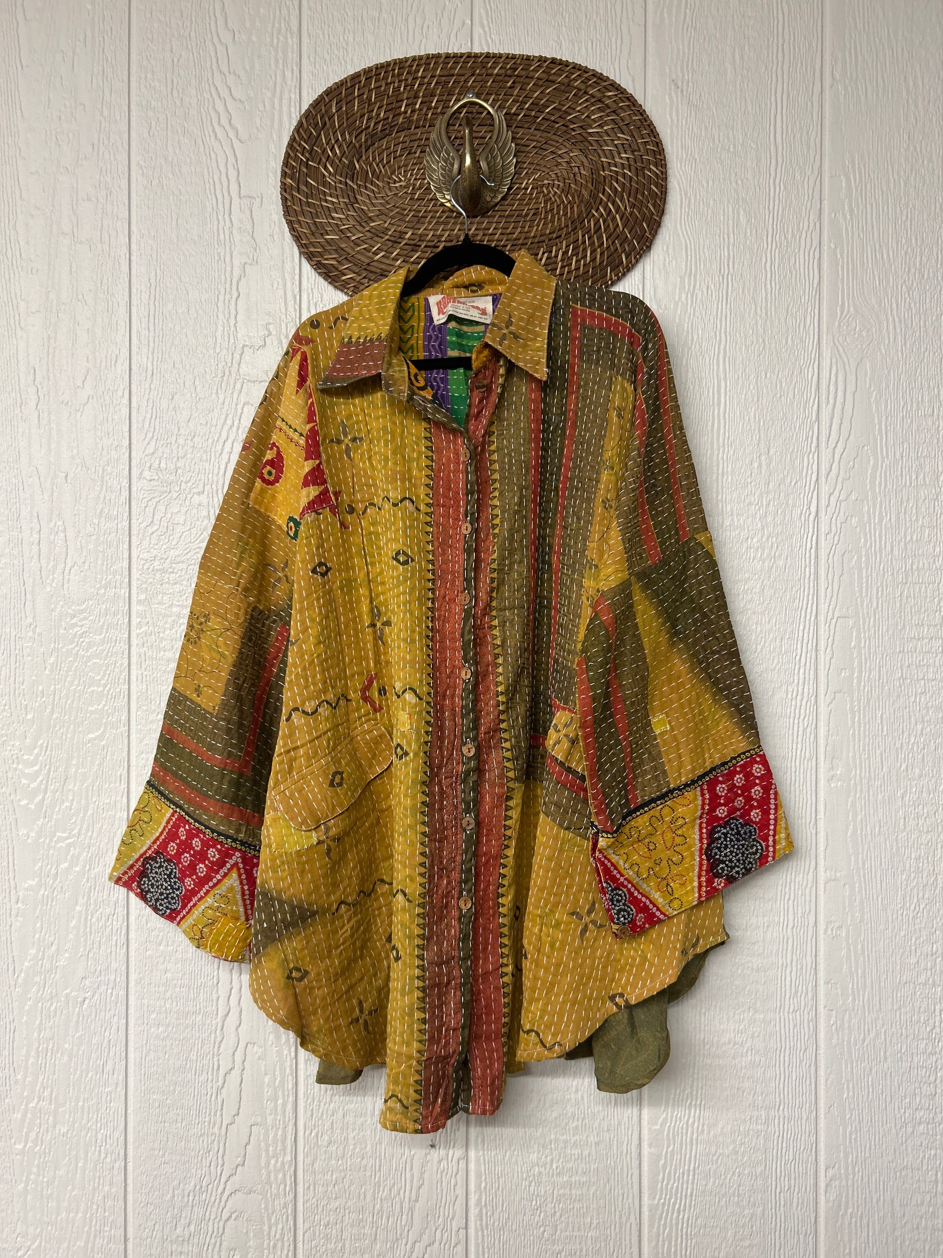 Made from our vintage cotton embroidered sari this billowy dream features a crepe panel in the back, functional buttons, two deep pockets in the front and a curved bottom.