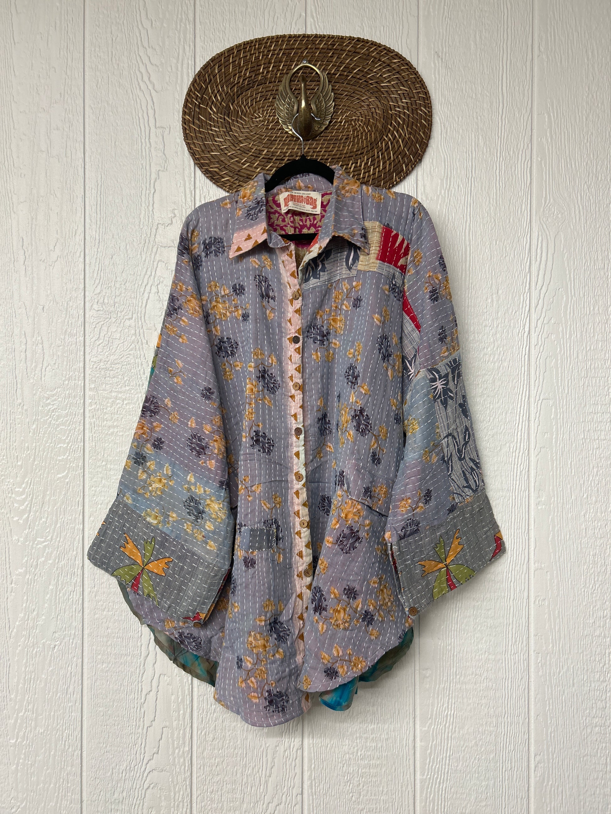 Made from our vintage cotton embroidered sari this billowy dream features a crepe panel in the back, functional buttons, two deep pockets in the front and a curved bottom.