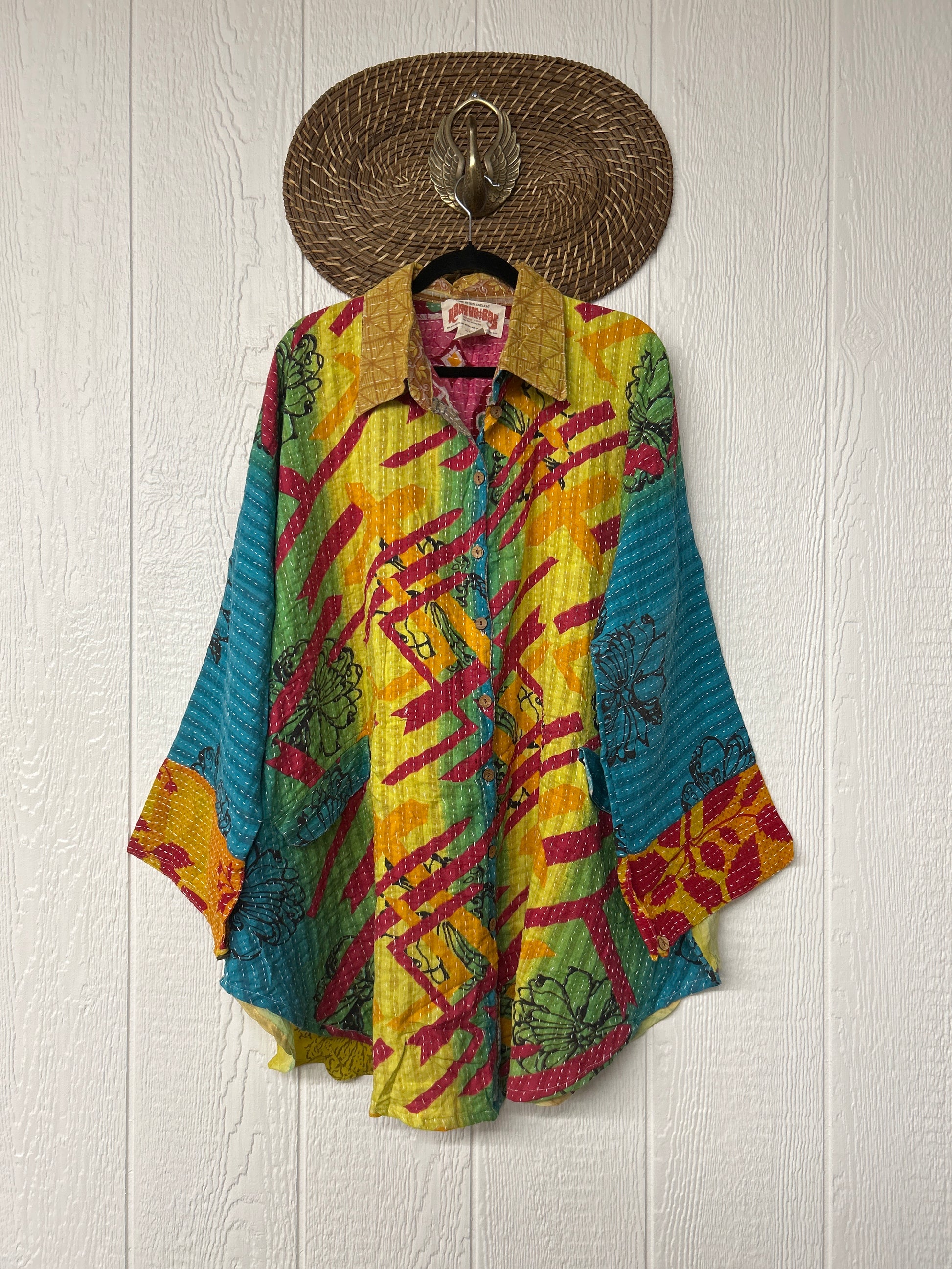 Made from our vintage cotton embroidered sari this billowy dream features a crepe panel in the back, functional buttons, two deep pockets in the front and a curved bottom.