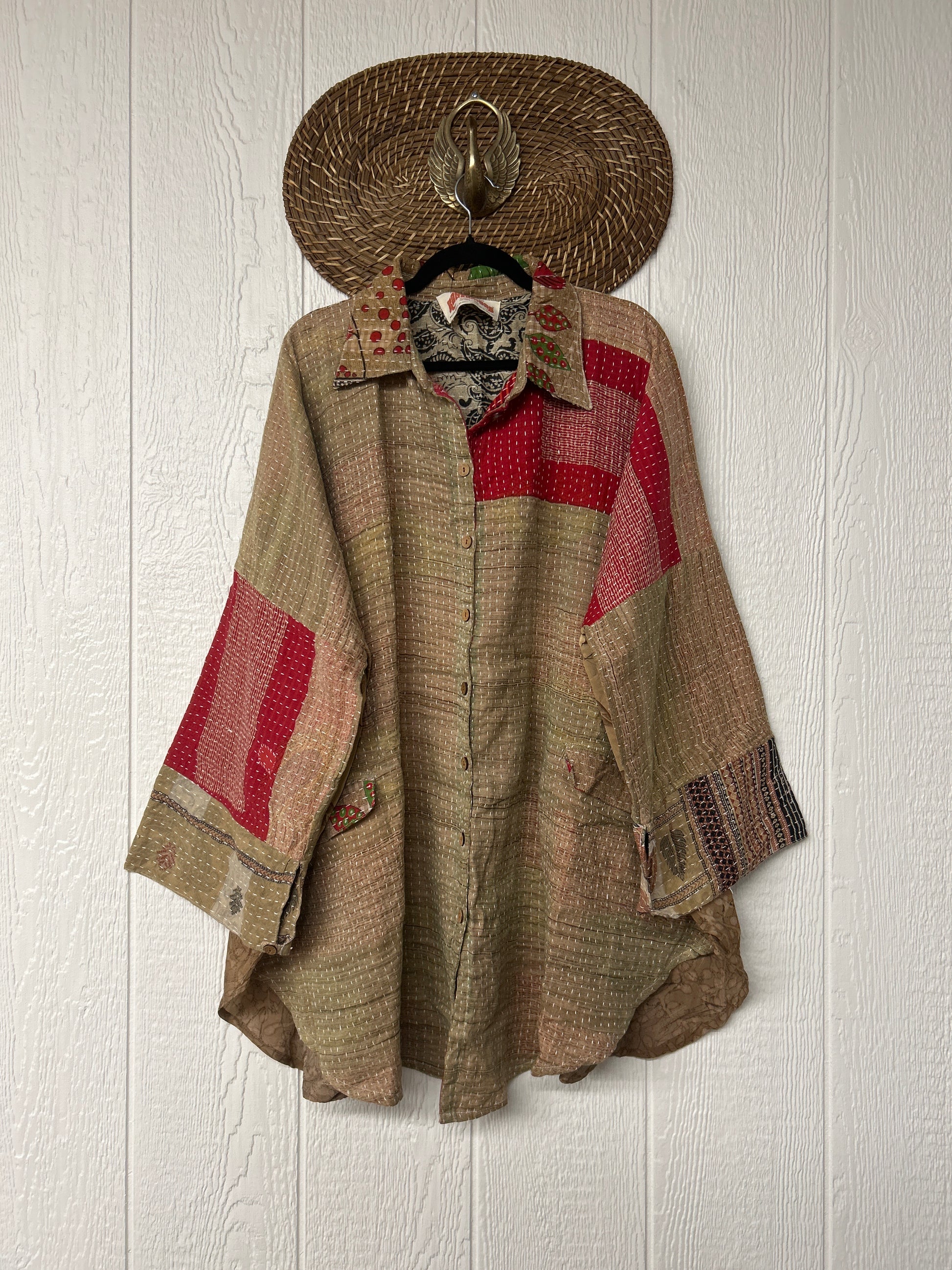 Made from our vintage cotton embroidered sari this billowy dream features a crepe panel in the back, functional buttons, two deep pockets in the front and a curved bottom.
