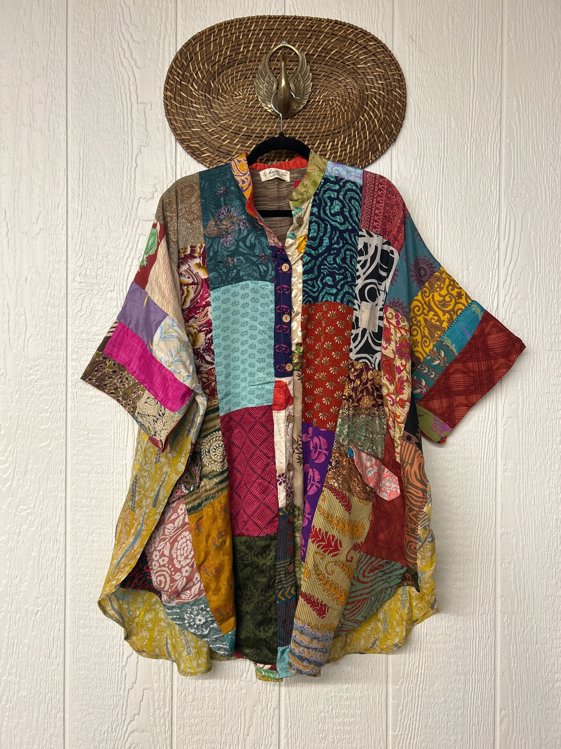 Made from hand-stitched patchwork vintage crepe sari, this billowy dream is fully lined in the front with cotton sari. Features a crepe panel in the back, functional buttons, two slouchy pockets in the front, and a curved bottom.