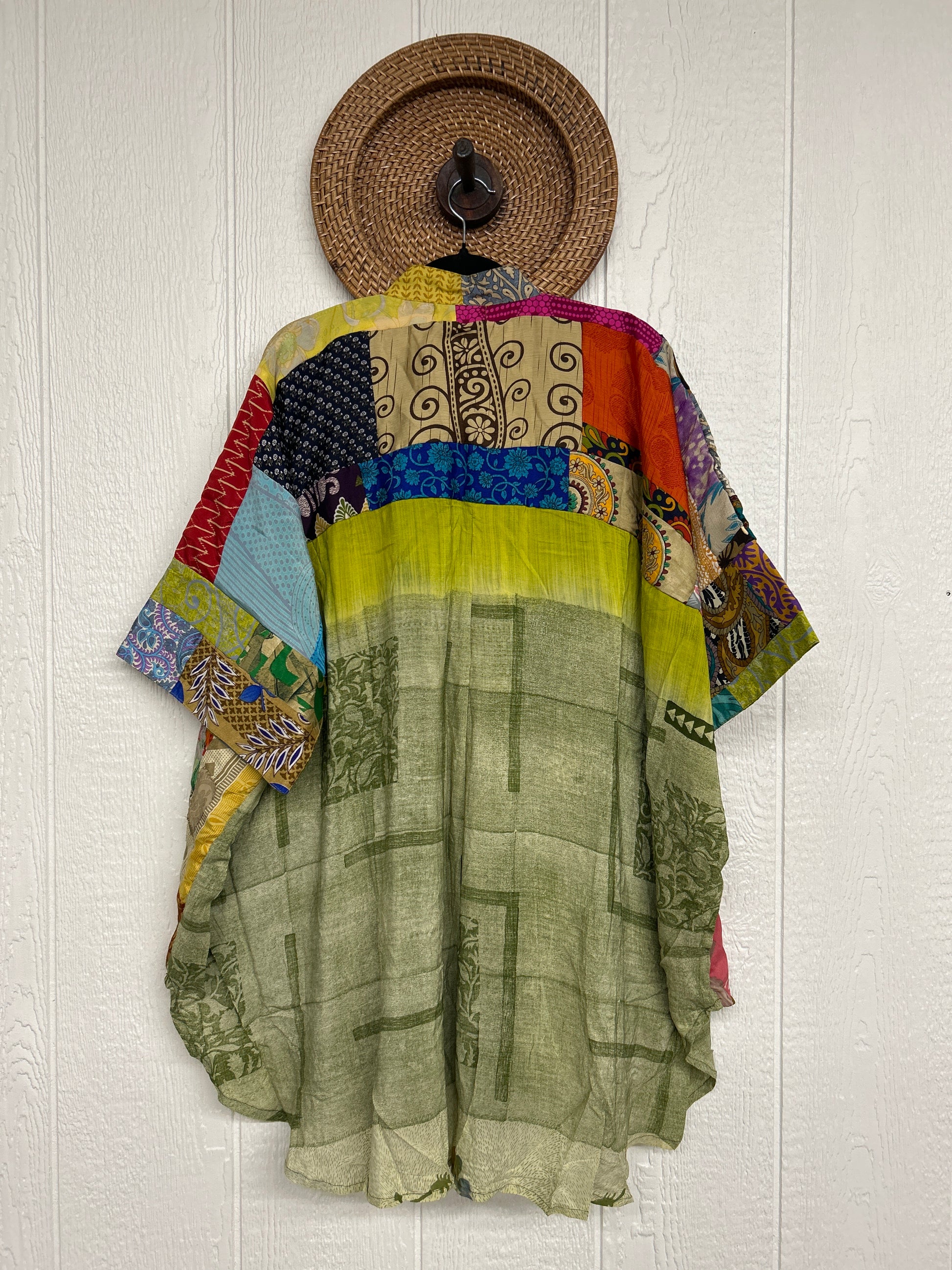 Made from hand-stitched patchwork vintage crepe sari, this billowy dream is fully lined in the front with cotton sari. Features a crepe panel in the back, functional buttons, two slouchy pockets in the front, and a curved bottom.