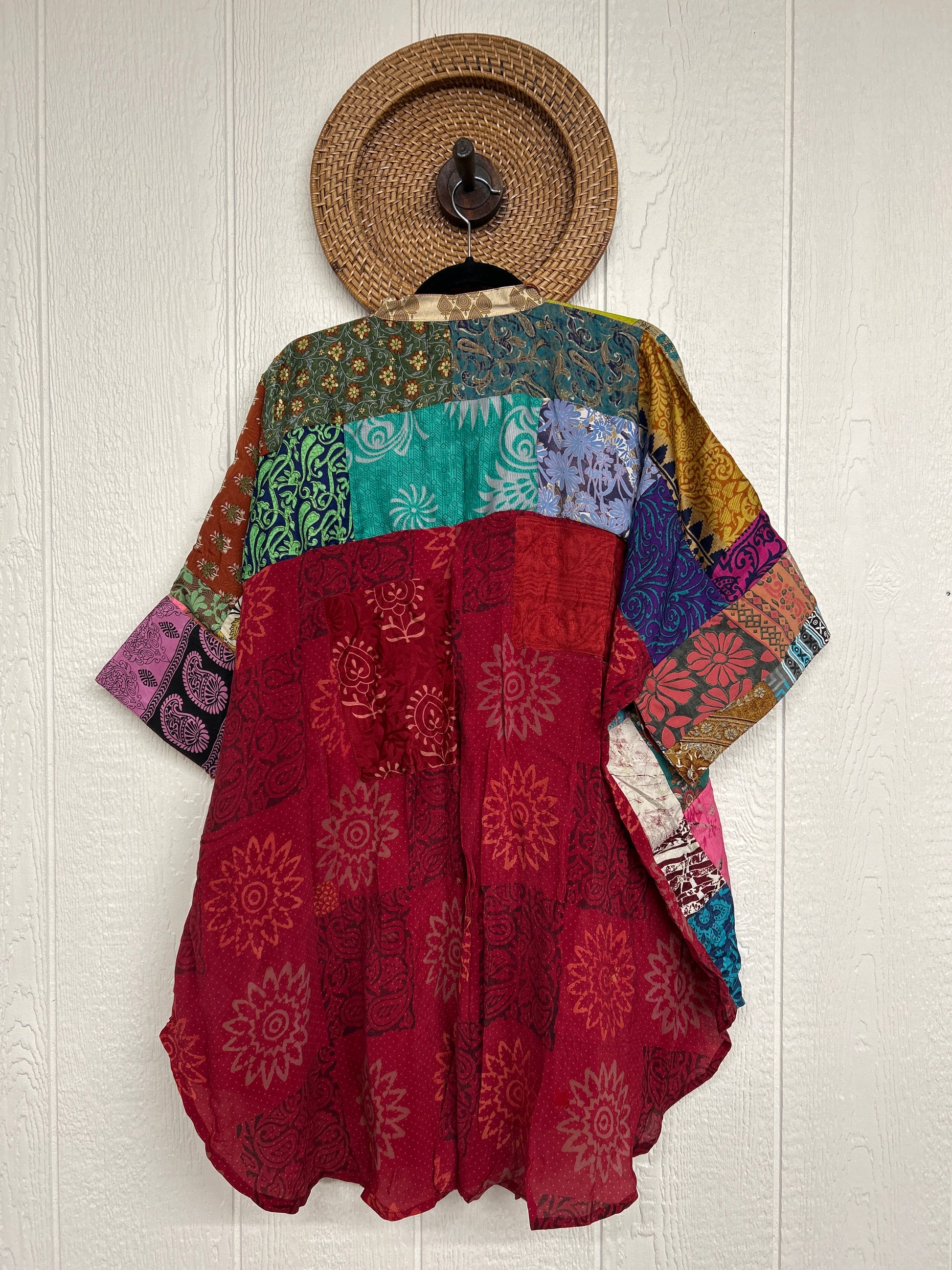 Made from hand-stitched patchwork vintage crepe sari, this billowy dream is fully lined in the front with cotton sari. Features a crepe panel in the back, functional buttons, two slouchy pockets in the front, and a curved bottom.