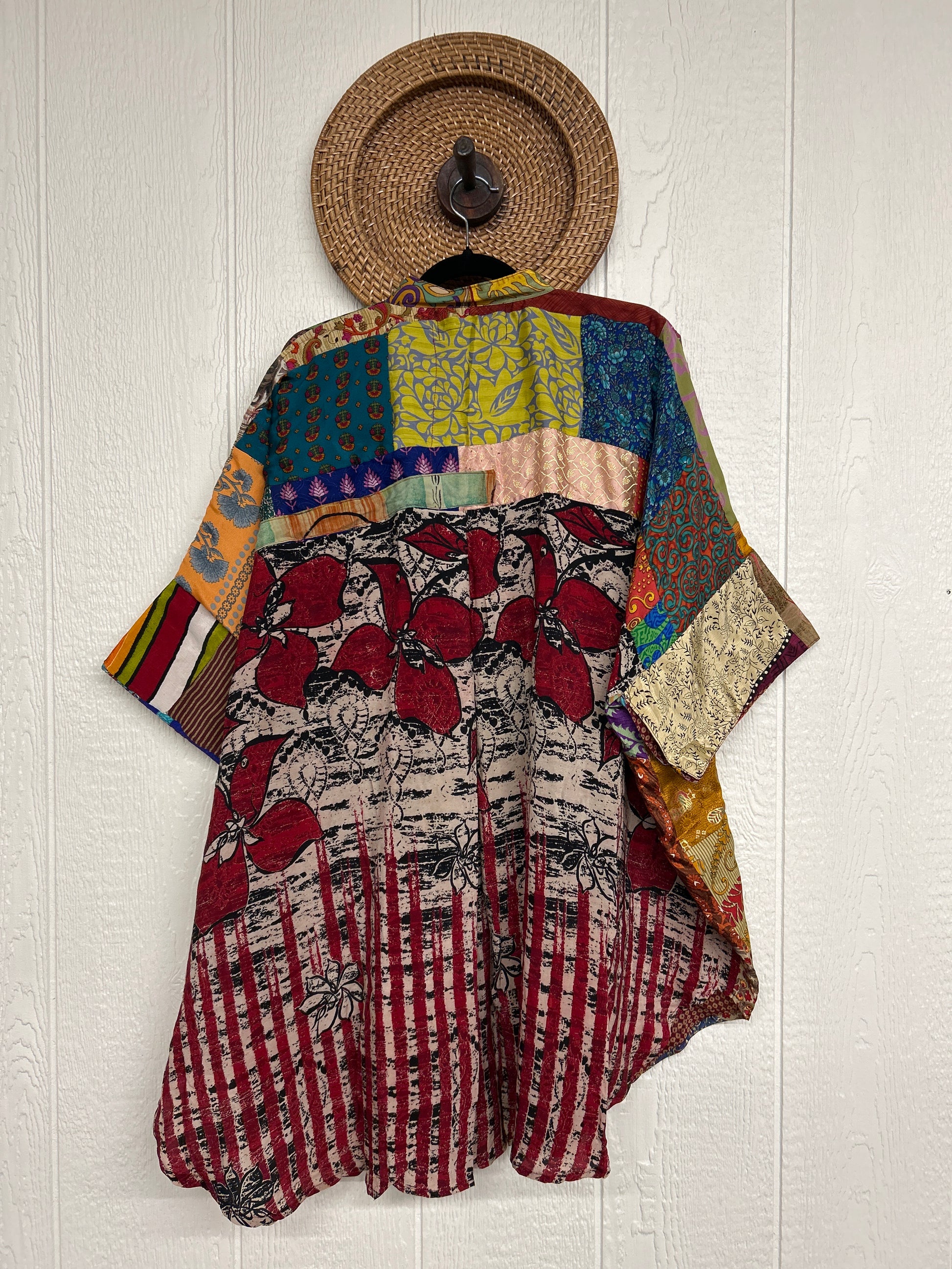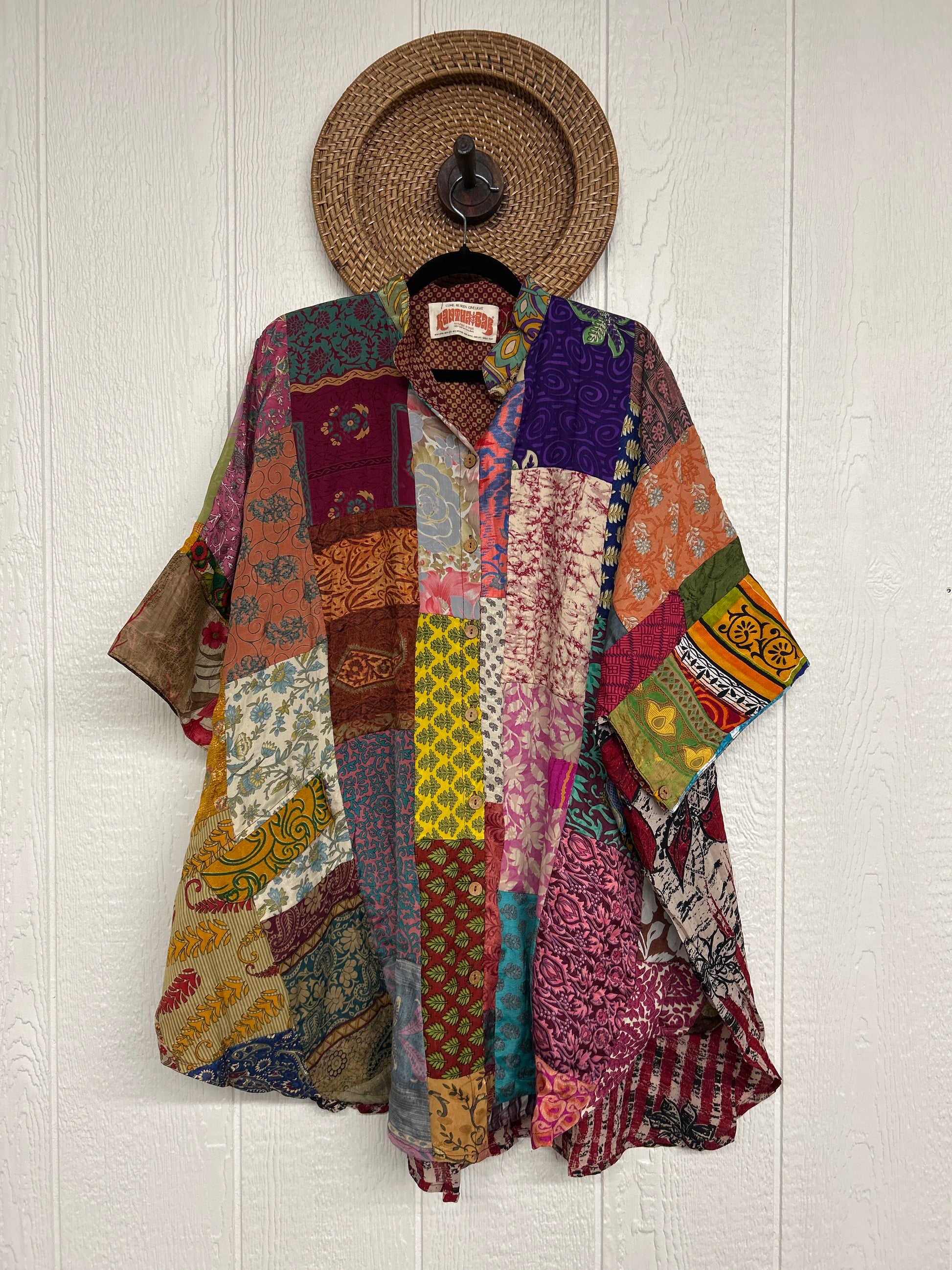 Made from hand-stitched patchwork vintage crepe sari, this billowy dream is fully lined in the front with cotton sari. Features a crepe panel in the back, functional buttons, two slouchy pockets in the front, and a curved bottom.