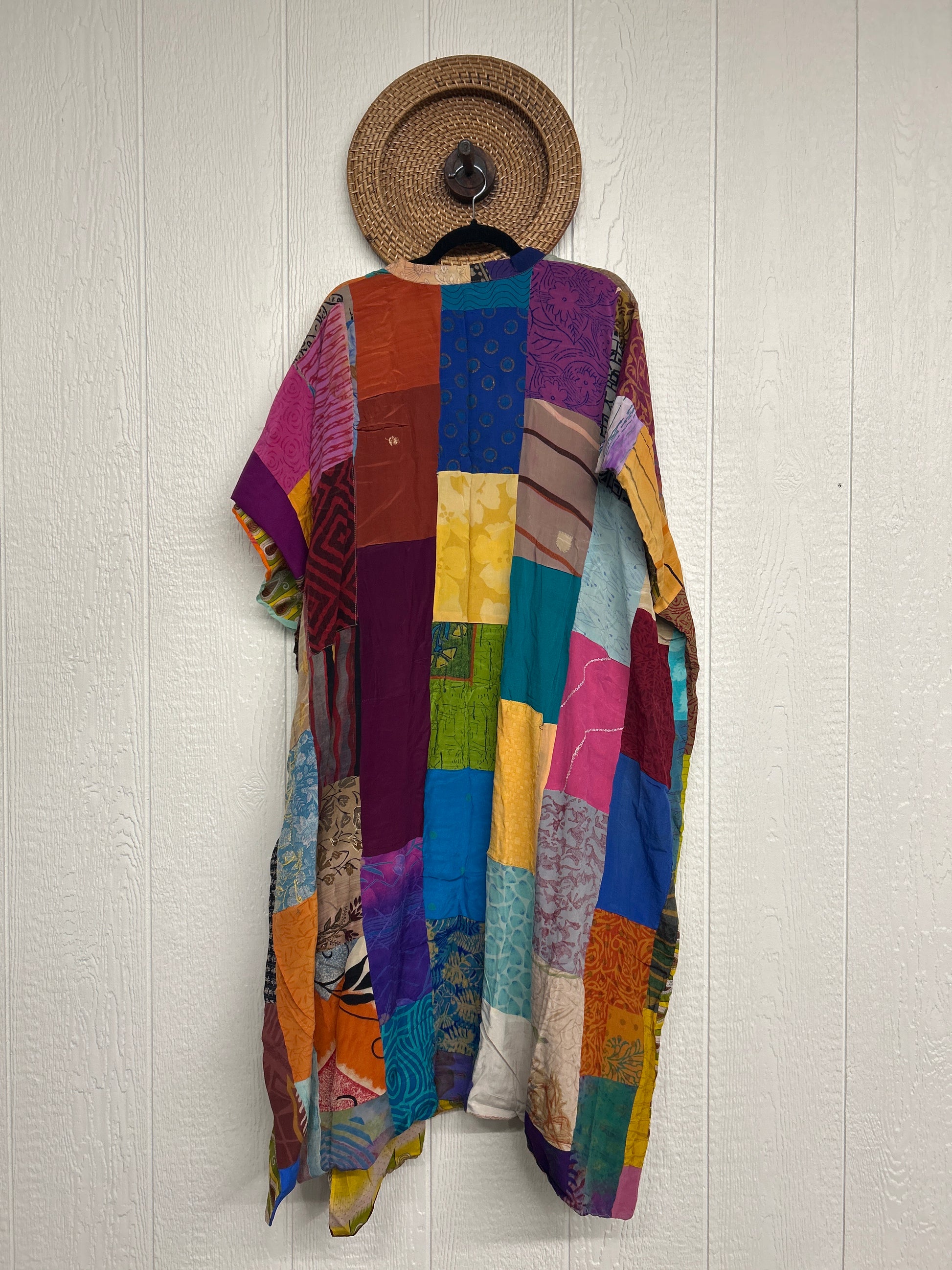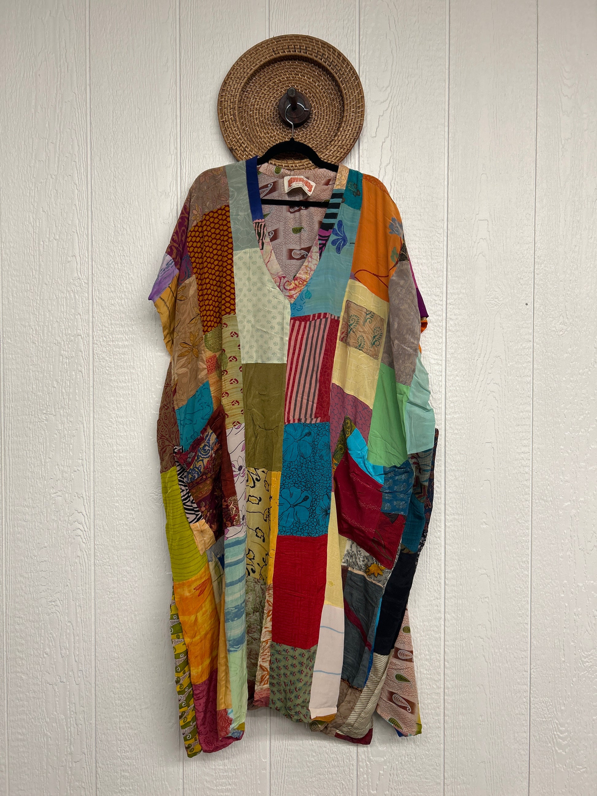 Patchwork outer garment is made from upcycled vintage rasgulla and crepe and fully lined in printed cotton sari. Features slouchy outer pockets, a v neckline and side slits for extra dimension.