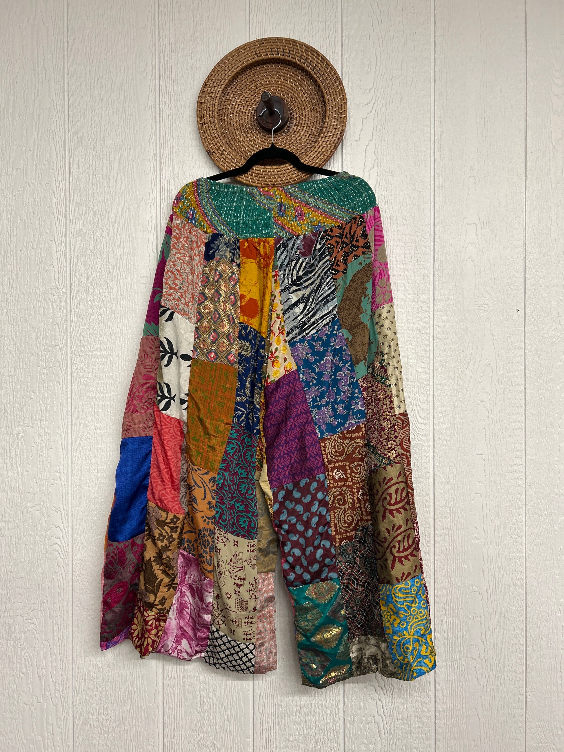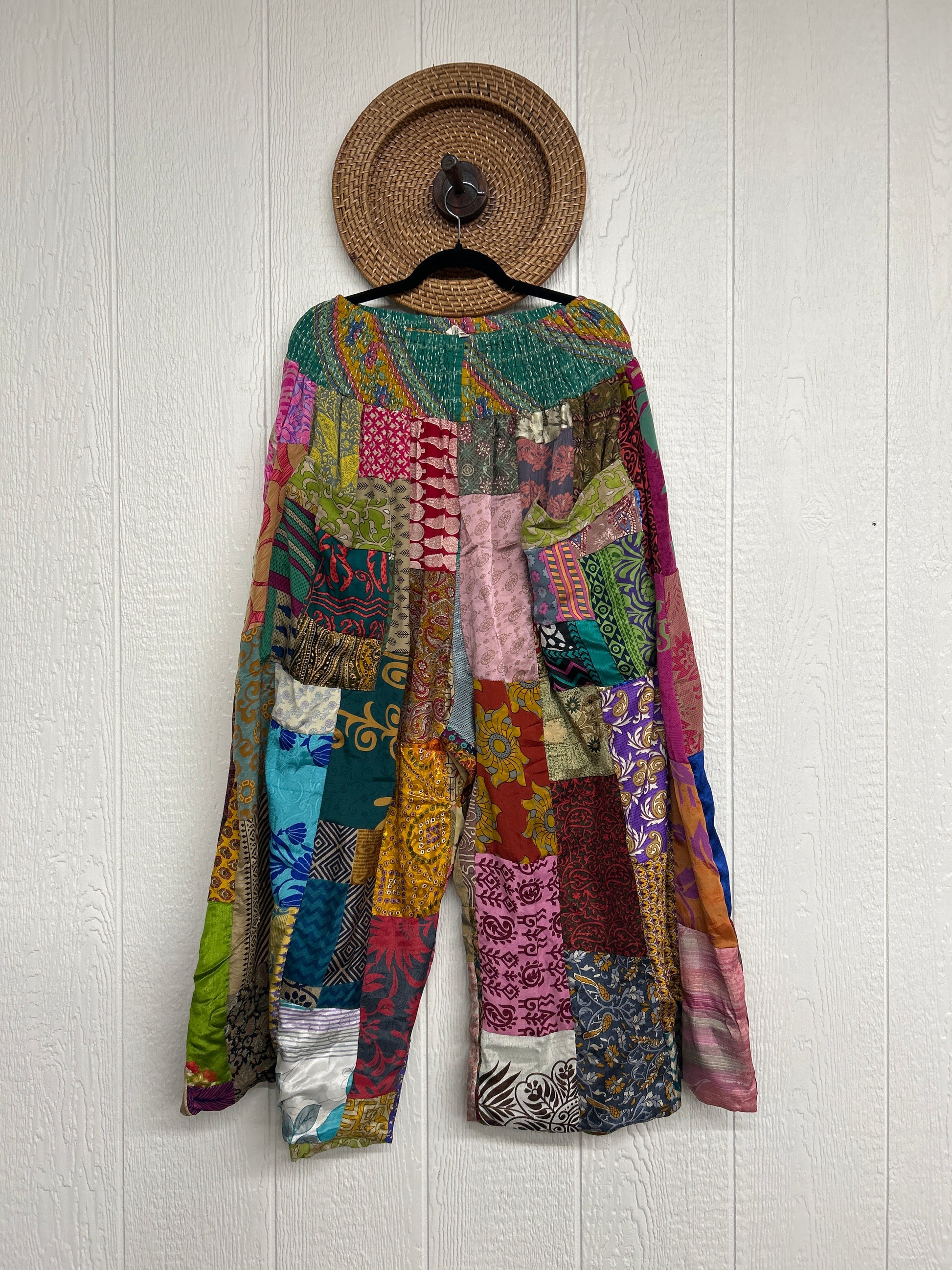 Features super wide legs that make your pants dance when you walk. Front slouchy pockets are deep enough to fill with your treasures. Vintage Rasgulla and Crepe Sari make up the beautiful patchwork featured on the outside with vintage cotton sari lining on the inside. Fully reversible and free size in all the ways!