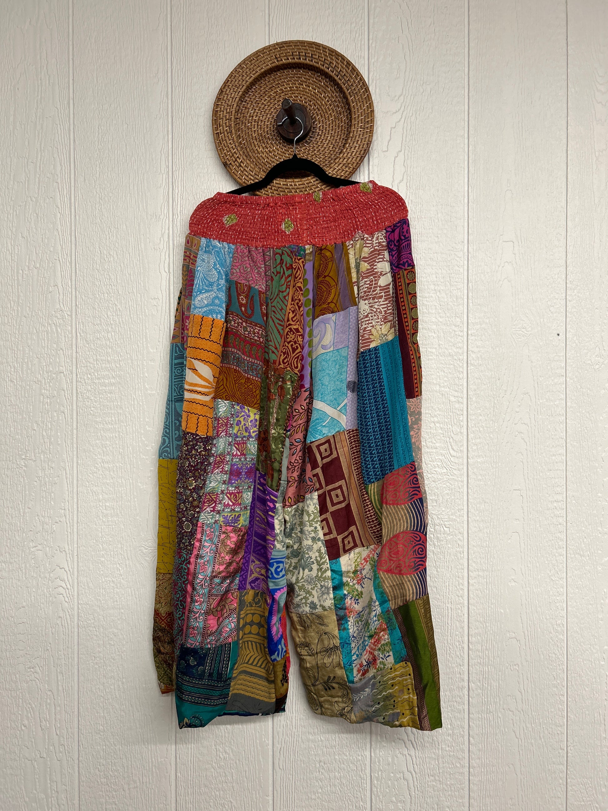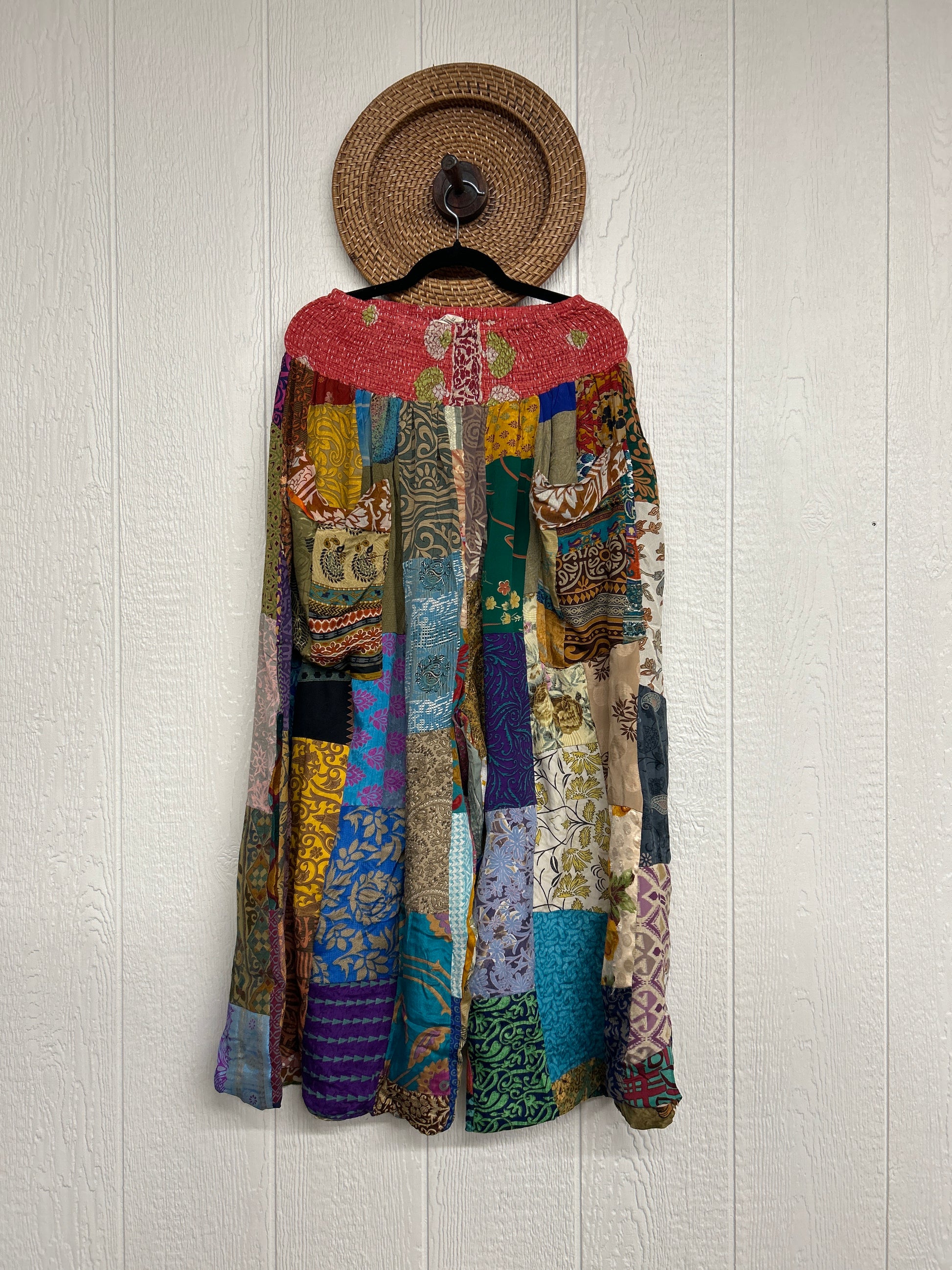 Features super wide legs that make your pants dance when you walk. Front slouchy pockets are deep enough to fill with your treasures. Vintage Rasgulla and Crepe Sari make up the beautiful patchwork featured on the outside with vintage cotton sari lining on the inside. Fully reversible and free size in all the ways!