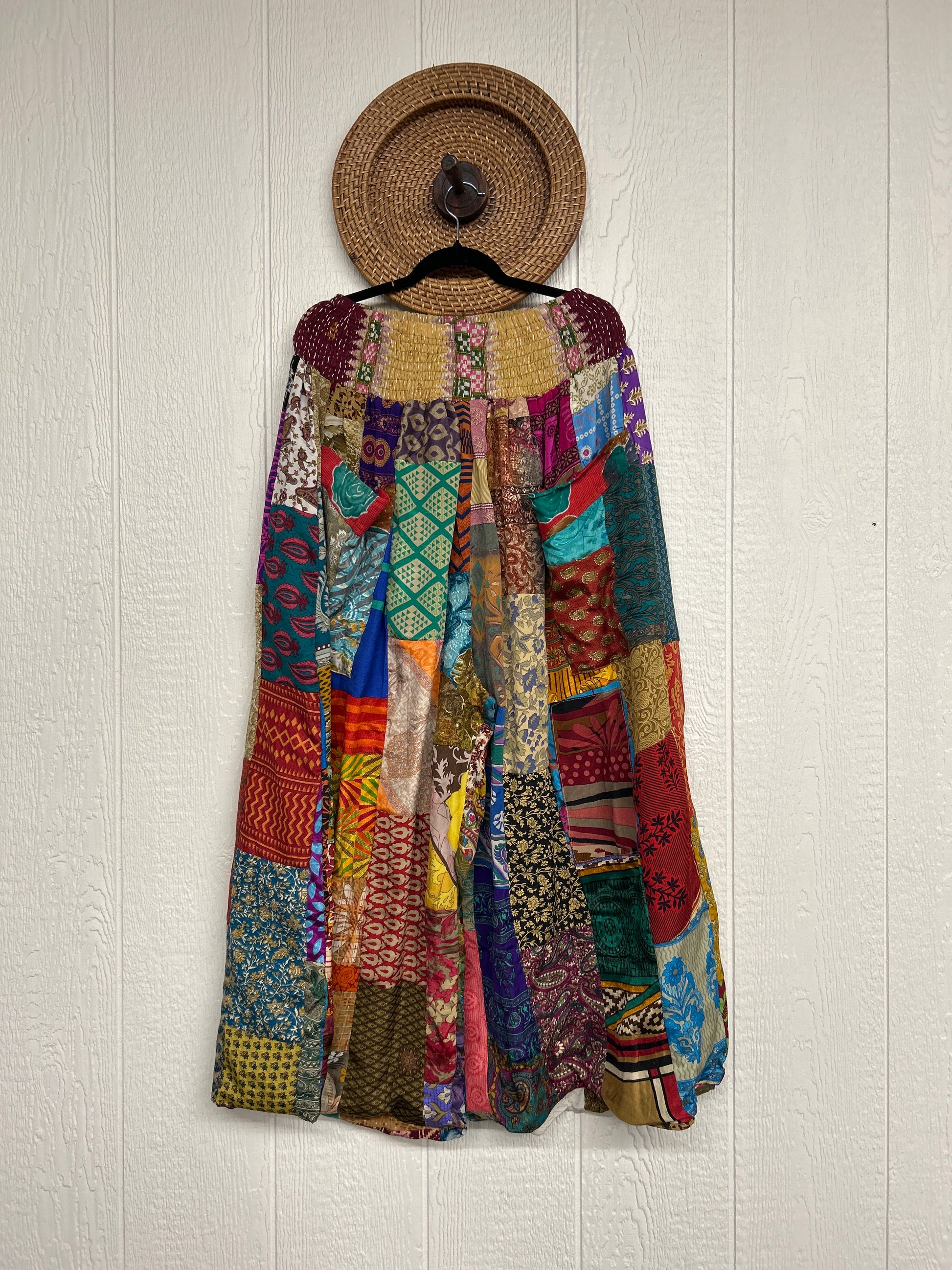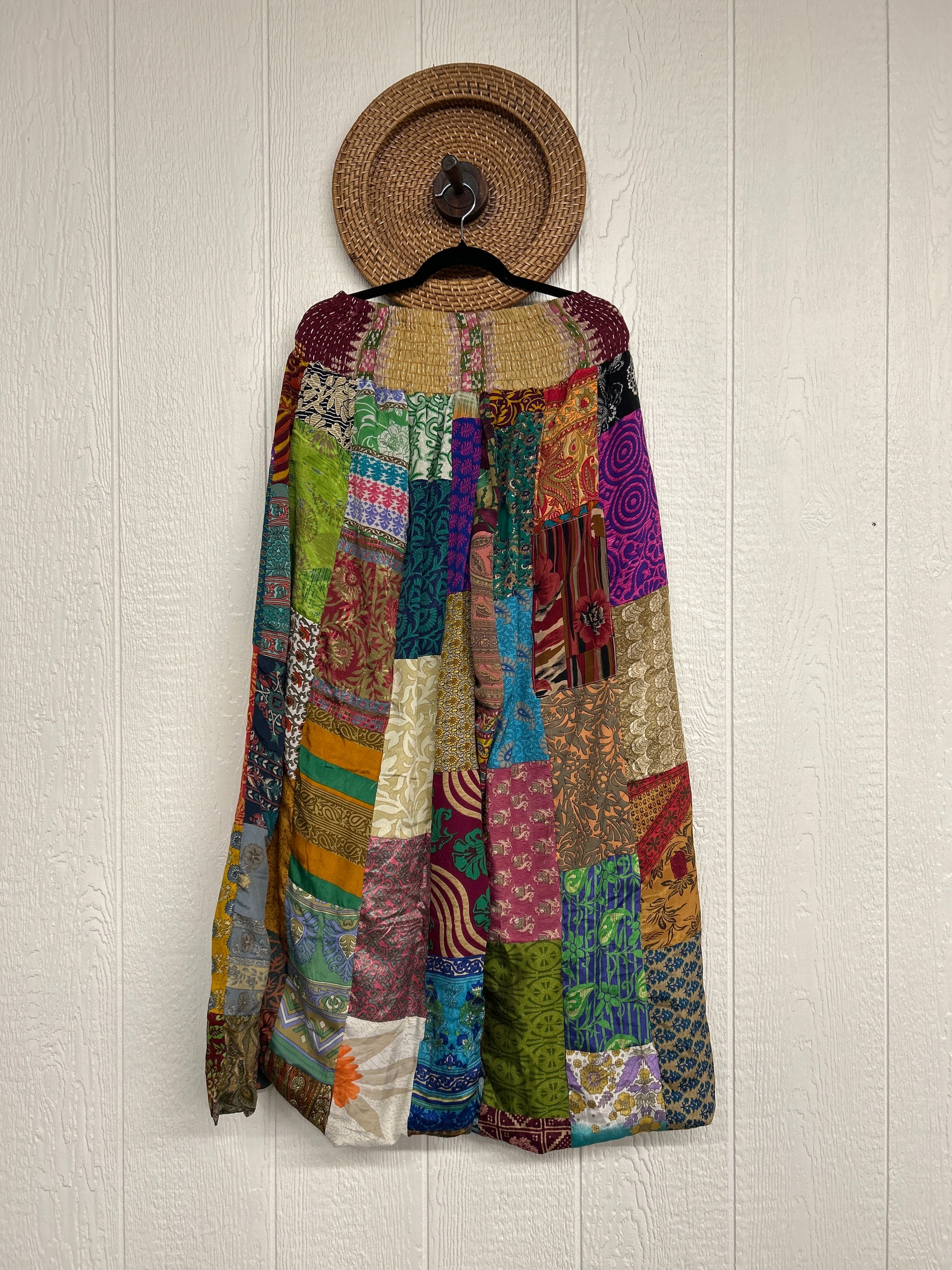 Features super wide legs that make your pants dance when you walk. Front slouchy pockets are deep enough to fill with your treasures. Vintage Rasgulla and Crepe Sari make up the beautiful patchwork featured on the outside with vintage cotton sari lining on the inside. Fully reversible and free size in all the ways!