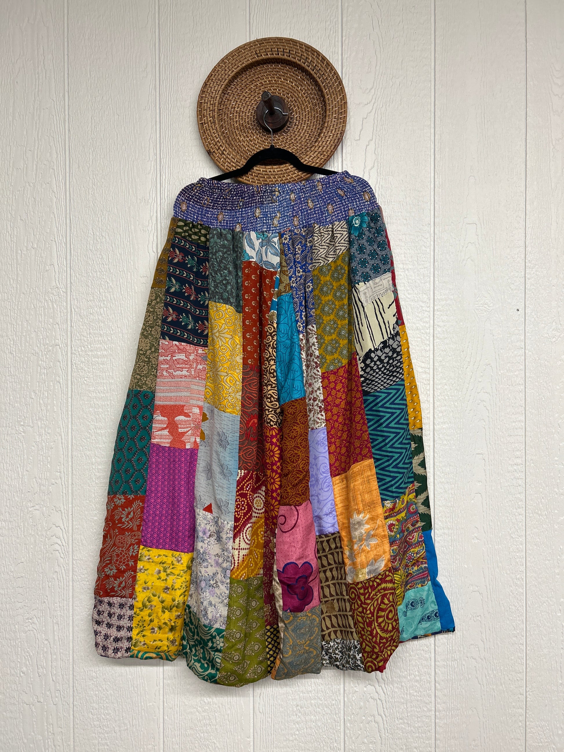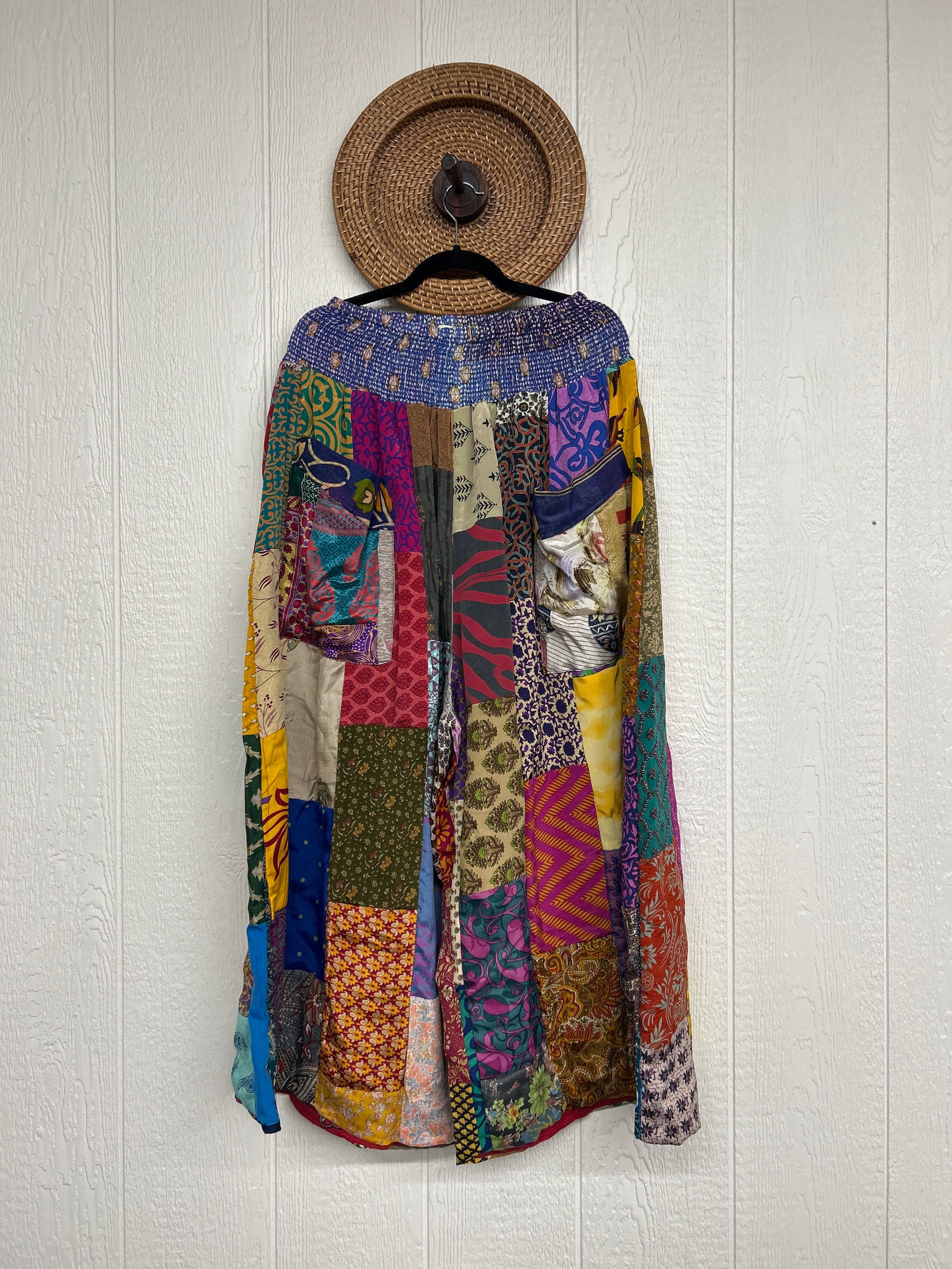 Features super wide legs that make your pants dance when you walk. Front slouchy pockets are deep enough to fill with your treasures. Vintage Rasgulla and Crepe Sari make up the beautiful patchwork featured on the outside with vintage cotton sari lining on the inside. Fully reversible and free size in all the ways!