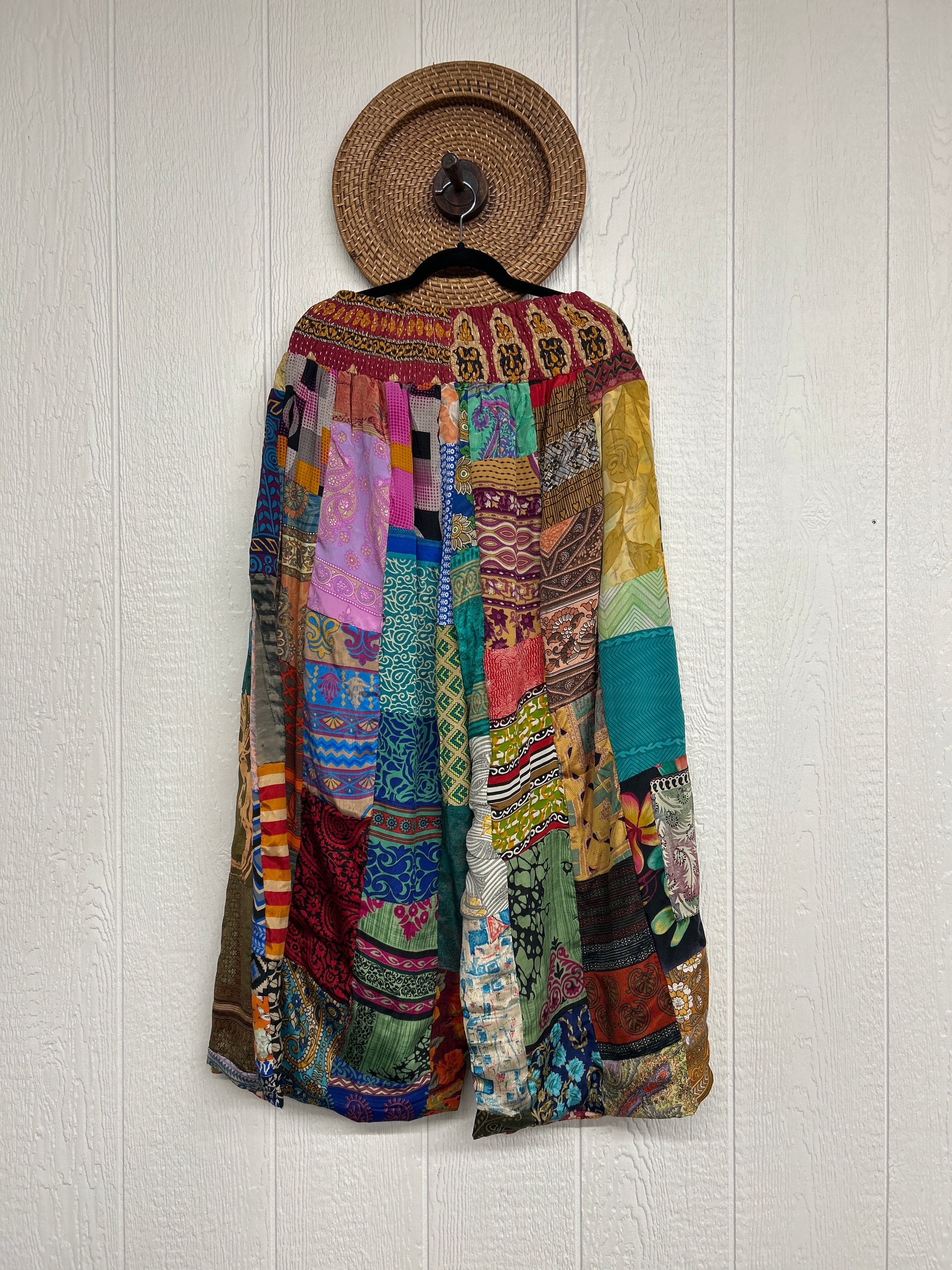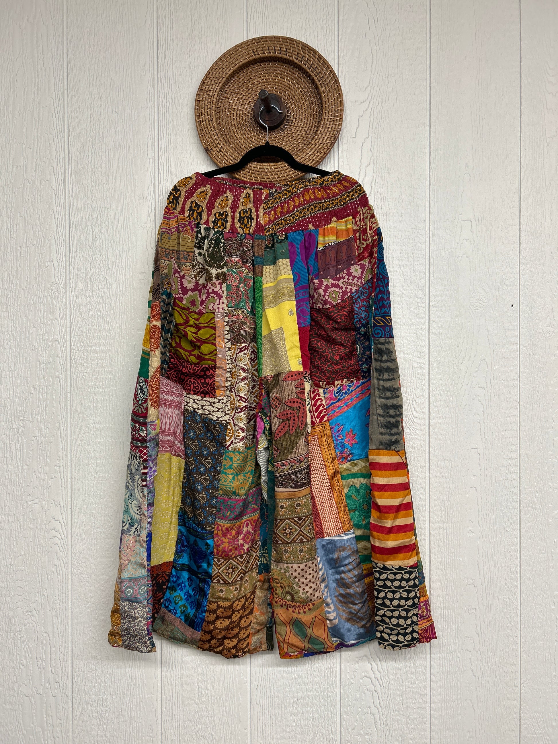 Features super wide legs that make your pants dance when you walk. Front slouchy pockets are deep enough to fill with your treasures. Vintage Rasgulla and Crepe Sari make up the beautiful patchwork featured on the outside with vintage cotton sari lining on the inside. Fully reversible and free size in all the ways!