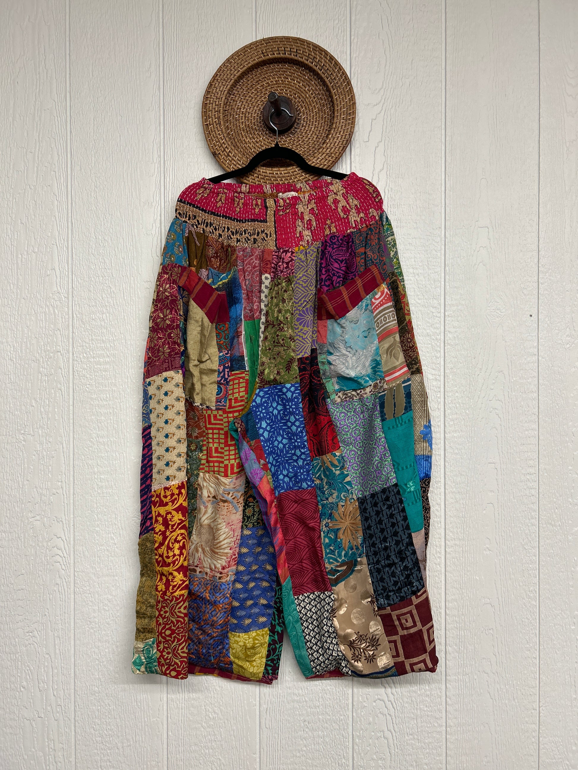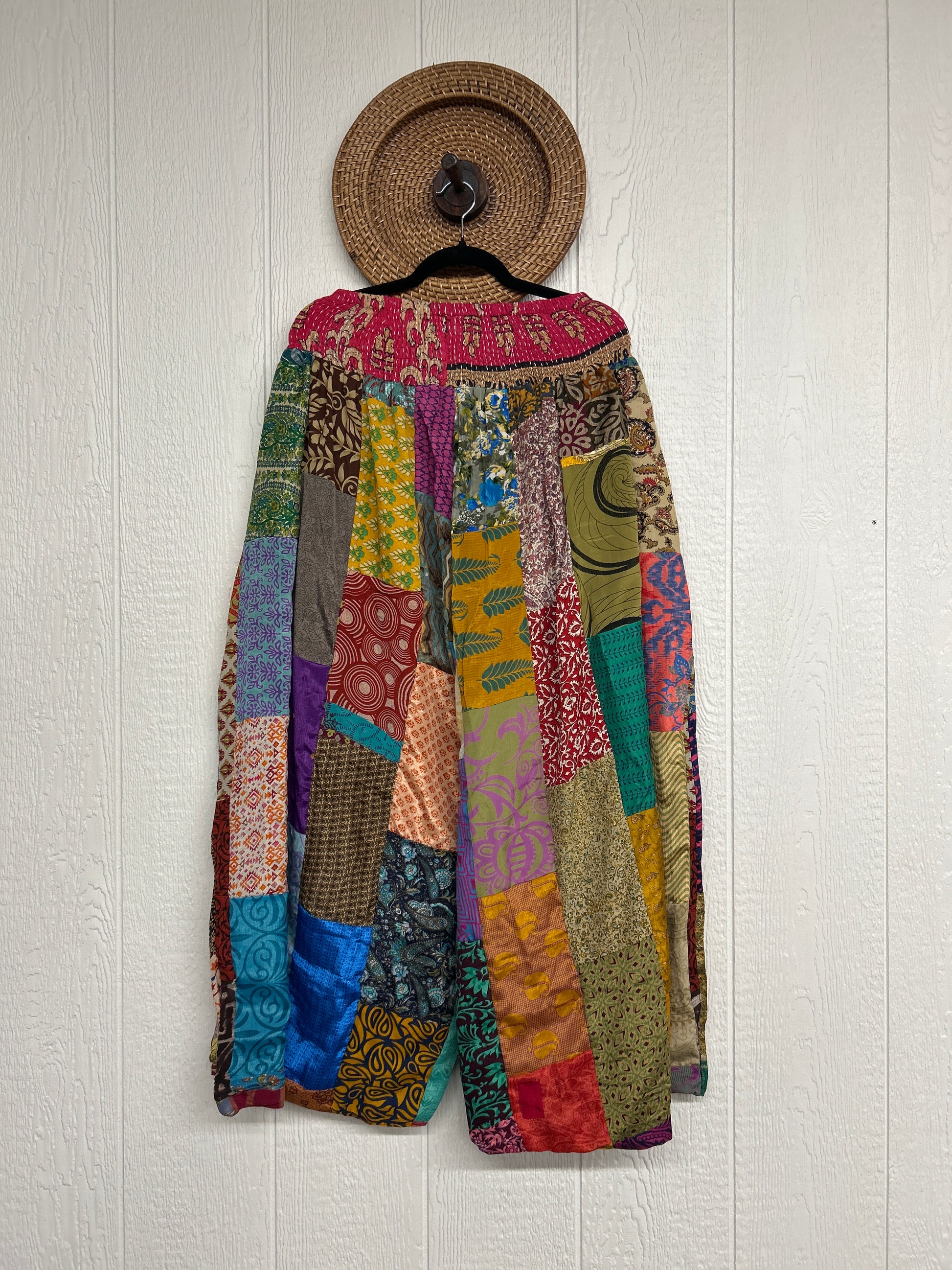 Features super wide legs that make your pants dance when you walk. Front slouchy pockets are deep enough to fill with your treasures. Vintage Rasgulla and Crepe Sari make up the beautiful patchwork featured on the outside with vintage cotton sari lining on the inside. Fully reversible and free size in all the ways!