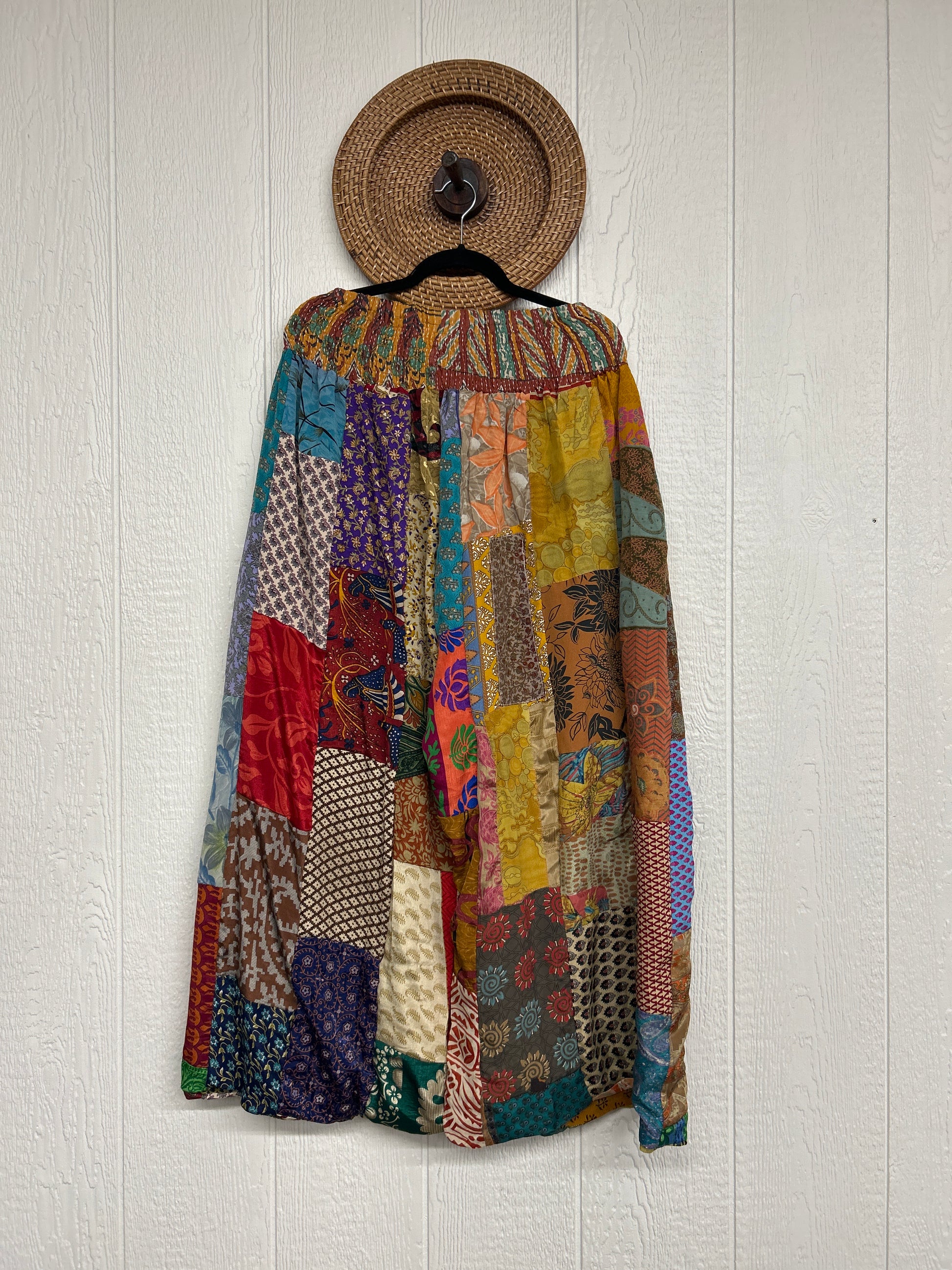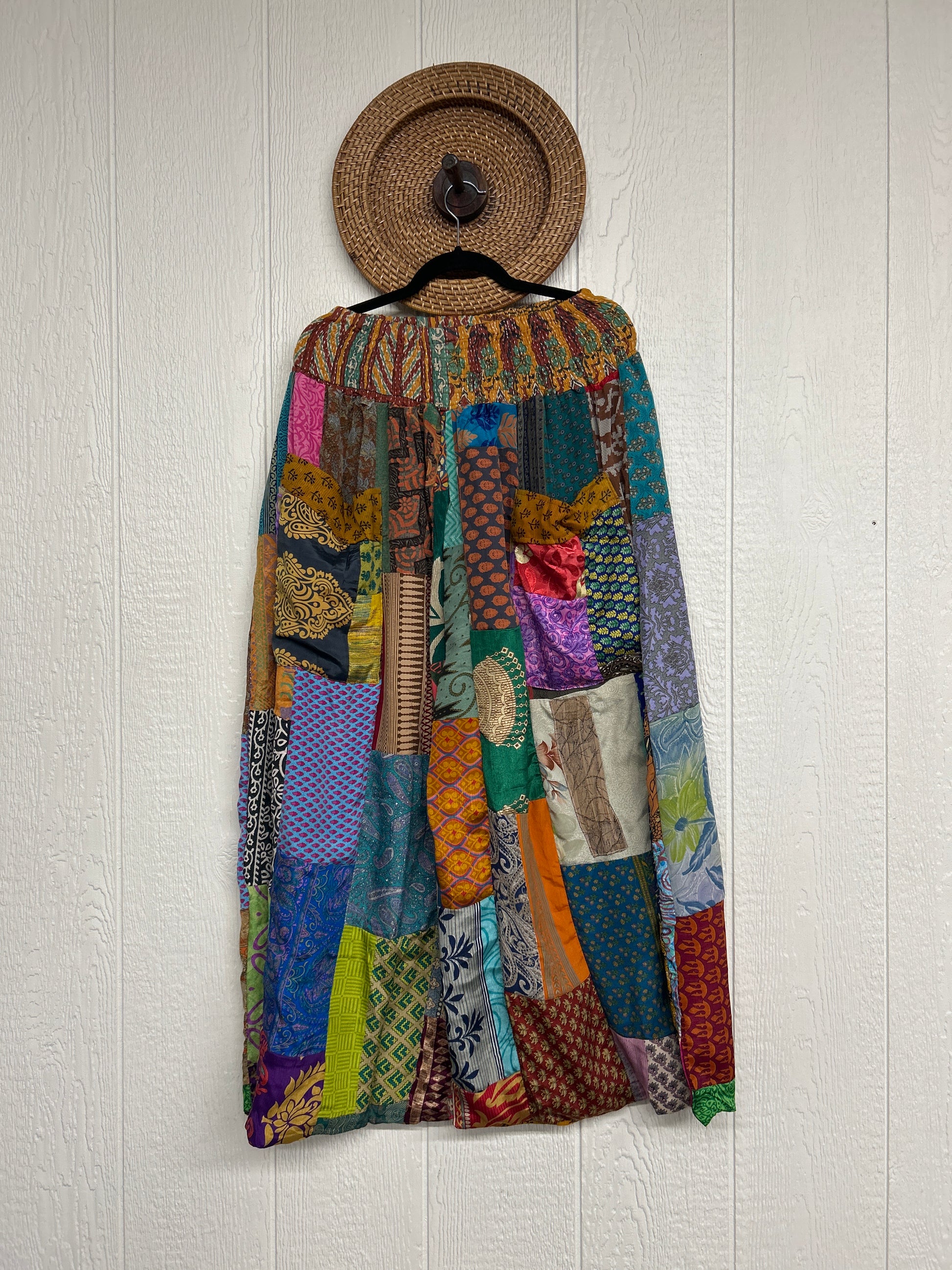 Features super wide legs that make your pants dance when you walk. Front slouchy pockets are deep enough to fill with your treasures. Vintage Rasgulla and Crepe Sari make up the beautiful patchwork featured on the outside with vintage cotton sari lining on the inside. Fully reversible and free size in all the ways!