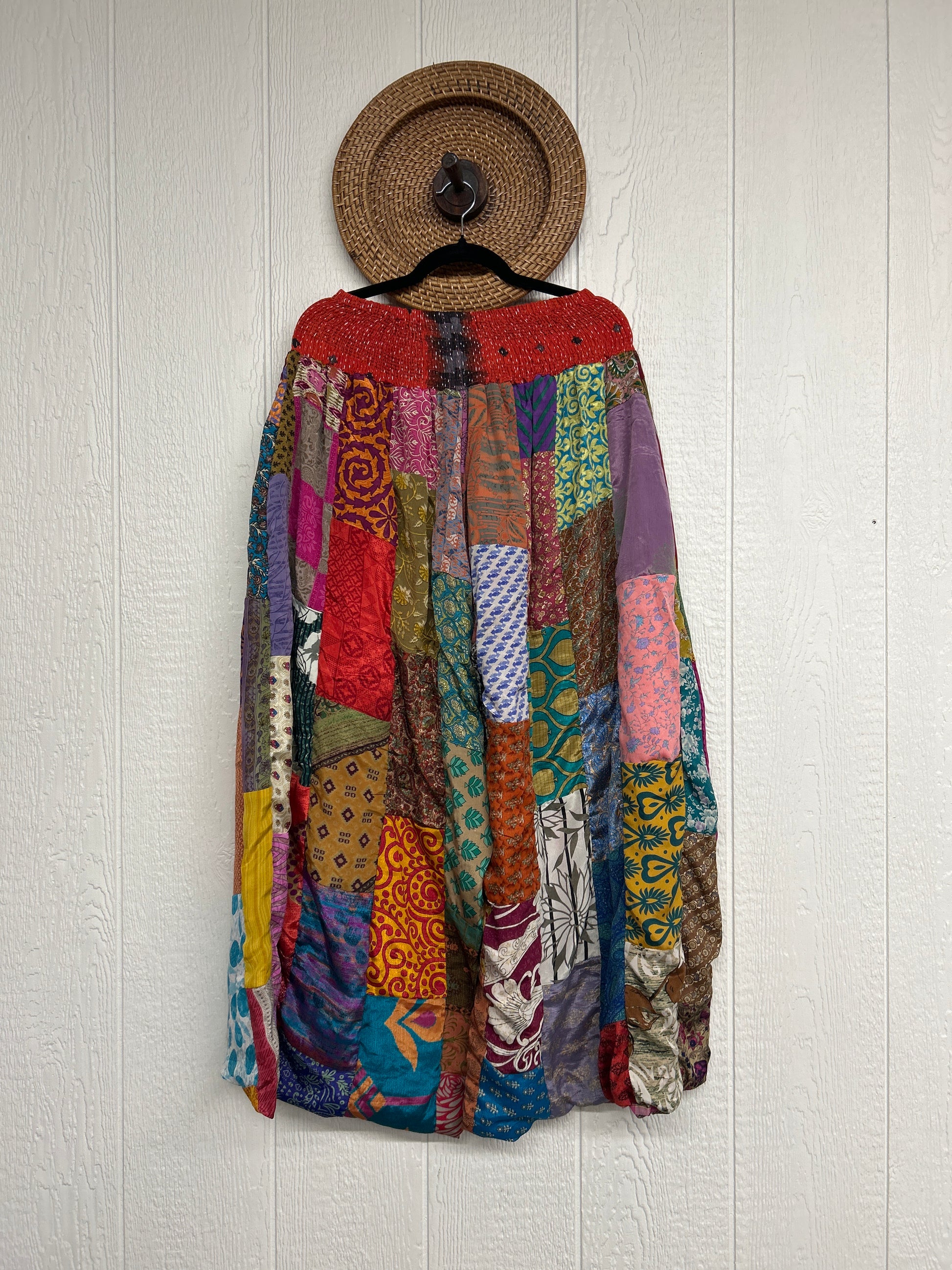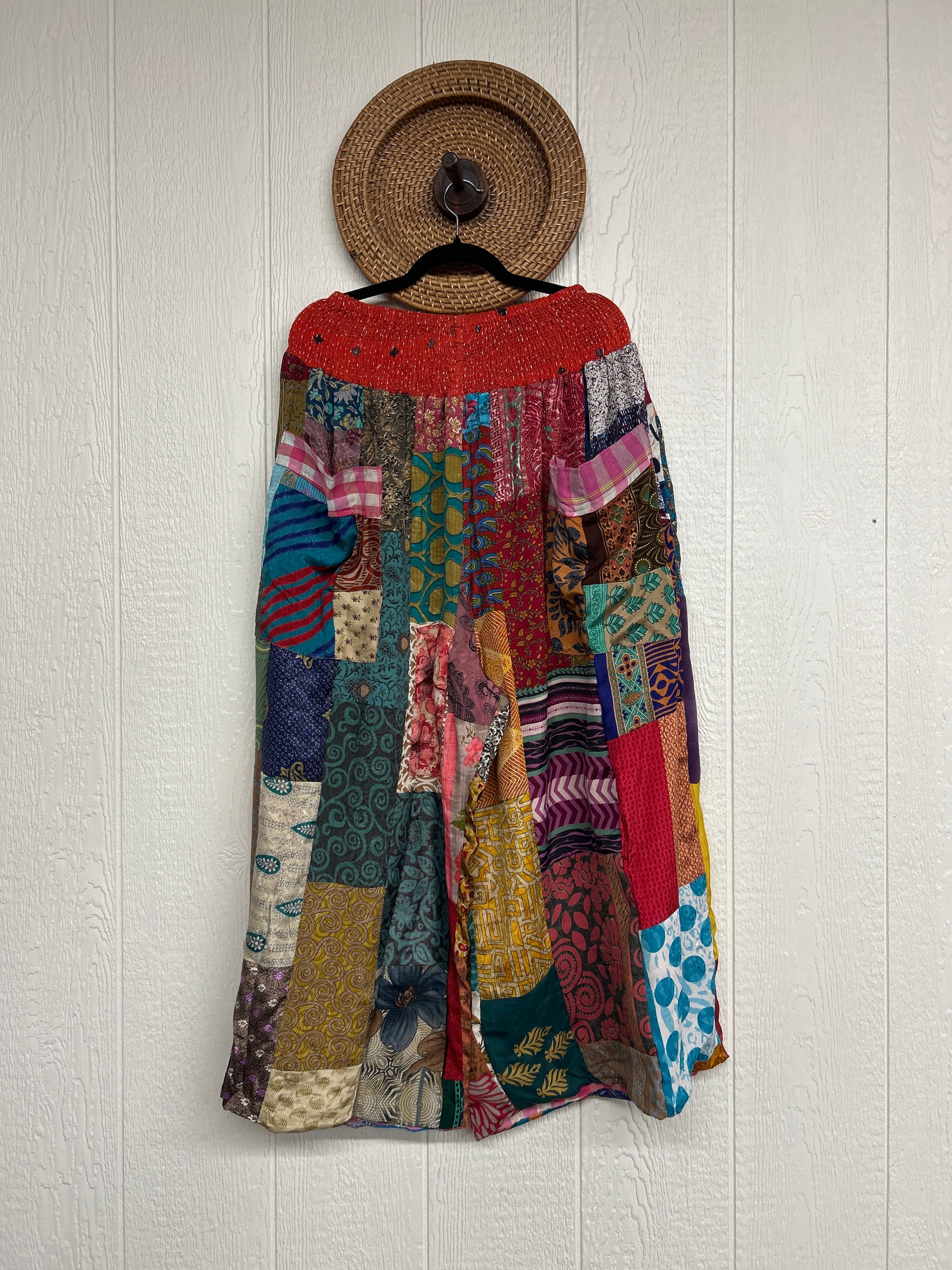 Features super wide legs that make your pants dance when you walk. Front slouchy pockets are deep enough to fill with your treasures. Vintage Rasgulla and Crepe Sari make up the beautiful patchwork featured on the outside with vintage cotton sari lining on the inside. Fully reversible and free size in all the ways!