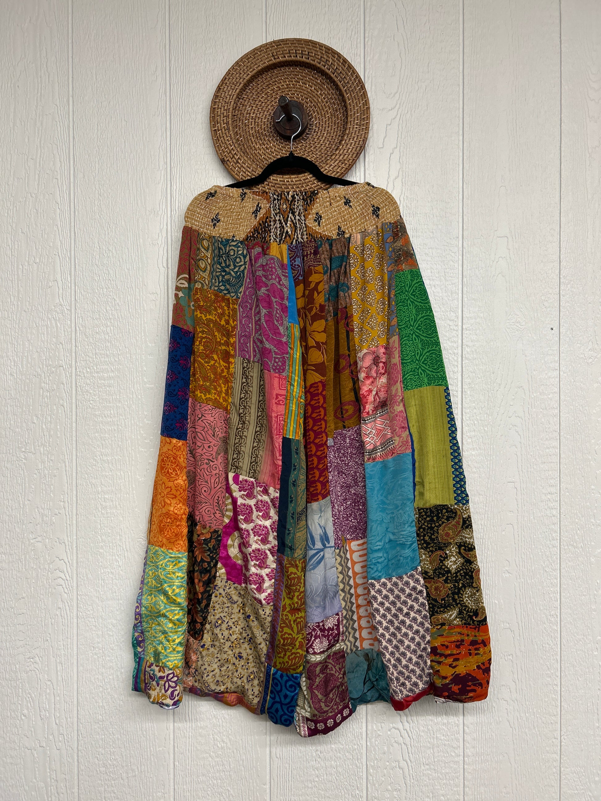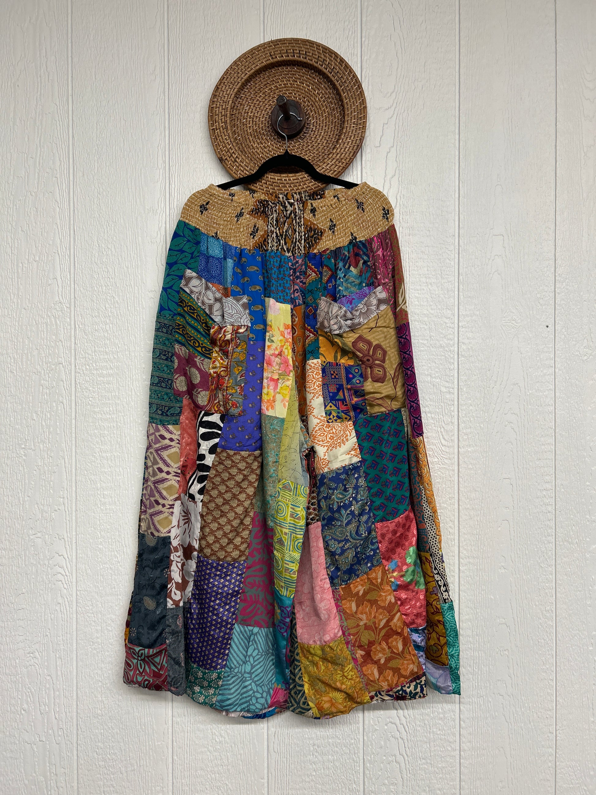 Features super wide legs that make your pants dance when you walk. Front slouchy pockets are deep enough to fill with your treasures. Vintage Rasgulla and Crepe Sari make up the beautiful patchwork featured on the outside with vintage cotton sari lining on the inside. Fully reversible and free size in all the ways!