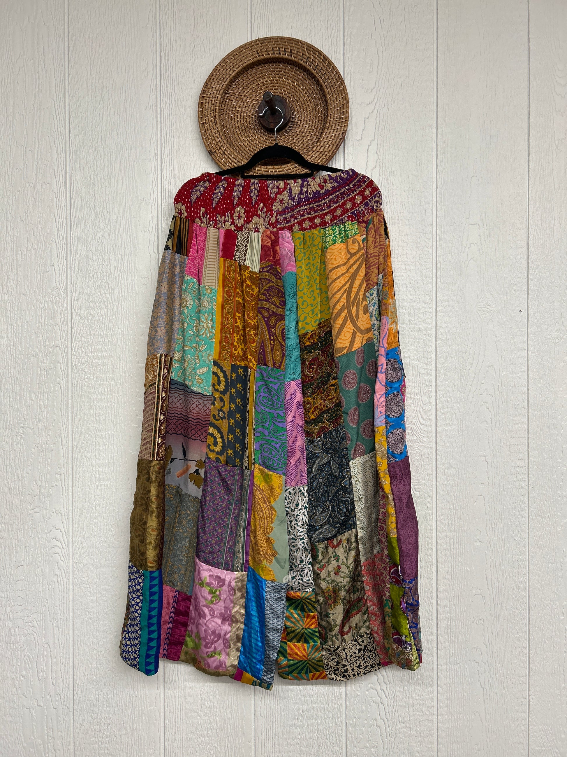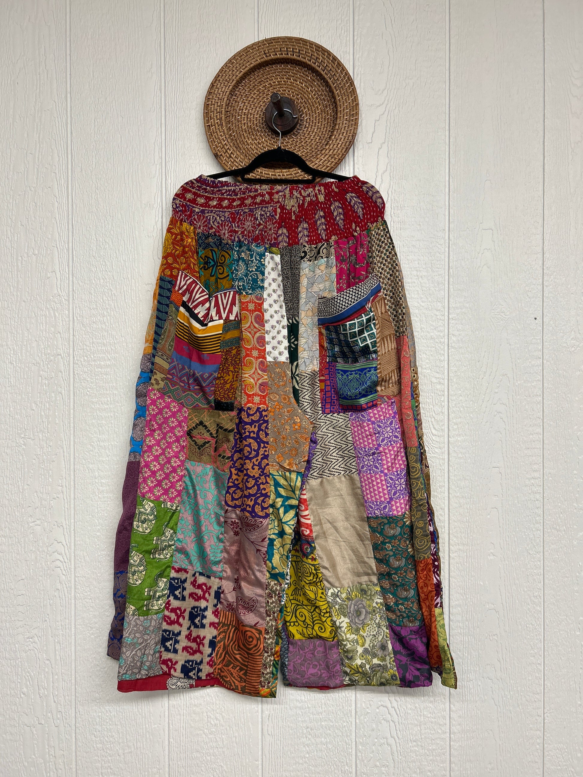 Features super wide legs that make your pants dance when you walk. Front slouchy pockets are deep enough to fill with your treasures. Vintage Rasgulla and Crepe Sari make up the beautiful patchwork featured on the outside with vintage cotton sari lining on the inside. Fully reversible and free size in all the ways!