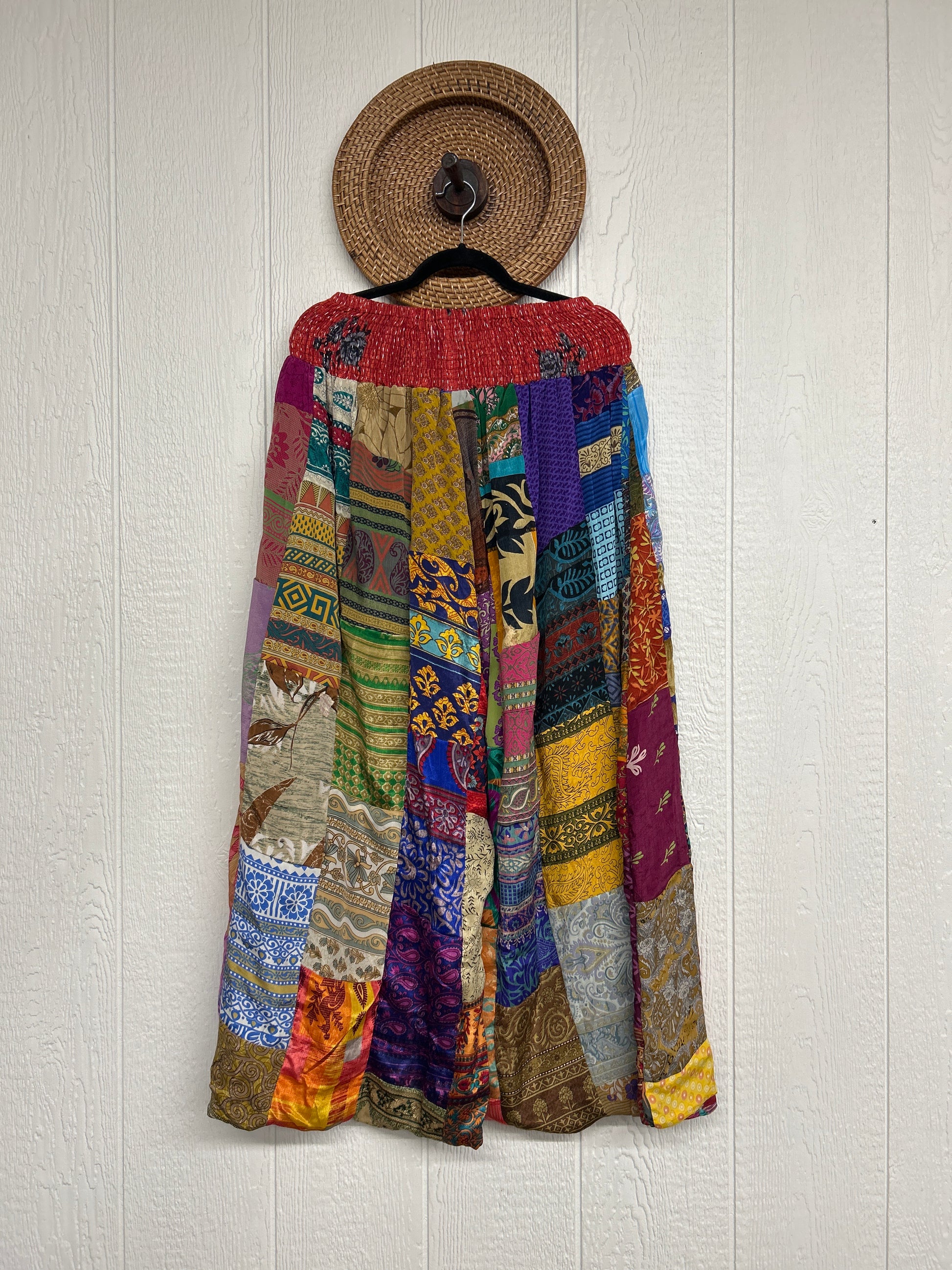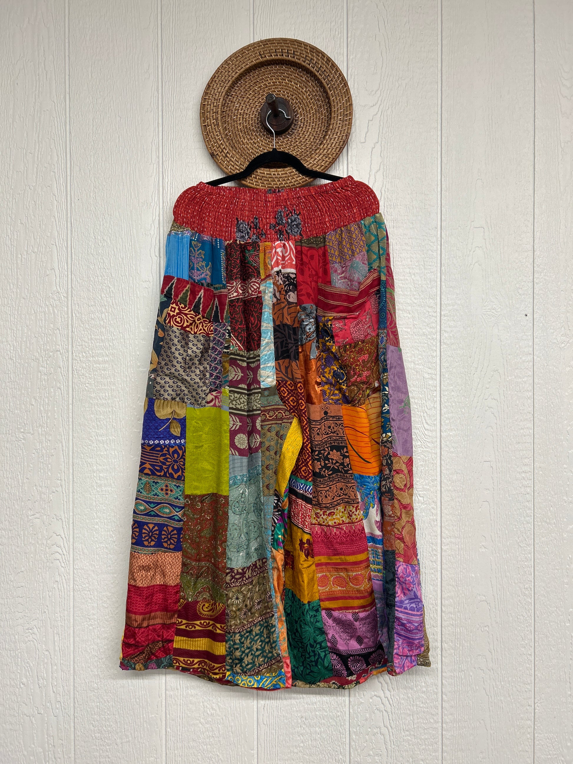 Features super wide legs that make your pants dance when you walk. Front slouchy pockets are deep enough to fill with your treasures. Vintage Rasgulla and Crepe Sari make up the beautiful patchwork featured on the outside with vintage cotton sari lining on the inside. Fully reversible and free size in all the ways!