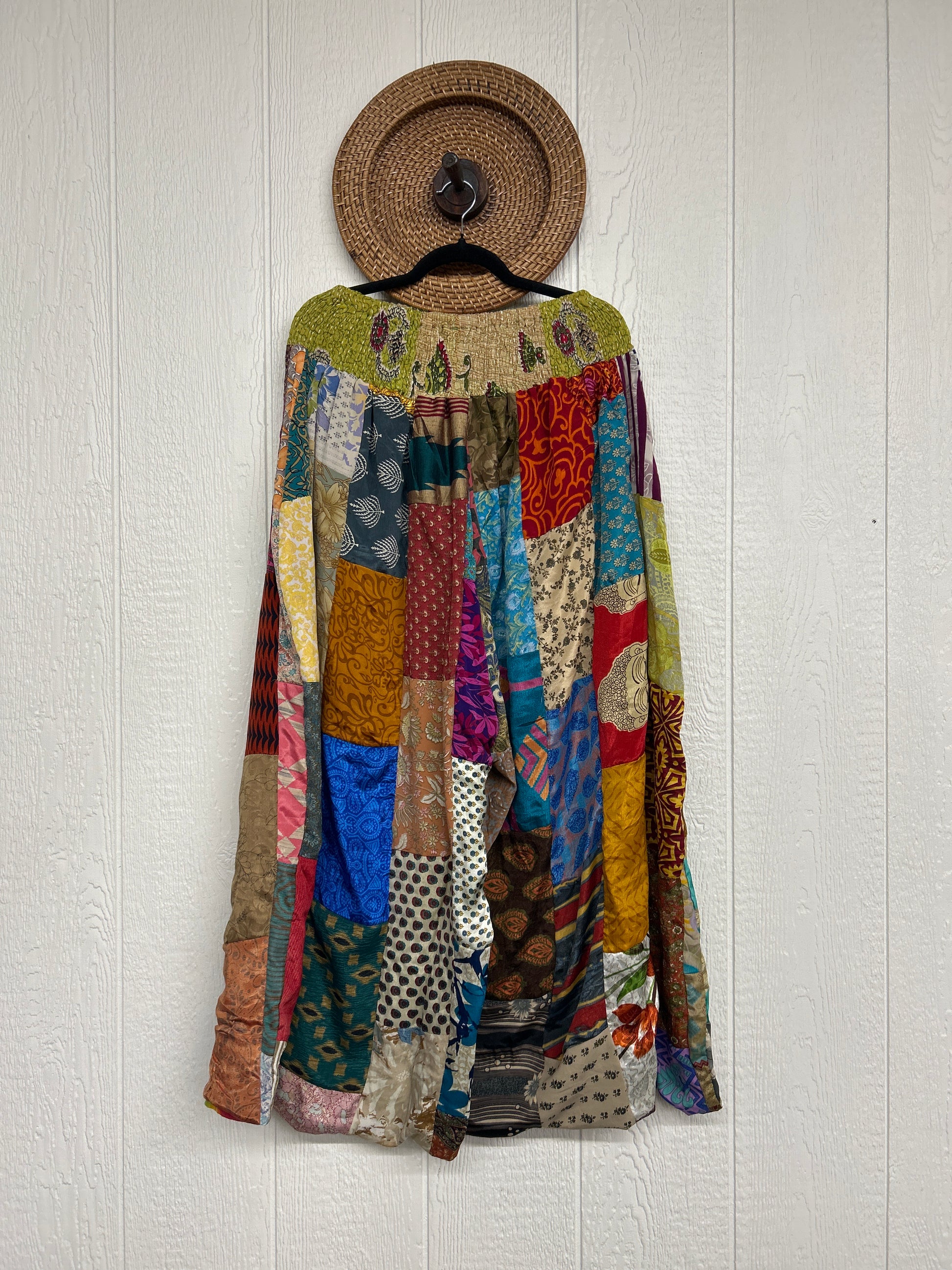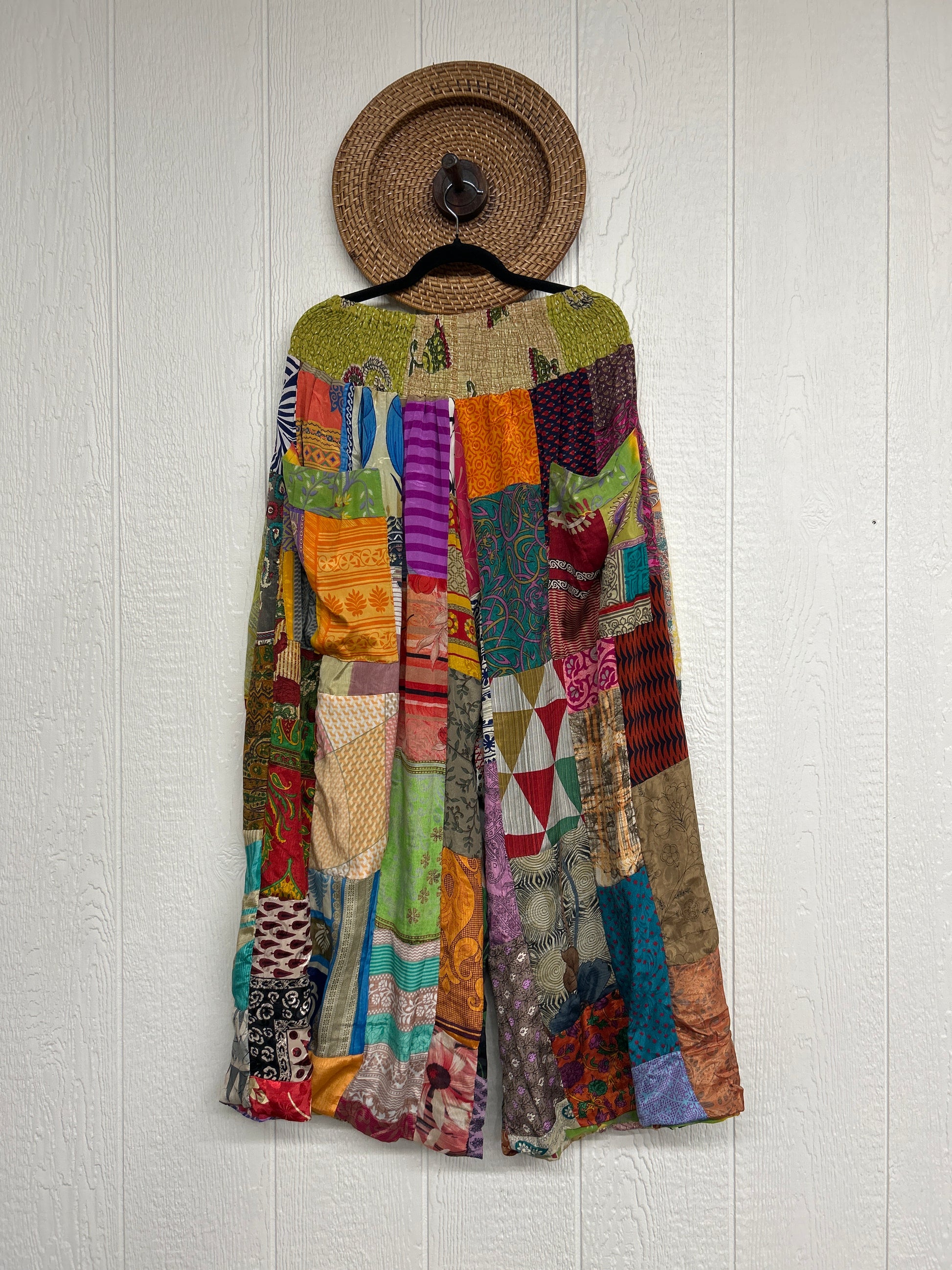 Features super wide legs that make your pants dance when you walk. Front slouchy pockets are deep enough to fill with your treasures. Vintage Rasgulla and Crepe Sari make up the beautiful patchwork featured on the outside with vintage cotton sari lining on the inside. Fully reversible and free size in all the ways!