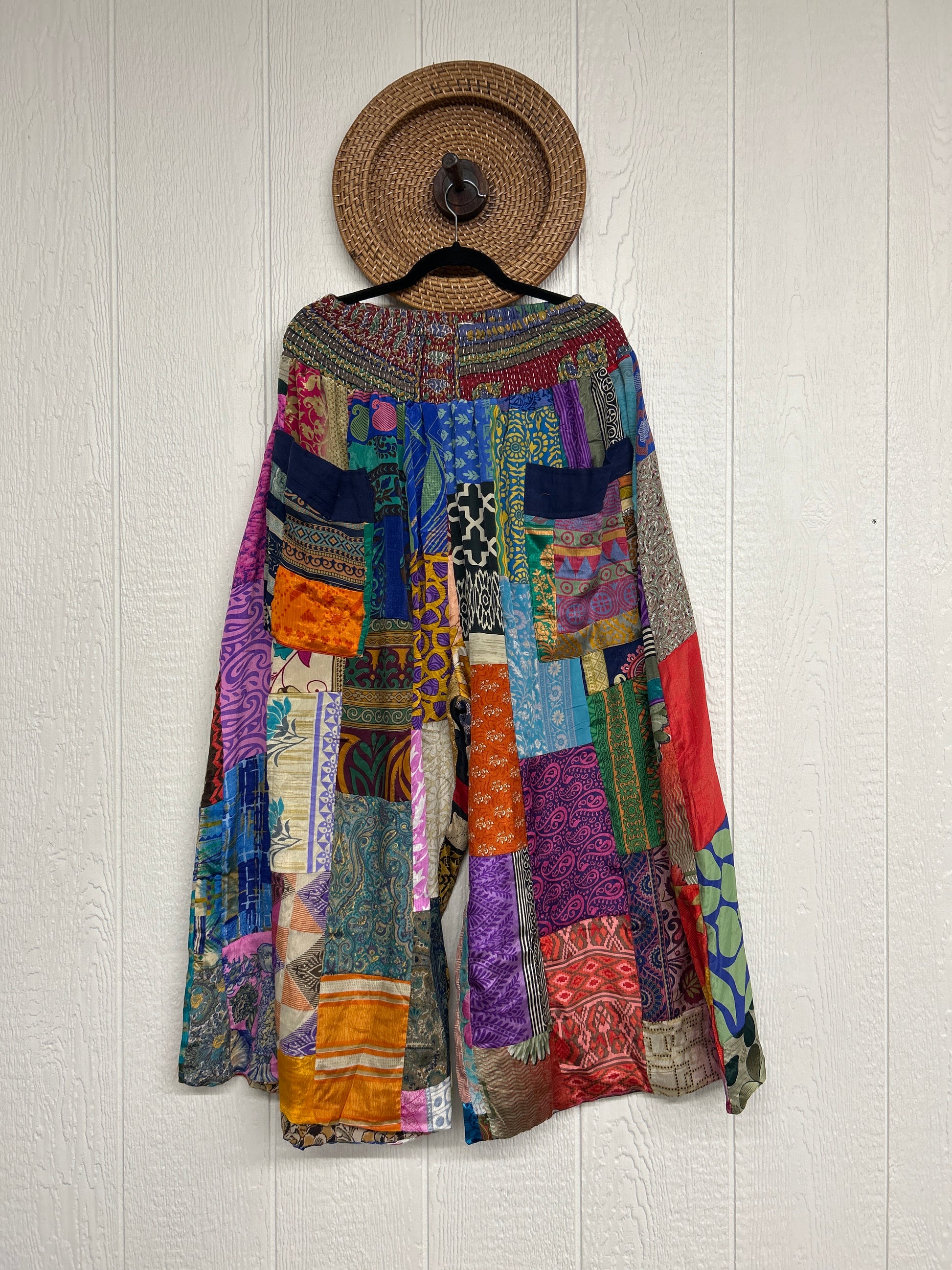 Features super wide legs that make your pants dance when you walk. Front slouchy pockets are deep enough to fill with your treasures. Vintage Rasgulla and Crepe Sari make up the beautiful patchwork featured on the outside with vintage cotton sari lining on the inside. Fully reversible and free size in all the ways!