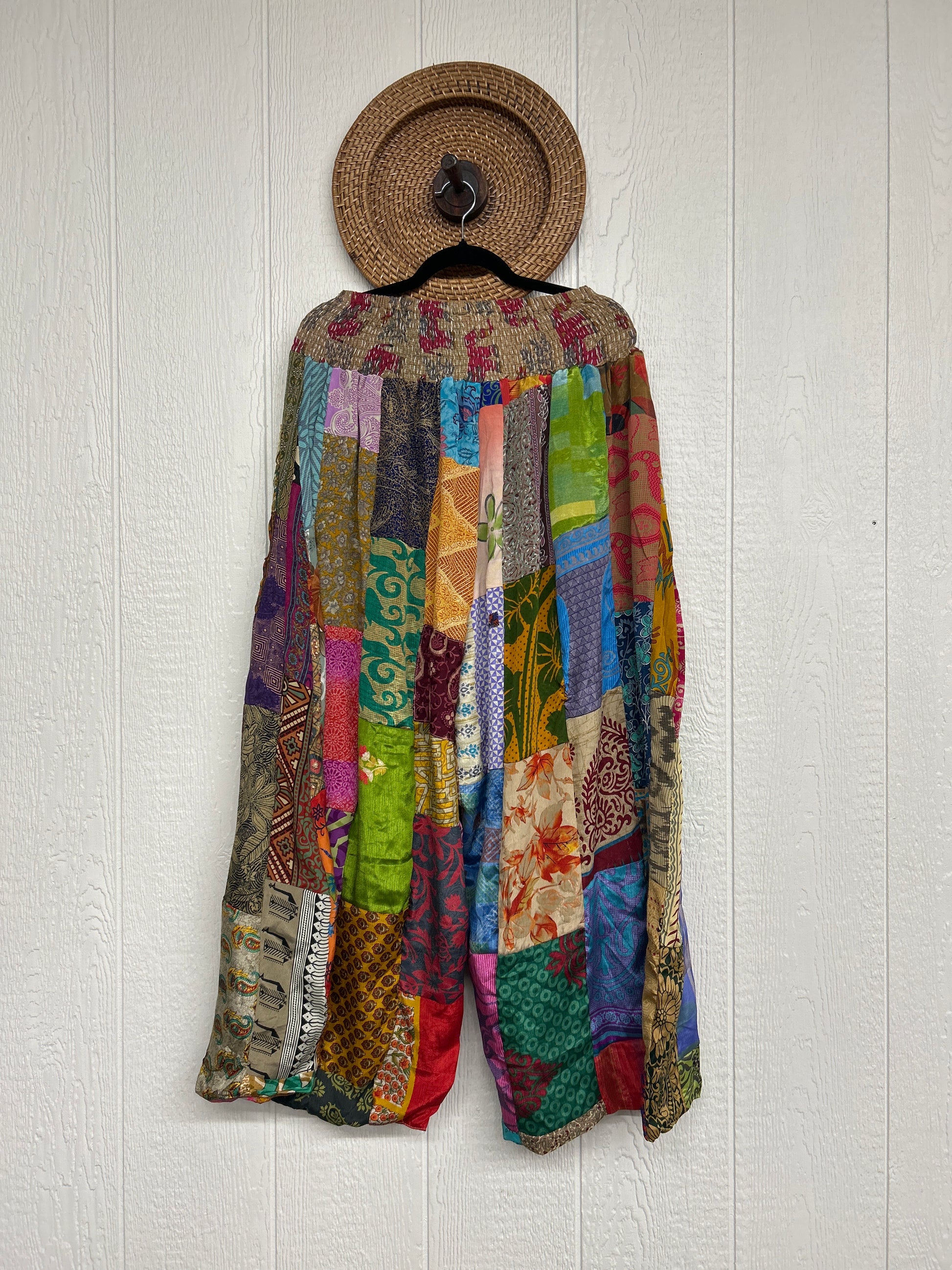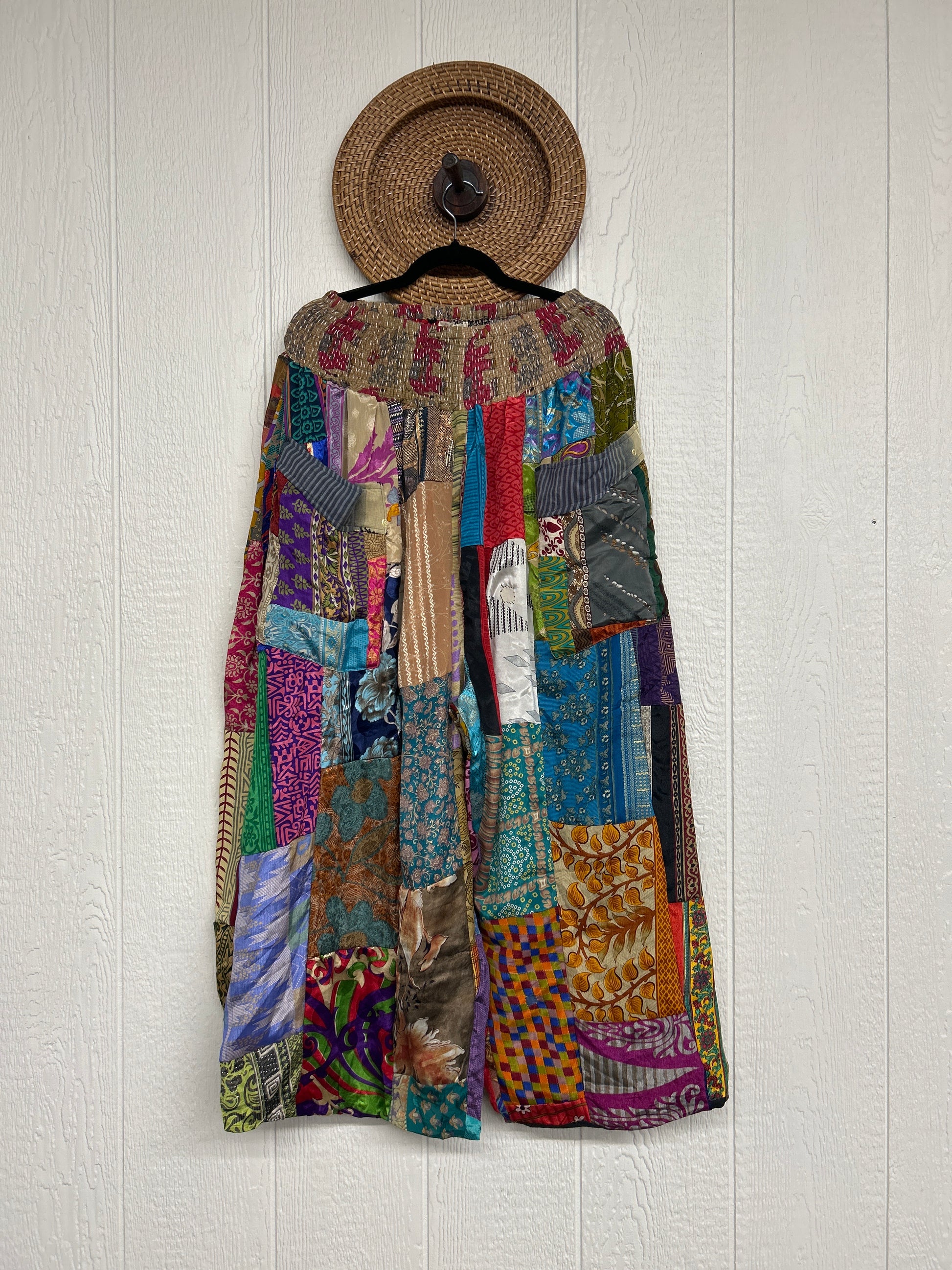 Features super wide legs that make your pants dance when you walk. Front slouchy pockets are deep enough to fill with your treasures. Vintage Rasgulla and Crepe Sari make up the beautiful patchwork featured on the outside with vintage cotton sari lining on the inside. Fully reversible and free size in all the ways!