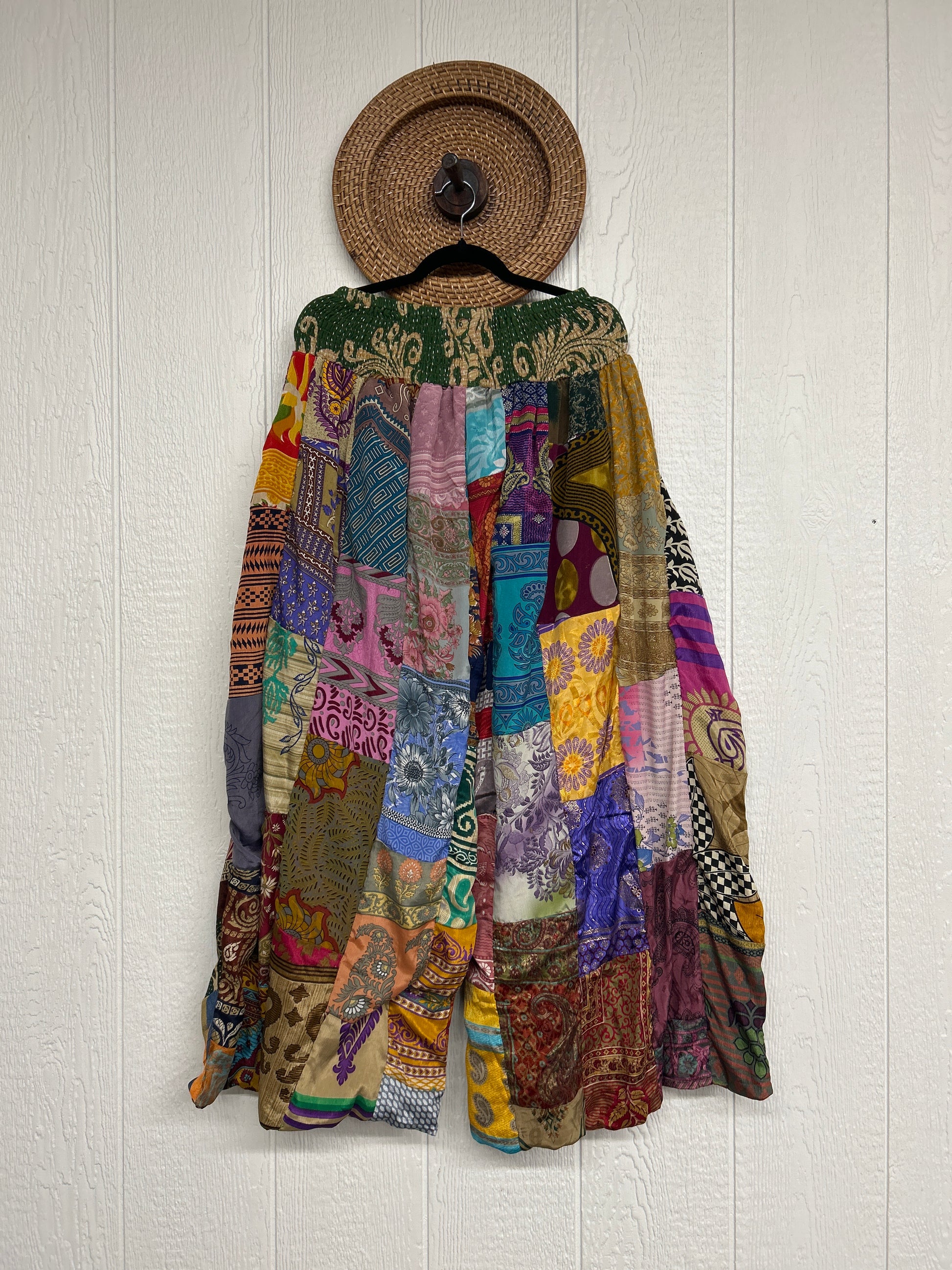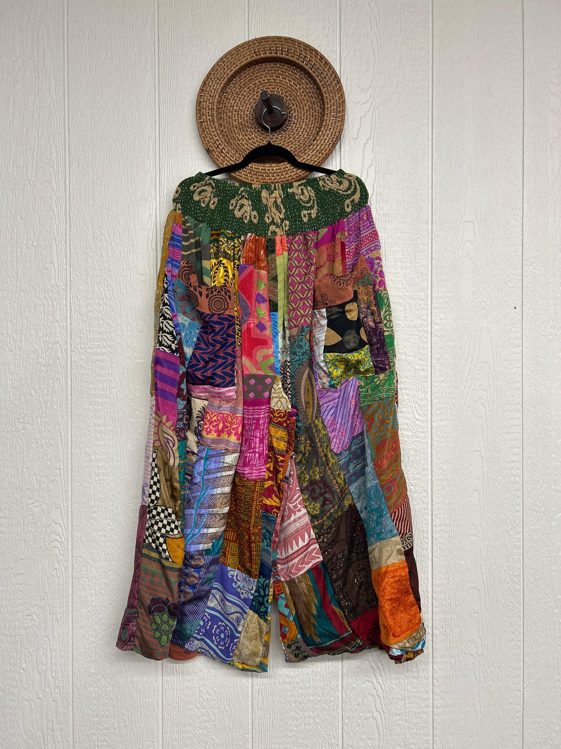 Features super wide legs that make your pants dance when you walk. Front slouchy pockets are deep enough to fill with your treasures. Vintage Rasgulla and Crepe Sari make up the beautiful patchwork featured on the outside with vintage cotton sari lining on the inside. Fully reversible and free size in all the ways!
