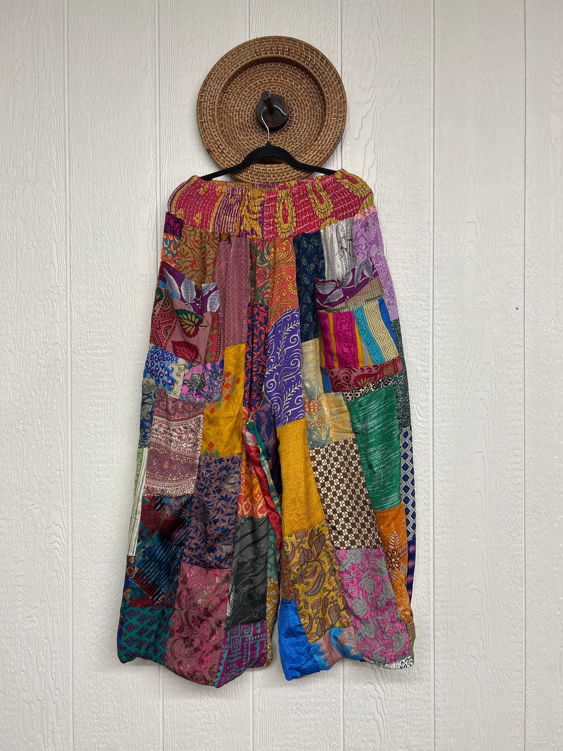 Features super wide legs that make your pants dance when you walk. Front slouchy pockets are deep enough to fill with your treasures. Vintage Rasgulla and Crepe Sari make up the beautiful patchwork featured on the outside with vintage cotton sari lining on the inside. Fully reversible and free size in all the ways!