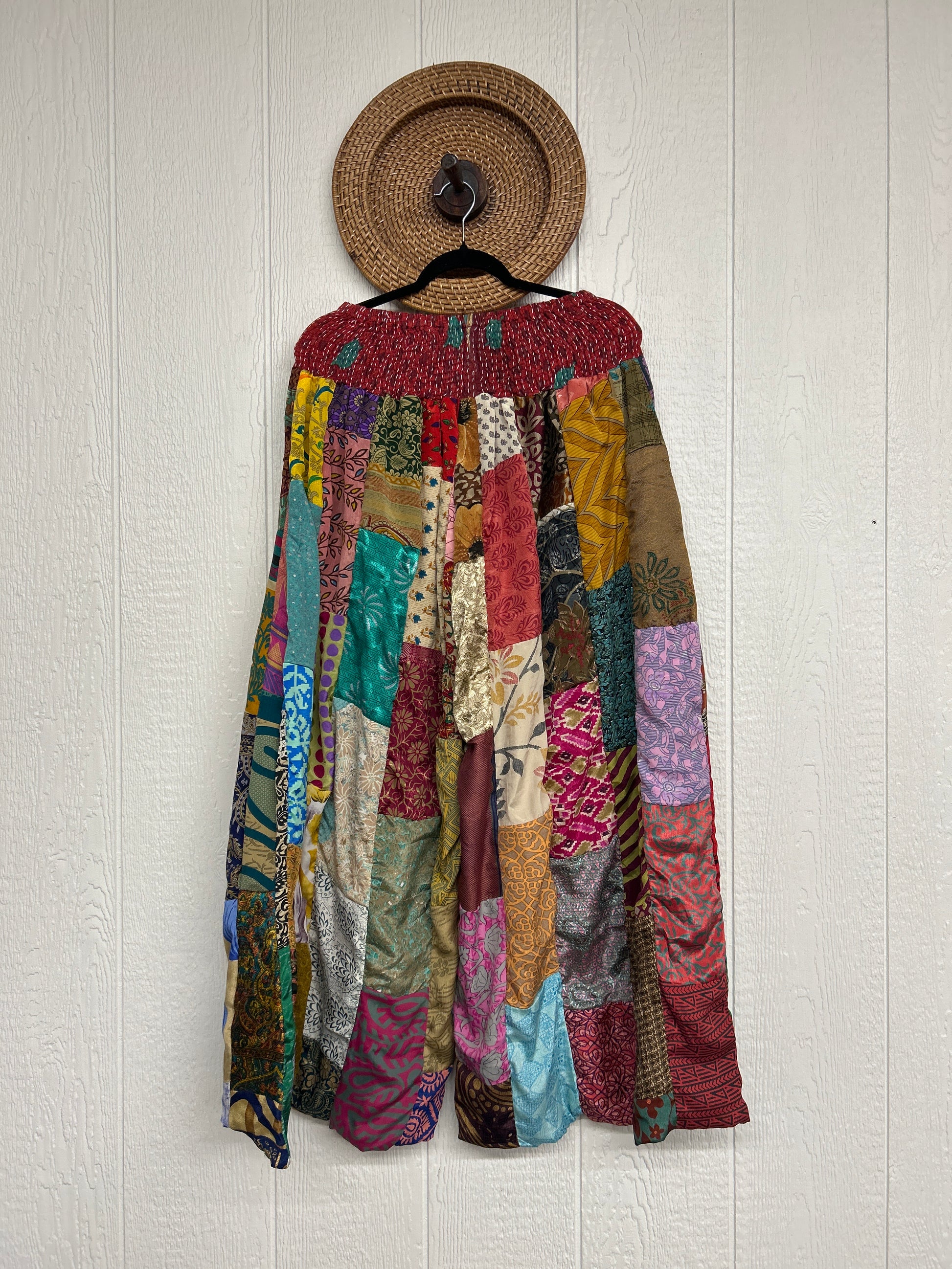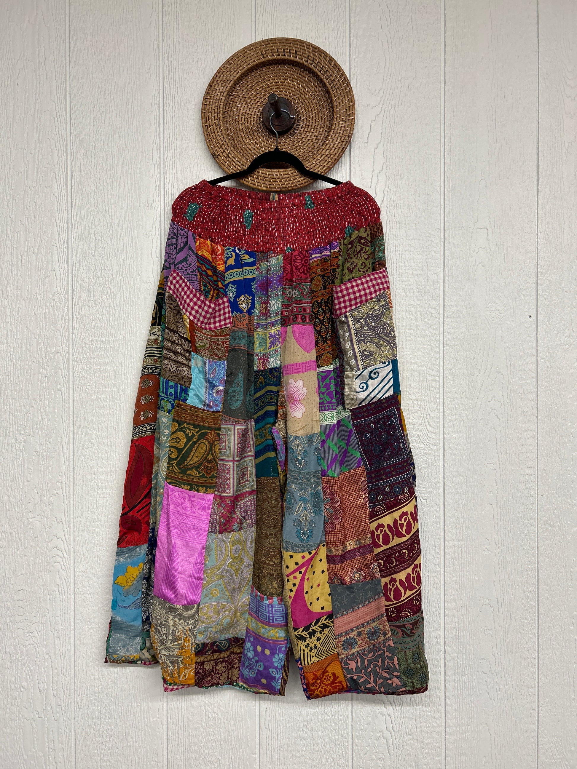 Features super wide legs that make your pants dance when you walk. Front slouchy pockets are deep enough to fill with your treasures. Vintage Rasgulla and Crepe Sari make up the beautiful patchwork featured on the outside with vintage cotton sari lining on the inside. Fully reversible and free size in all the ways!
