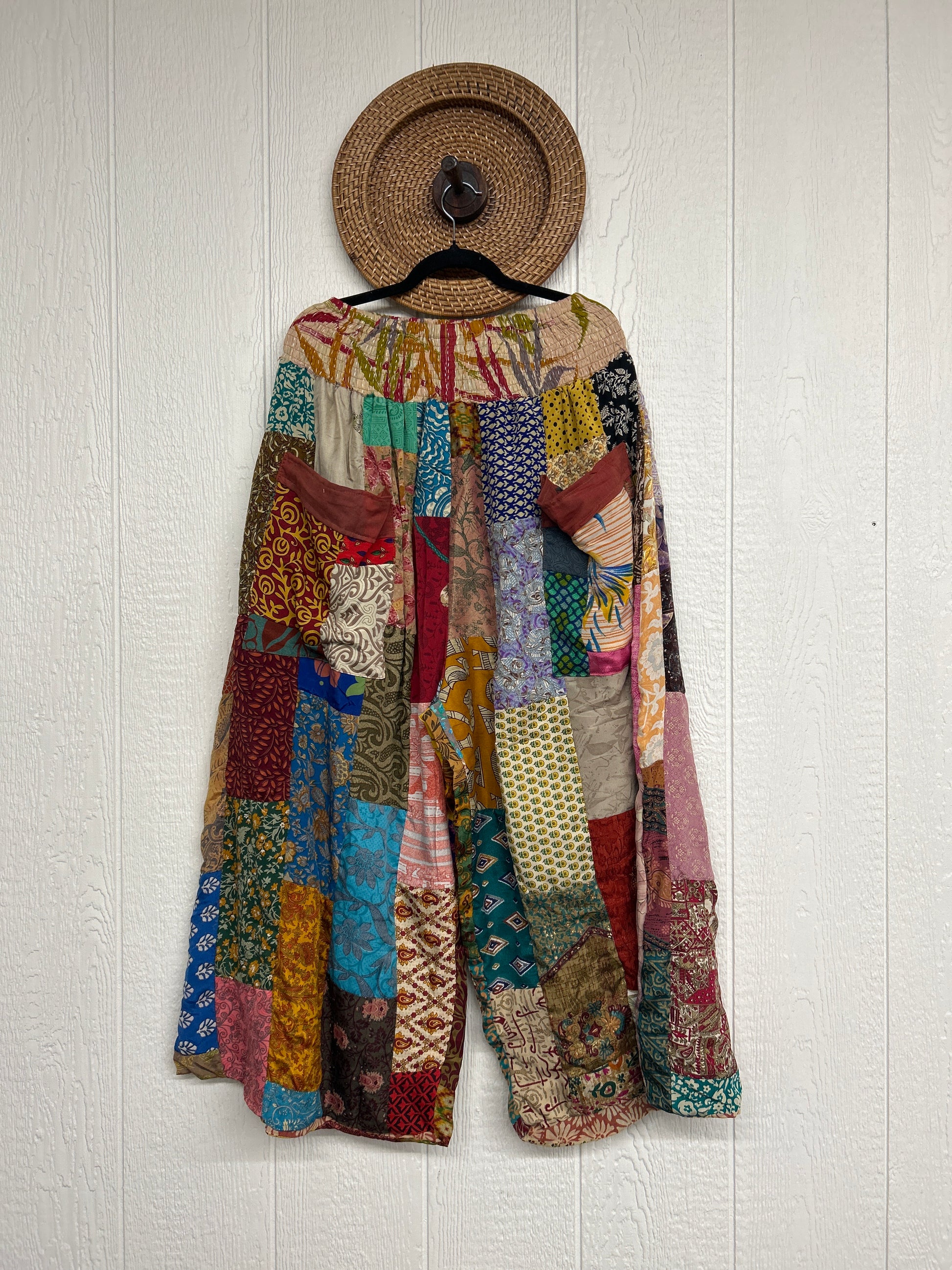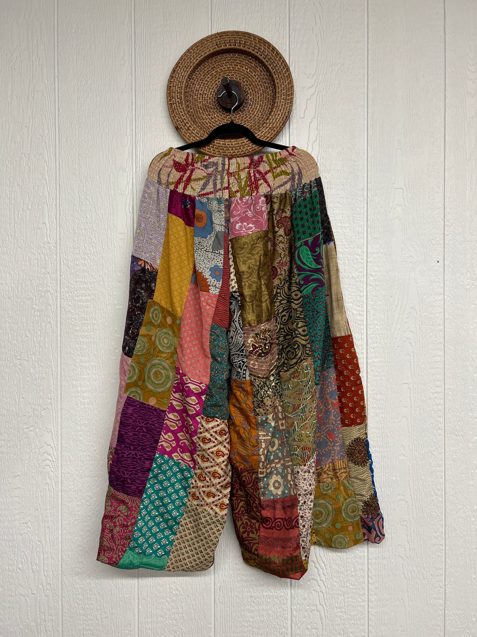 Features super wide legs that make your pants dance when you walk. Front slouchy pockets are deep enough to fill with your treasures. Vintage Rasgulla and Crepe Sari make up the beautiful patchwork featured on the outside with vintage cotton sari lining on the inside. Fully reversible and free size in all the ways!