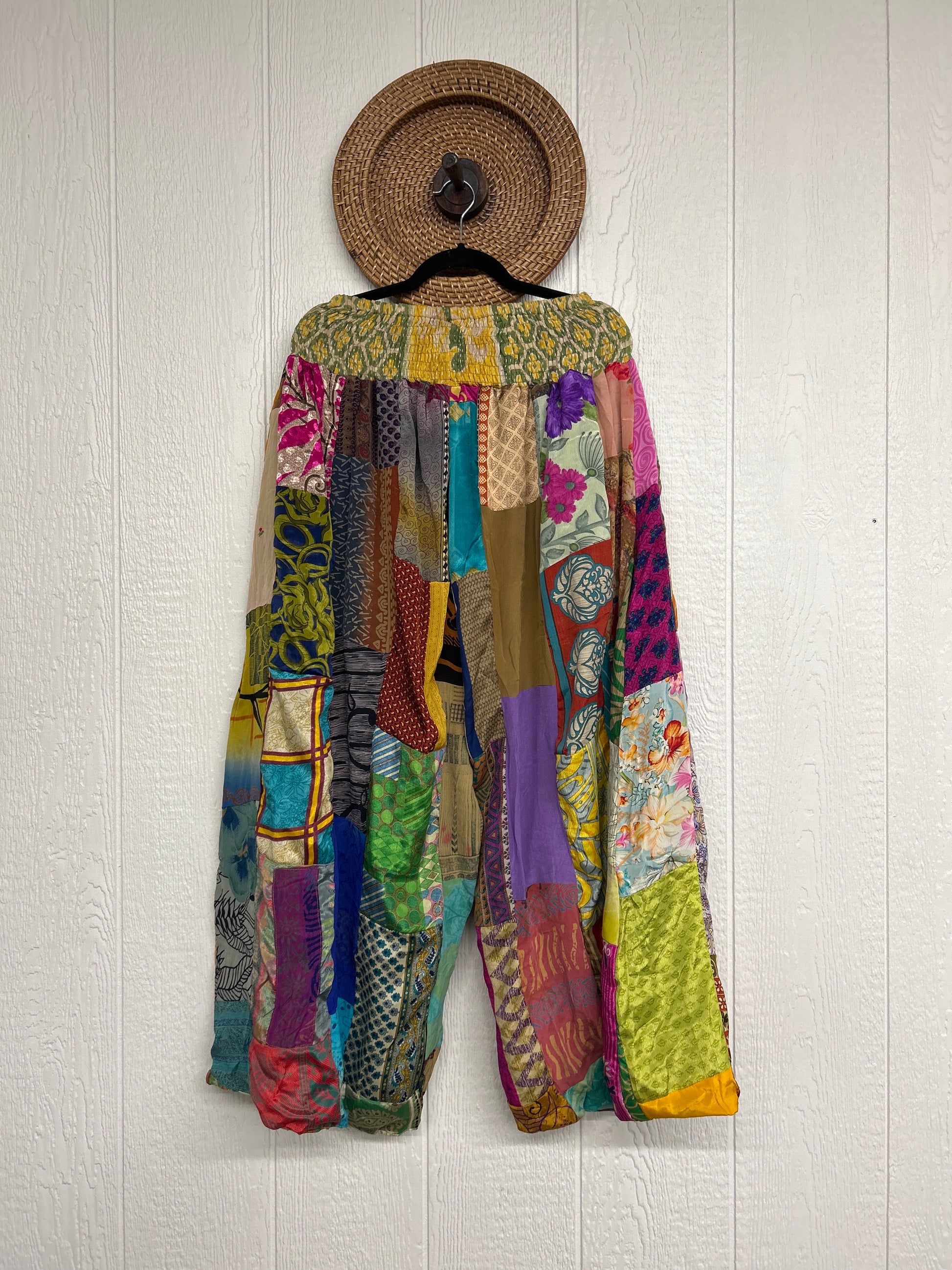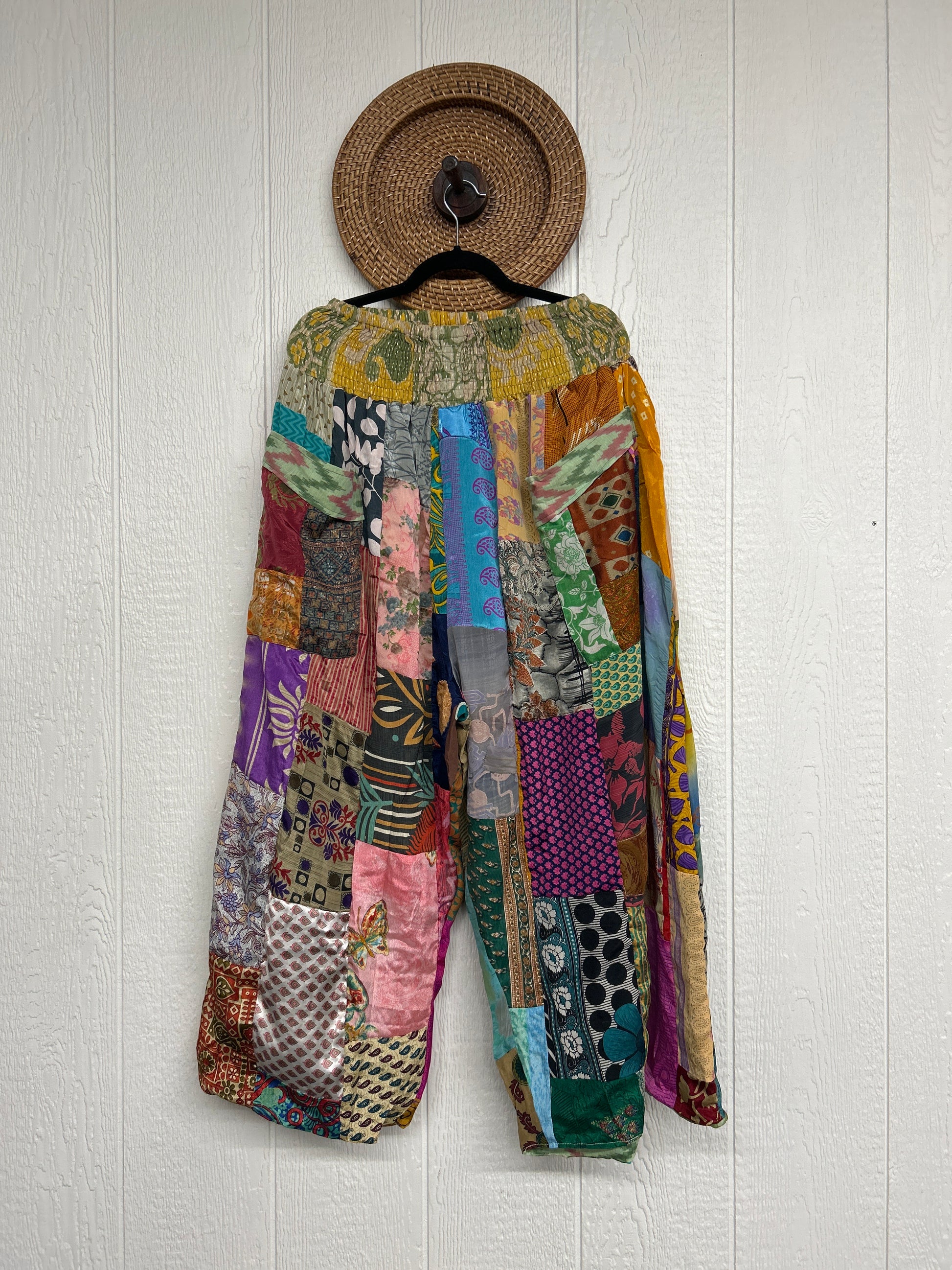 Features super wide legs that make your pants dance when you walk. Front slouchy pockets are deep enough to fill with your treasures. Vintage Rasgulla and Crepe Sari make up the beautiful patchwork featured on the outside with vintage cotton sari lining on the inside. Fully reversible and free size in all the ways!