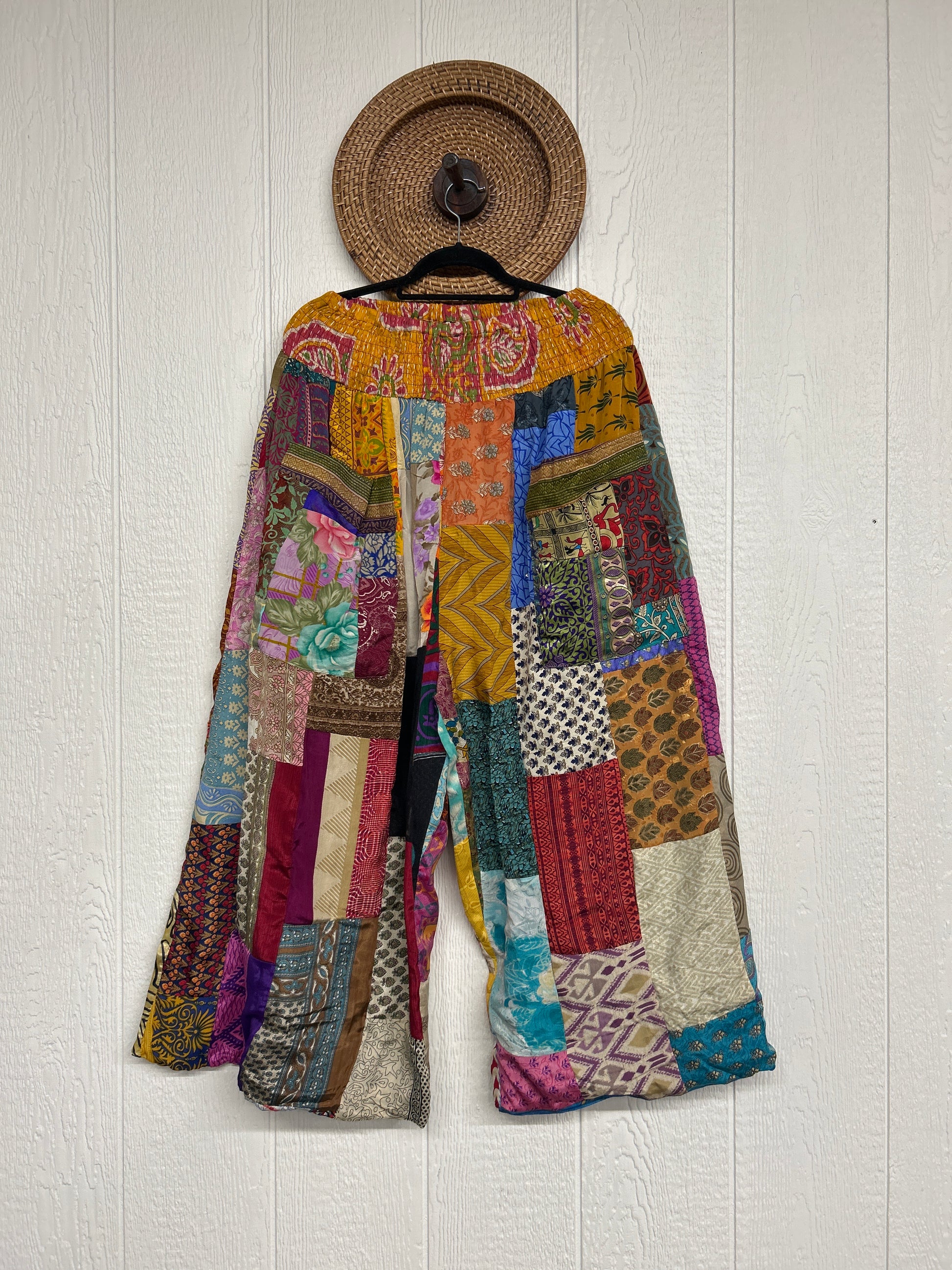 Features super wide legs that make your pants dance when you walk. Front slouchy pockets are deep enough to fill with your treasures. Vintage Rasgulla and Crepe Sari make up the beautiful patchwork featured on the outside with vintage cotton sari lining on the inside. Fully reversible and free size in all the ways!