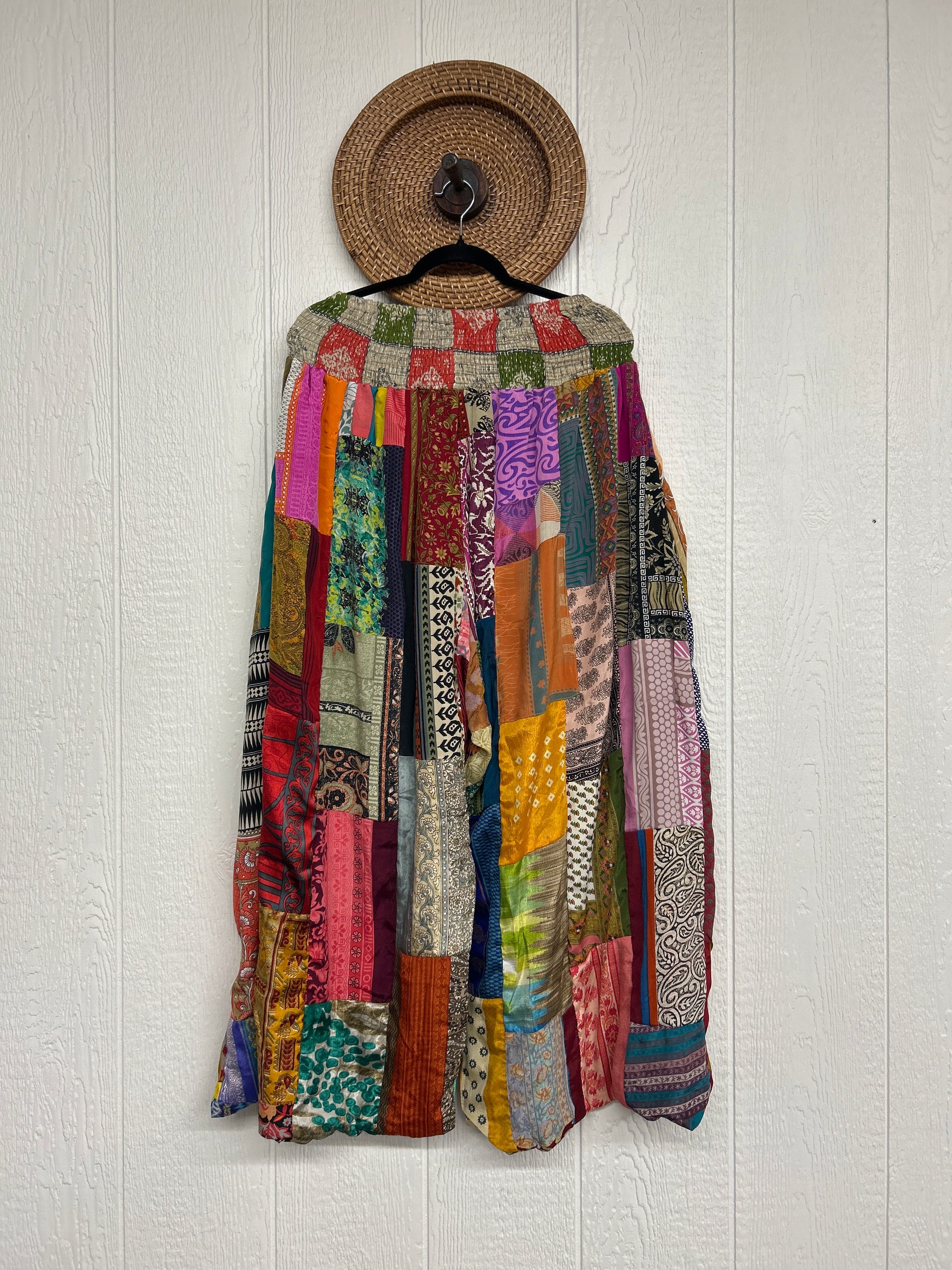 Features super wide legs that make your pants dance when you walk. Front slouchy pockets are deep enough to fill with your treasures. Vintage Rasgulla and Crepe Sari make up the beautiful patchwork featured on the outside with vintage cotton sari lining on the inside. Fully reversible and free size in all the ways!