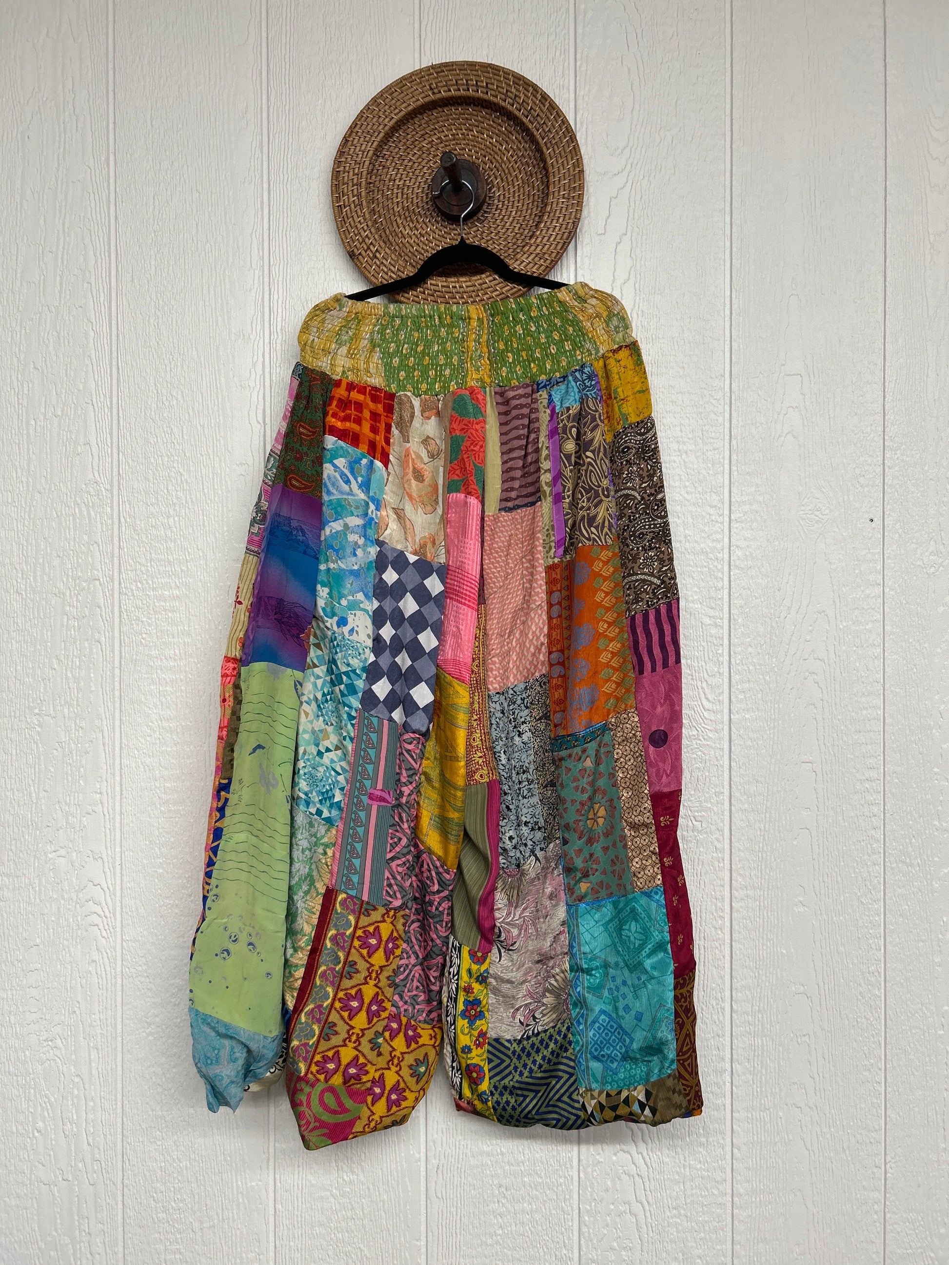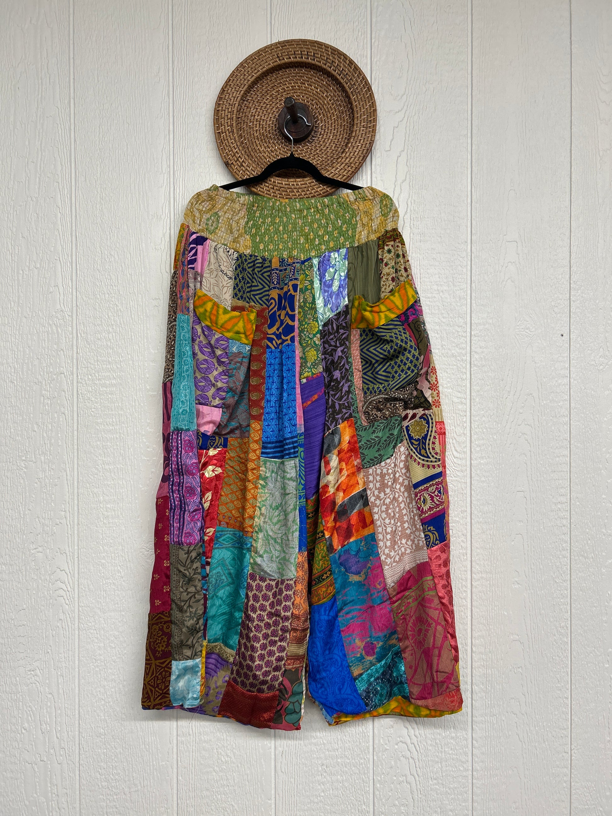 Features super wide legs that make your pants dance when you walk. Front slouchy pockets are deep enough to fill with your treasures. Vintage Rasgulla and Crepe Sari make up the beautiful patchwork featured on the outside with vintage cotton sari lining on the inside. Fully reversible and free size in all the ways!