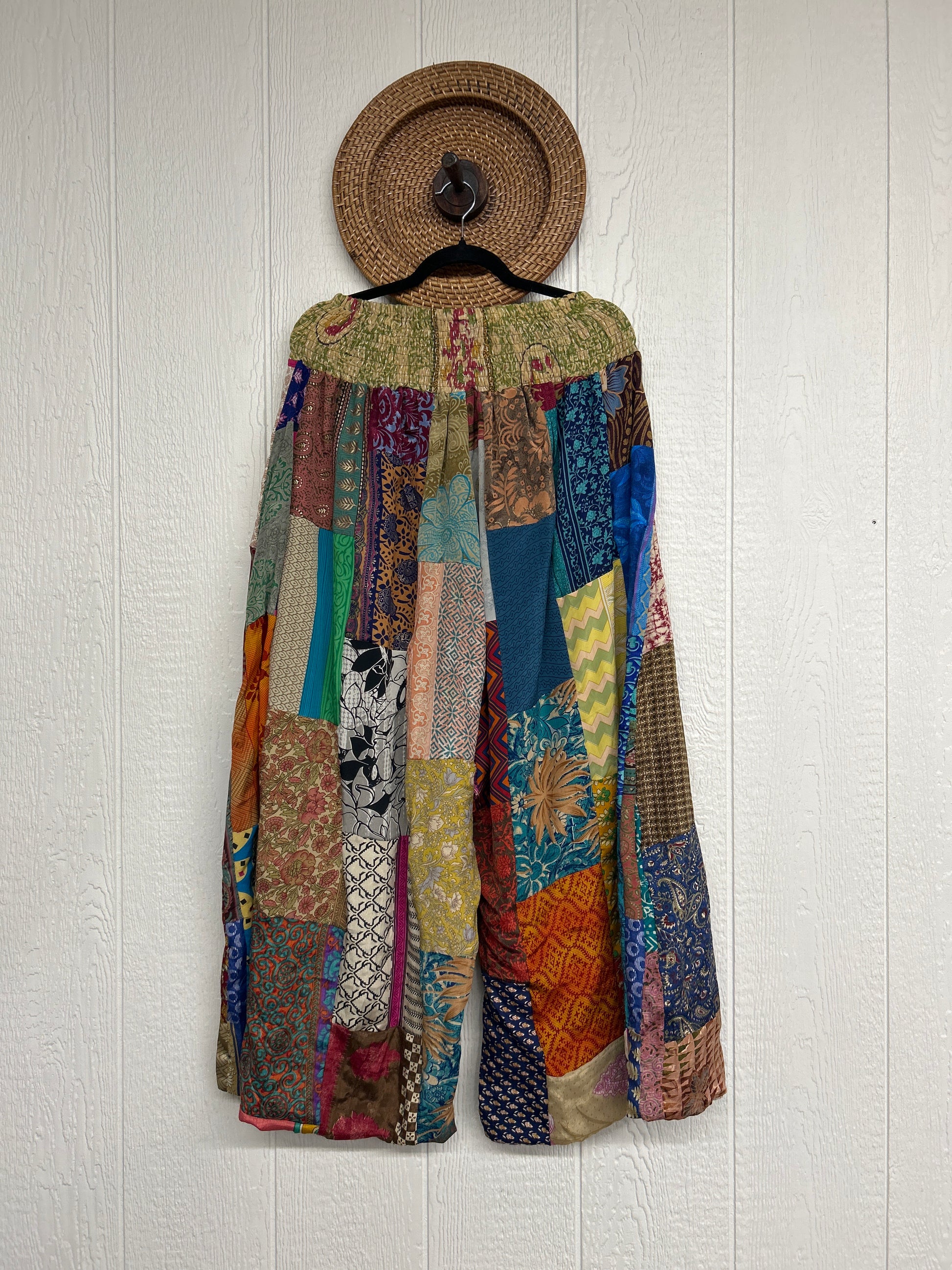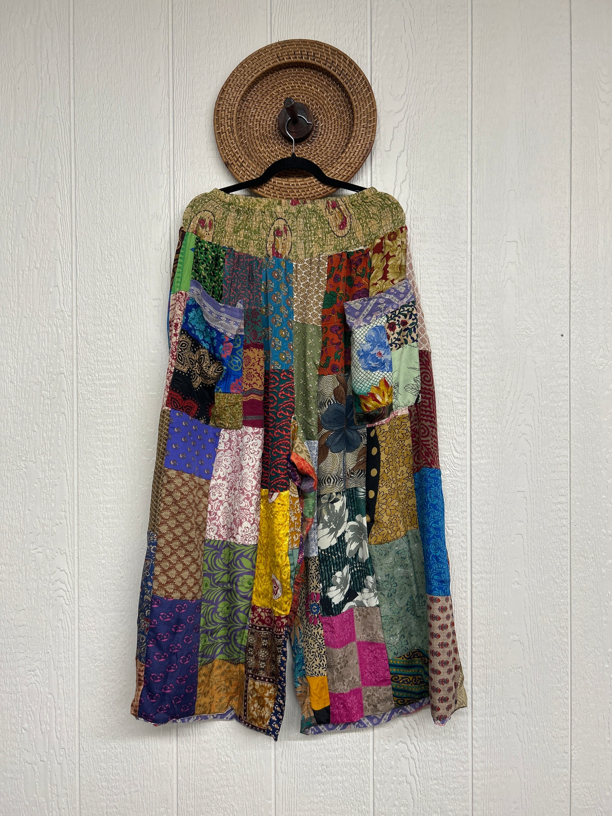 Features super wide legs that make your pants dance when you walk. Front slouchy pockets are deep enough to fill with your treasures. Vintage Rasgulla and Crepe Sari make up the beautiful patchwork featured on the outside with vintage cotton sari lining on the inside. Fully reversible and free size in all the ways!
