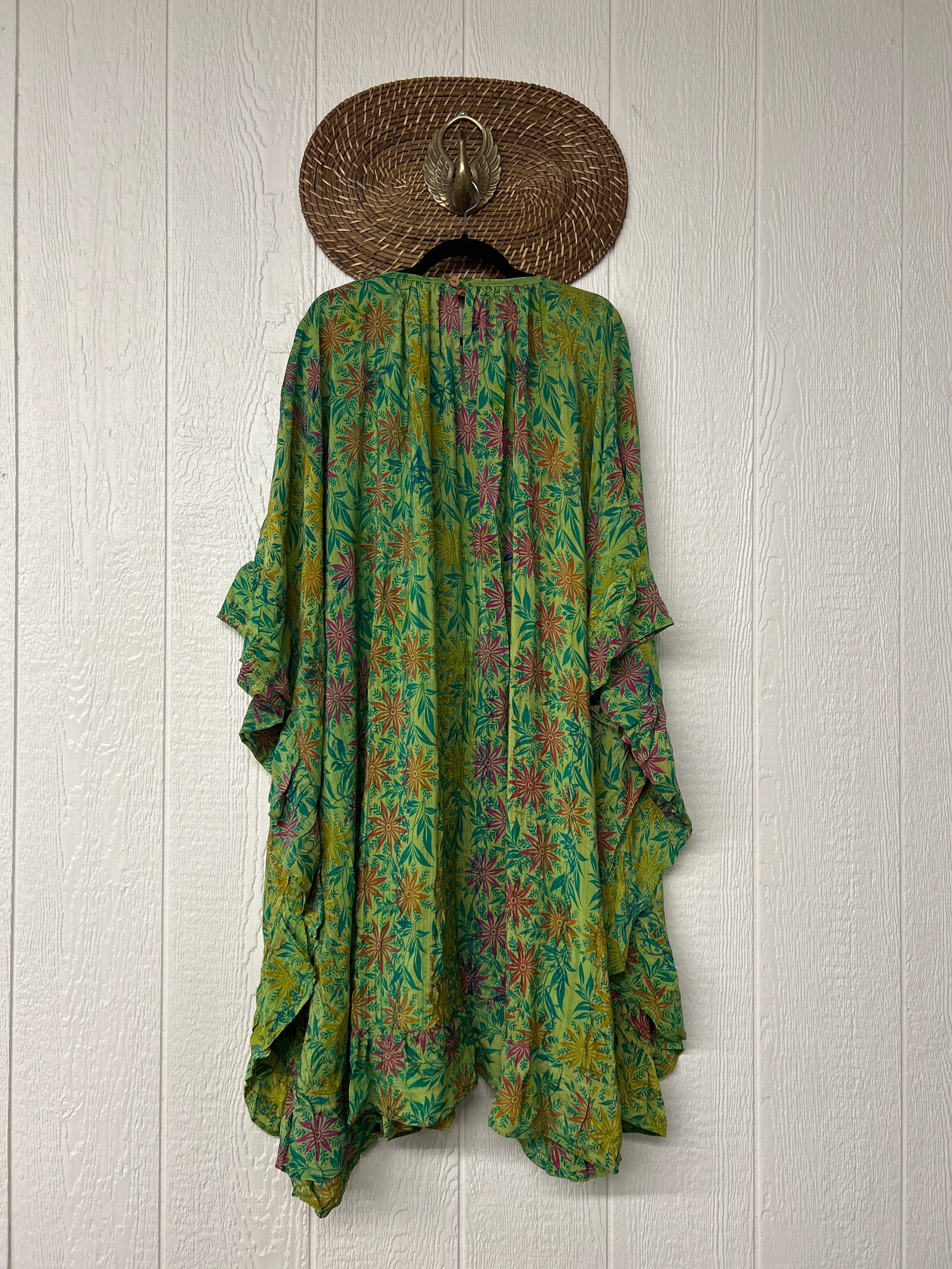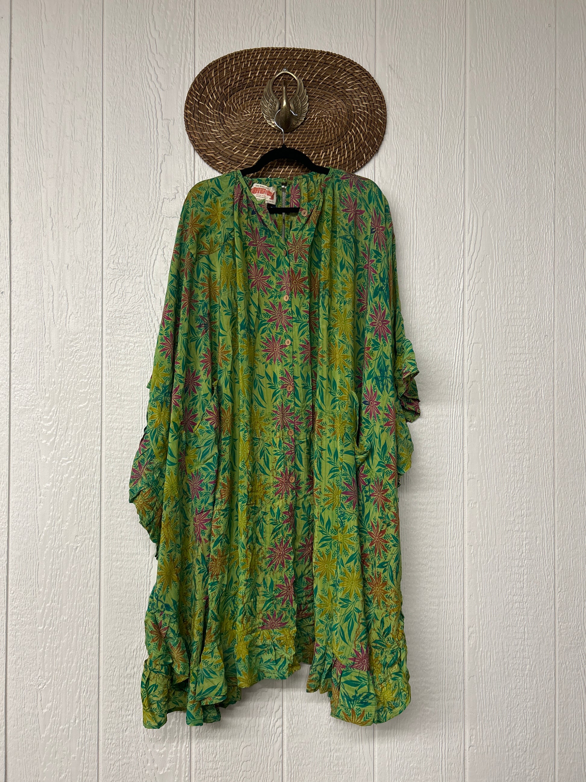 This dreamy muu is crafted from our ultra lux vintage crepe sari and features a button down placket and slouchy exterior pockets. Ruffles around the hem make this the ultimate rockstar layer that you can wear closed as a muu or open as a kimono!!