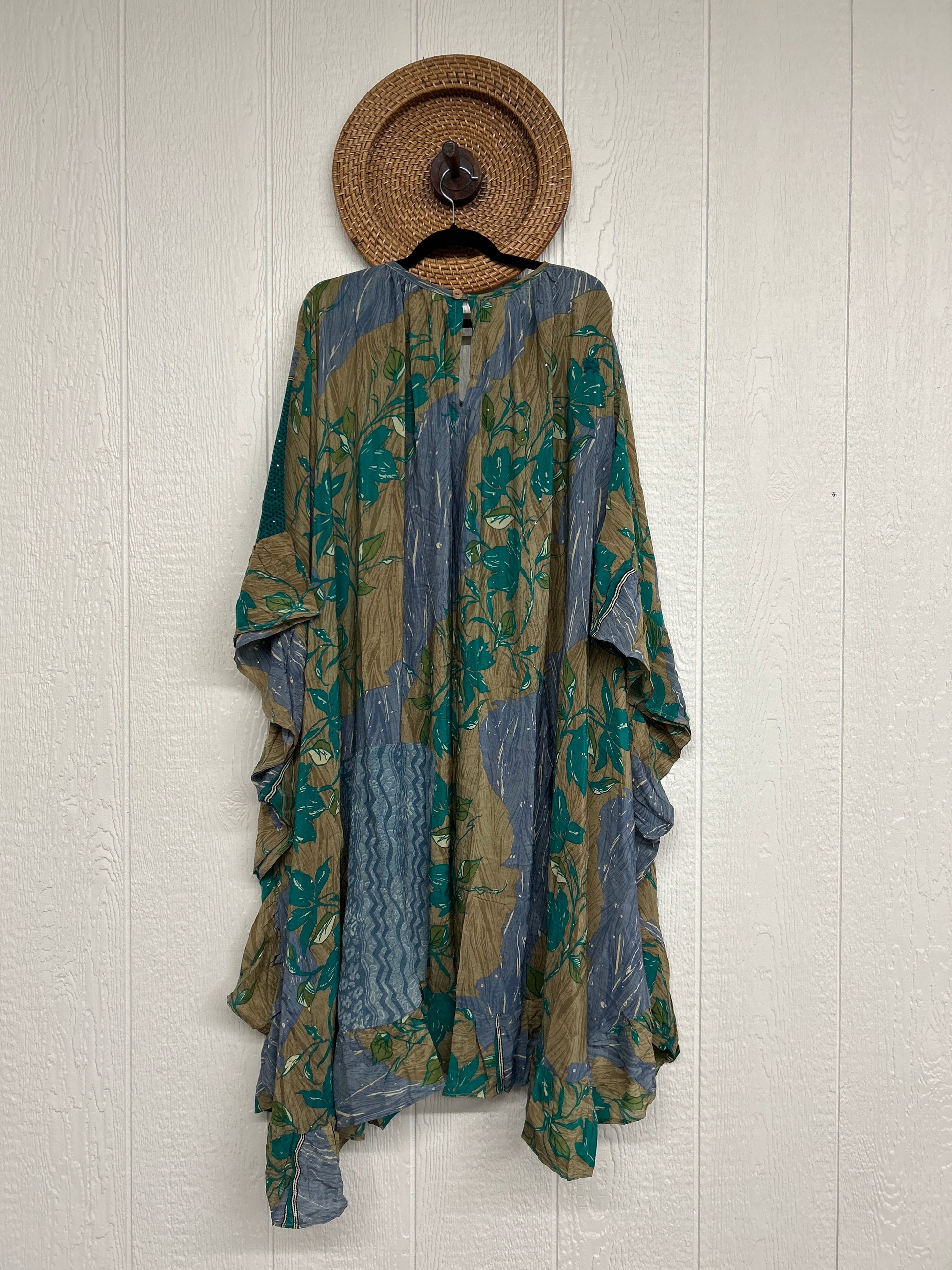 Fabrics may have small threads or holes in the layers. Color inconsistency or small stains may be present. The saris are sewn together and extend the life of each design. Imperfections should be celebrated.