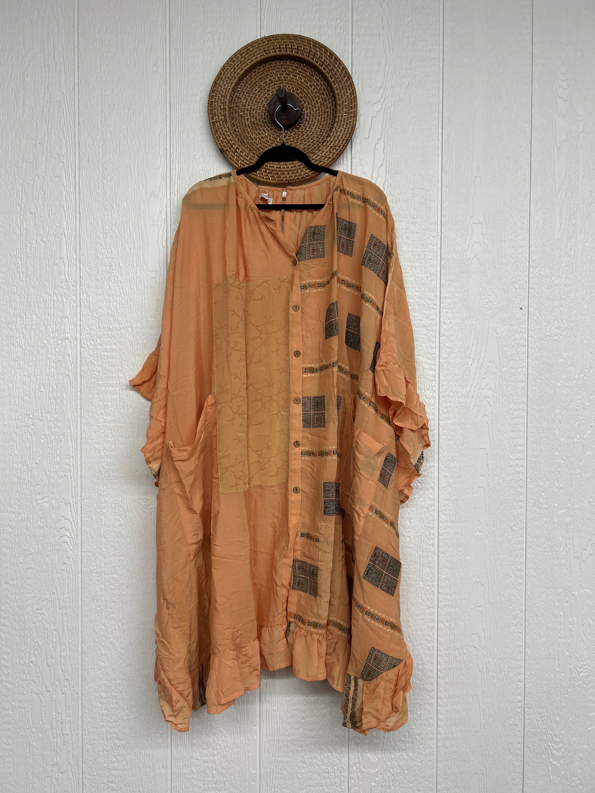 This dreamy muu is crafted from our ultra lux vintage crepe sari and features a button down placket and slouchy exterior pockets. Ruffles around the hem make this the ultimate rockstar layer that you can wear closed as a muu or open as a kimono!!