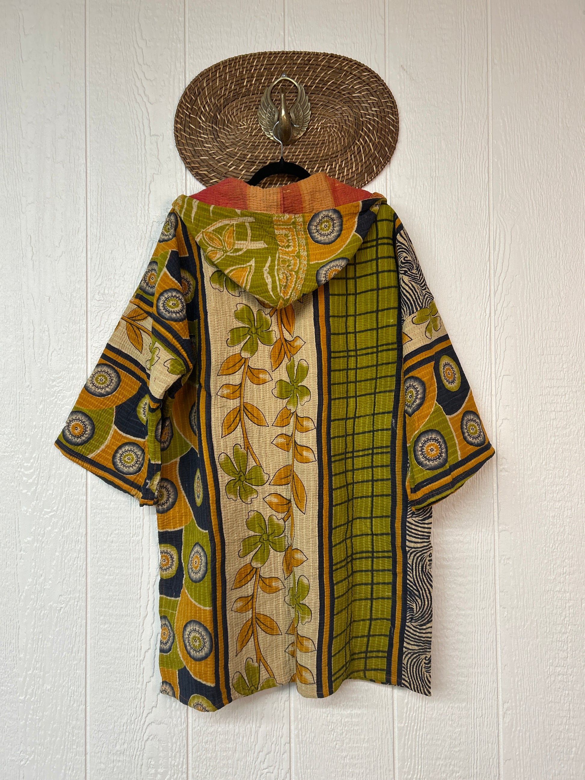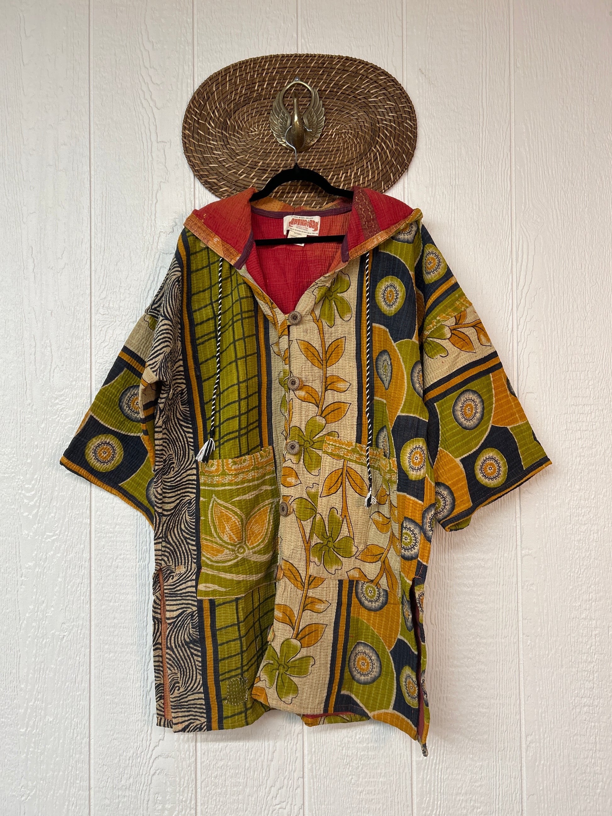 Cozy up in our Half Moon Shacket! Crafted from our ultra lux fine kantha stitched vintage cotton sari, the Half Moon Shacket features a hood, Button-down placket, deep front pockets and bell sleeves.