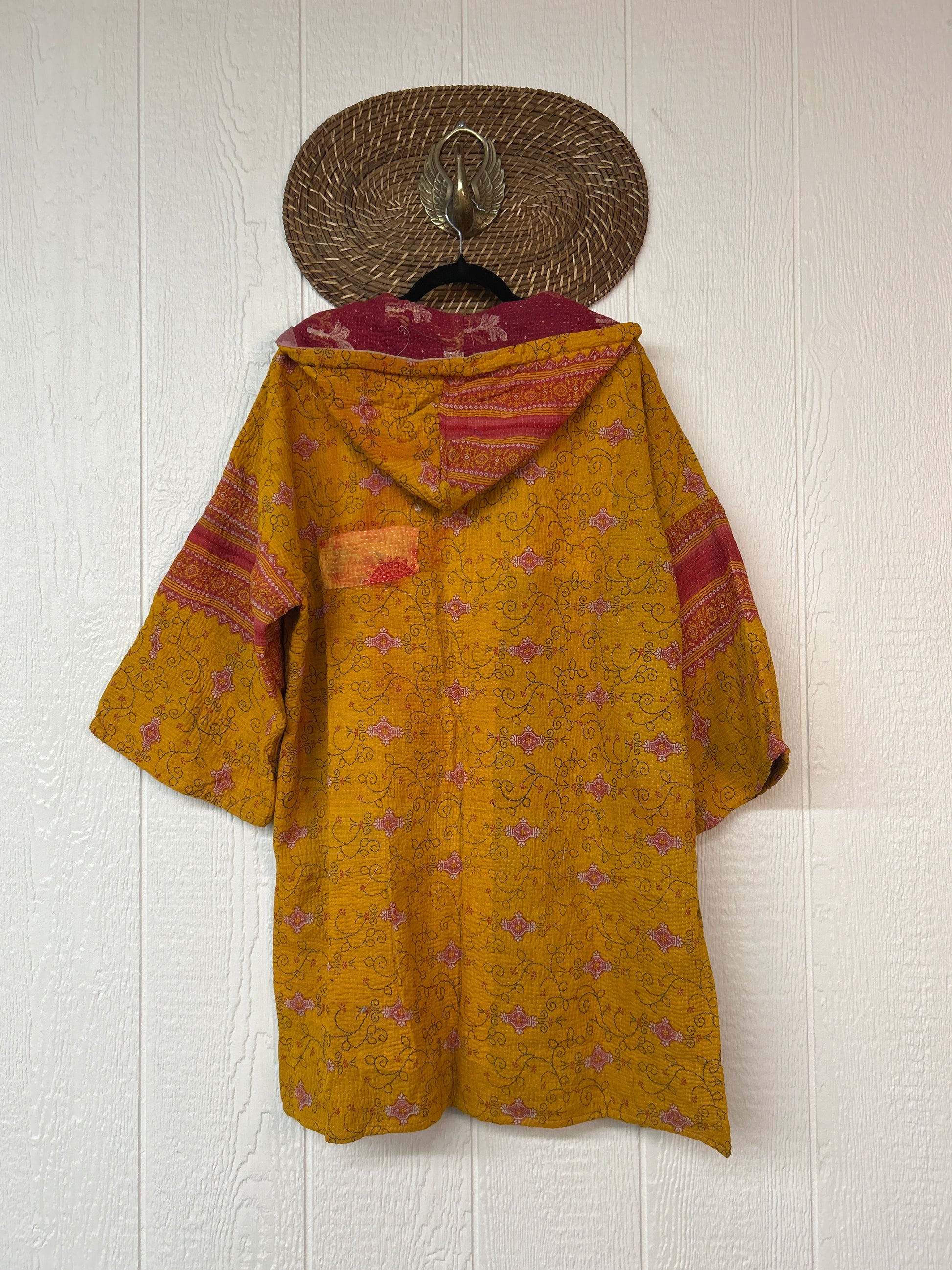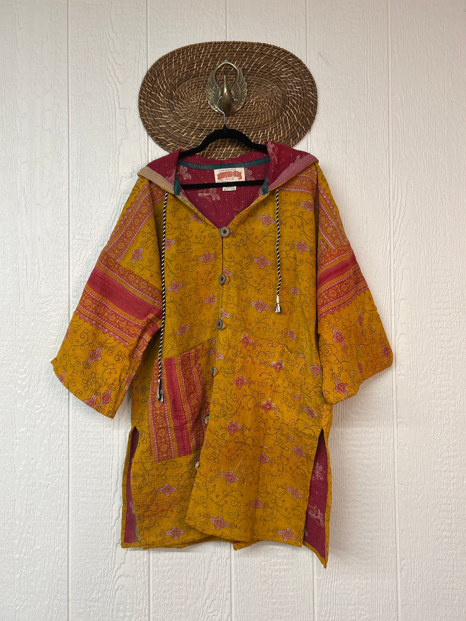 Cozy up in our Half Moon Shacket! Crafted from our ultra lux fine kantha stitched vintage cotton sari, the Half Moon Shacket features a hood, Button-down placket, deep front pockets and bell sleeves.
