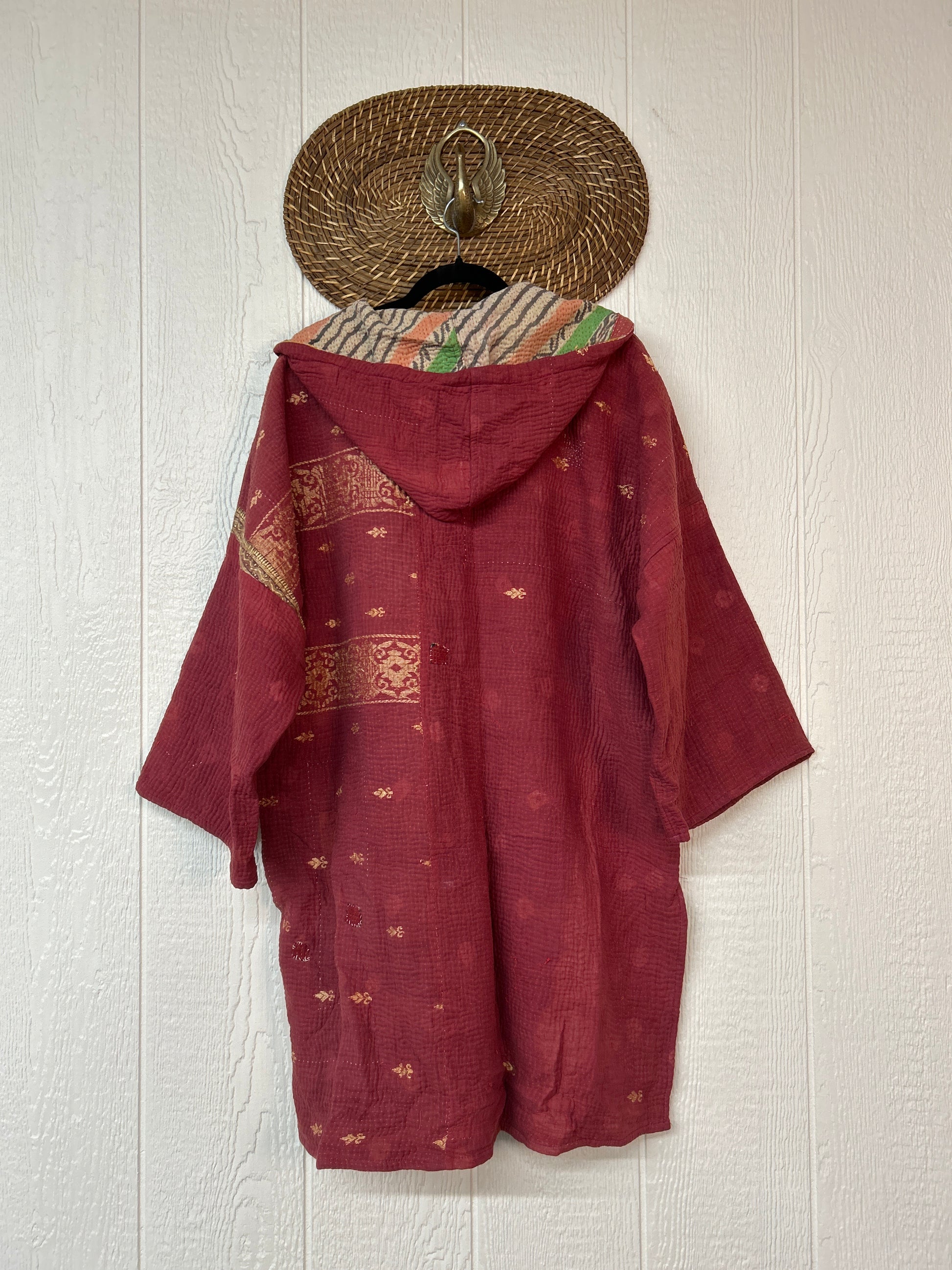 Cozy up in our Half Moon Shacket! Crafted from our ultra lux fine kantha stitched vintage cotton sari, the Half Moon Shacket features a hood, Button-down placket, deep front pockets and bell sleeves.