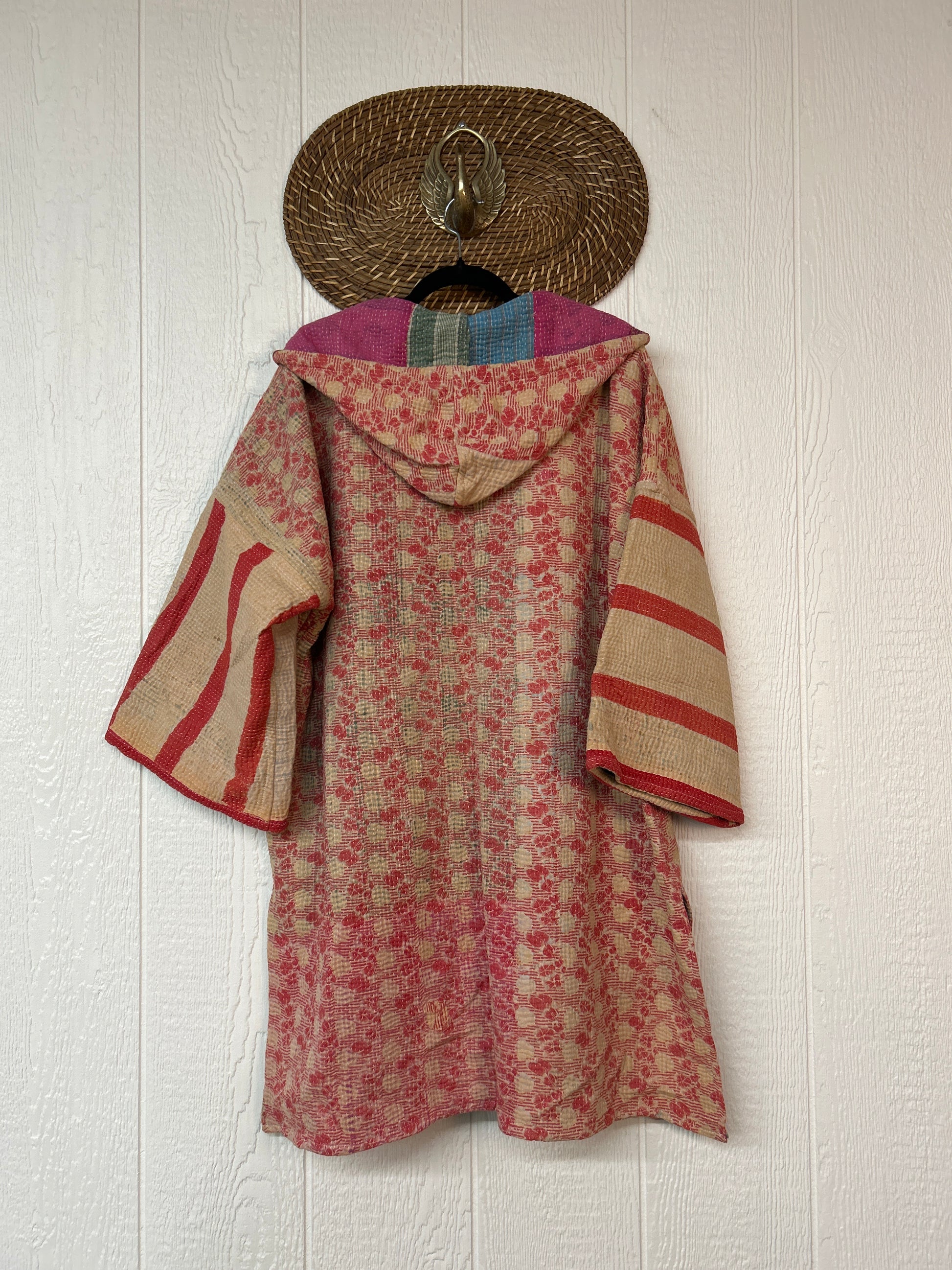 Cozy up in our Half Moon Shacket! Crafted from our ultra lux fine kantha stitched vintage cotton sari, the Half Moon Shacket features a hood, Button-down placket, deep front pockets and bell sleeves.