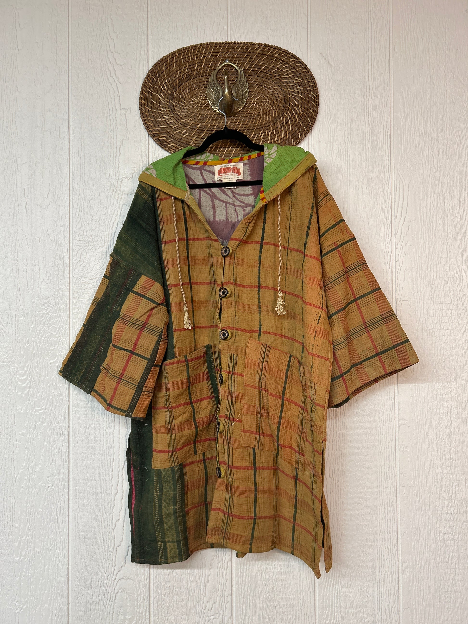 Cozy up in our Half Moon Shacket! Crafted from our ultra lux fine kantha stitched vintage cotton sari, the Half Moon Shacket features a hood, Button-down placket, deep front pockets and bell sleeves.